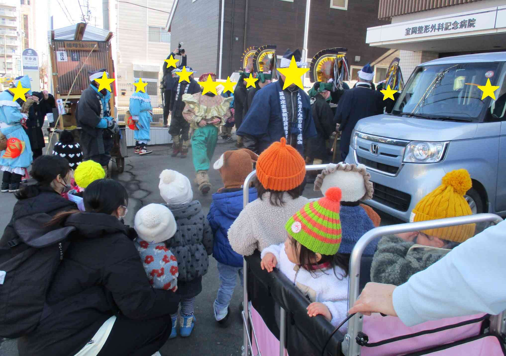 朝の会の後はお散歩に出掛け、近隣の病院前で行われていたえんぶりの踊りやお囃子の見学を楽しんできました。