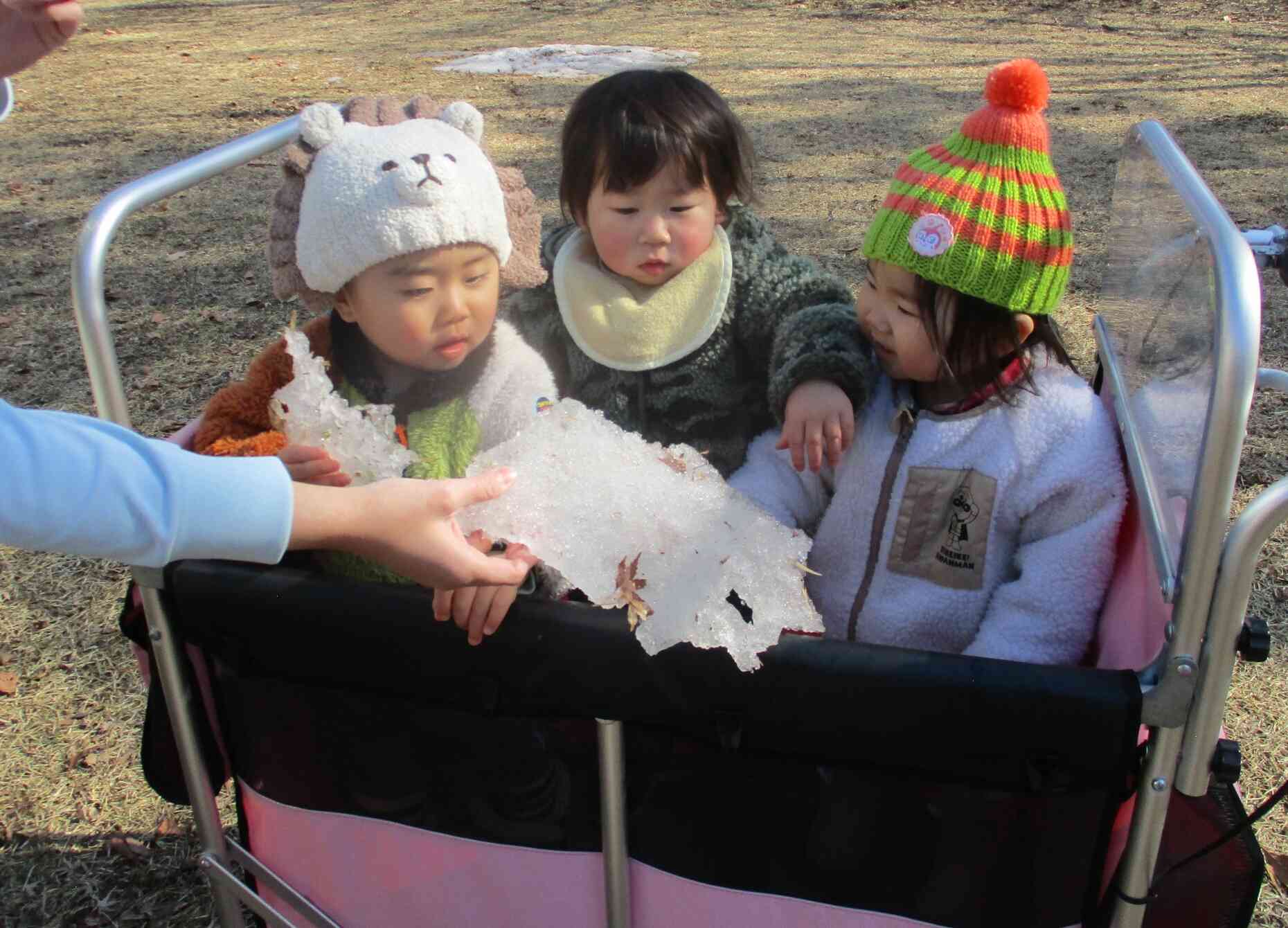 散歩車に乗っていた子ども達は公園内に落ちていた大きな氷を見つけると「あっ!」と興味津々な様子。