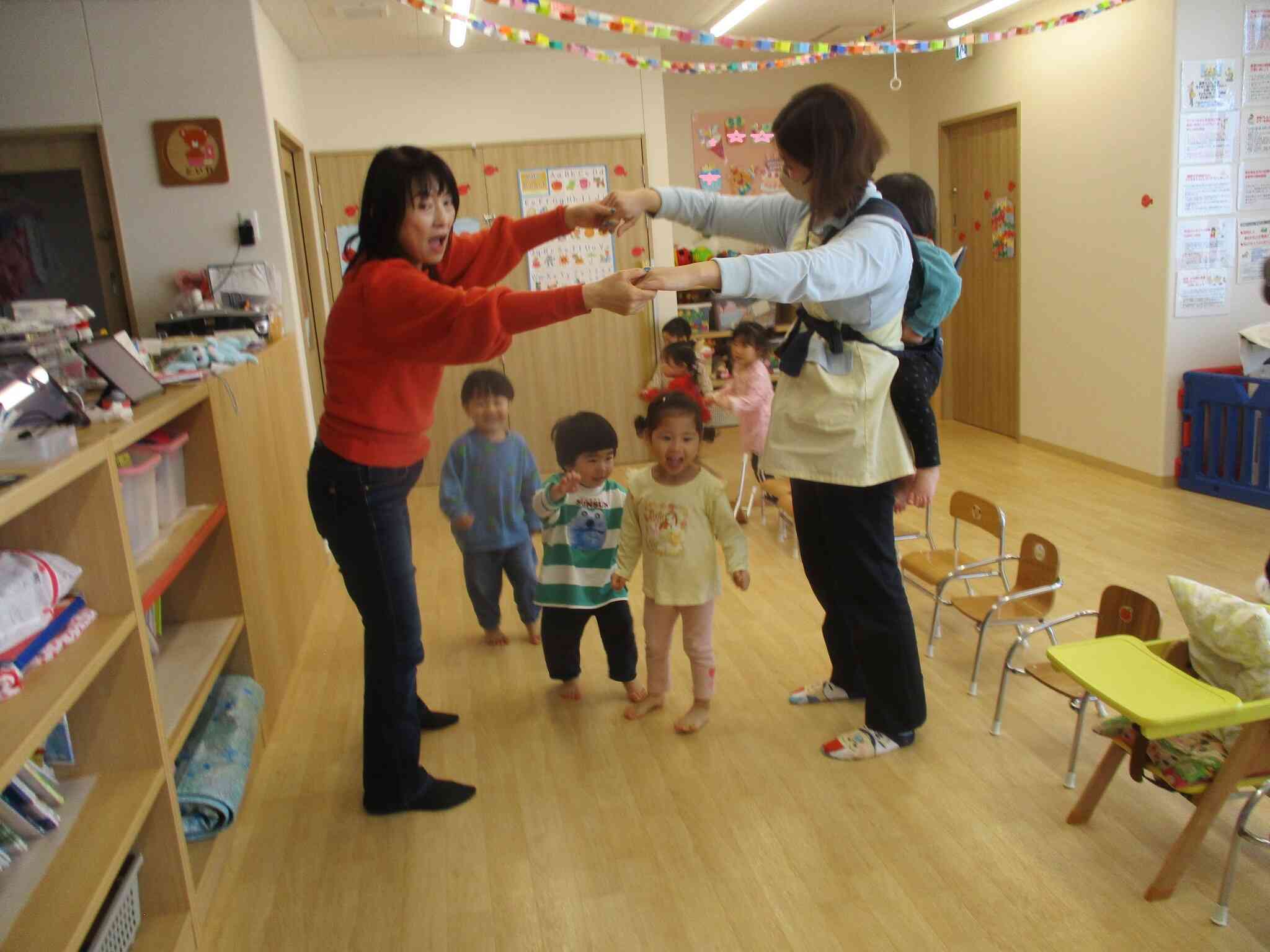「ロンドン橋」では、ぐるぐるとお部屋を何周も回っていつ捕まるだろうかとハラハラドキドキしながらちょっとしたスリルを楽しんでいました。