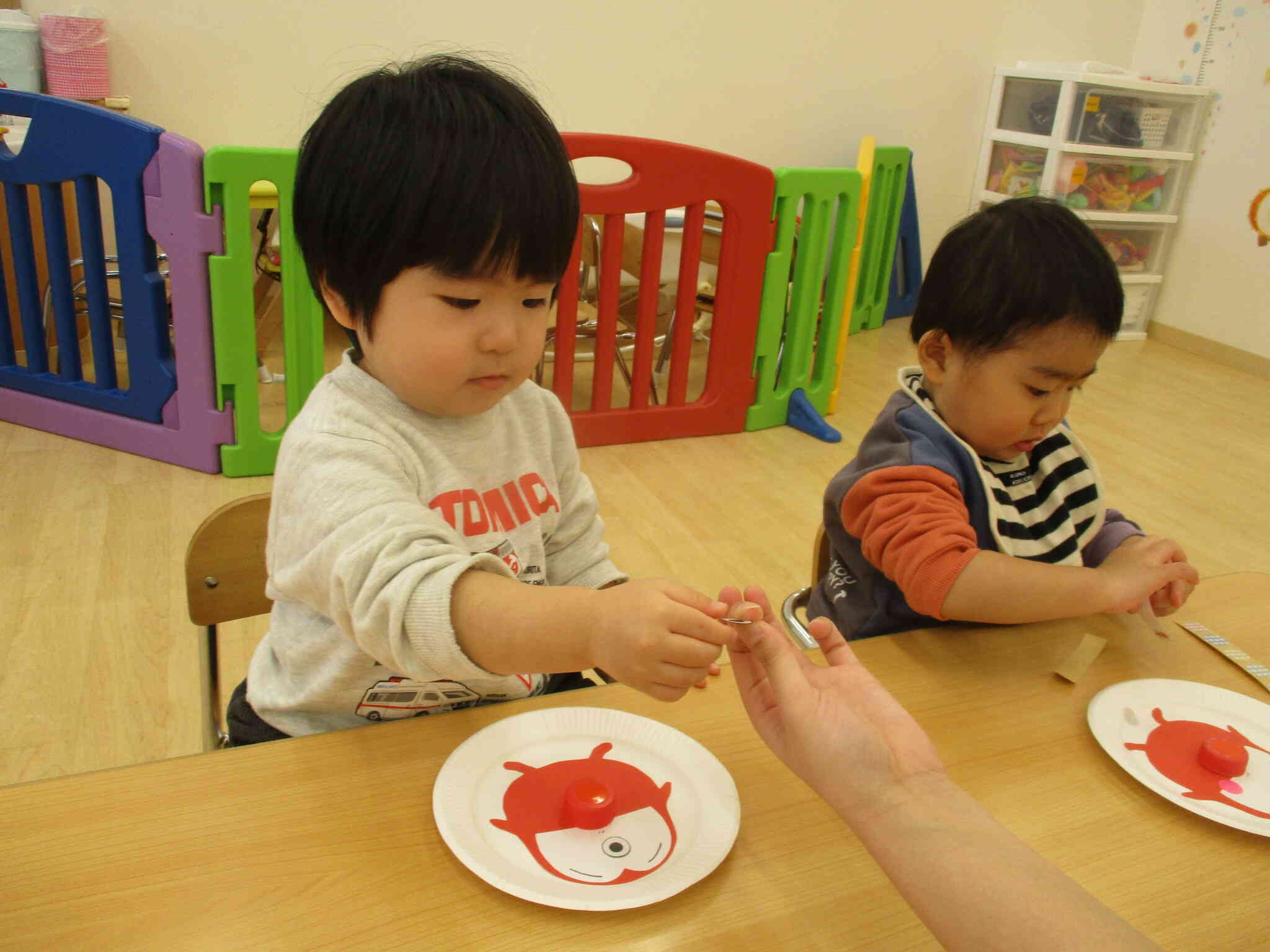 うさぎ組(2歳児)のお友だちも自分たちのの力でコマを完成させようと頑張っていました。