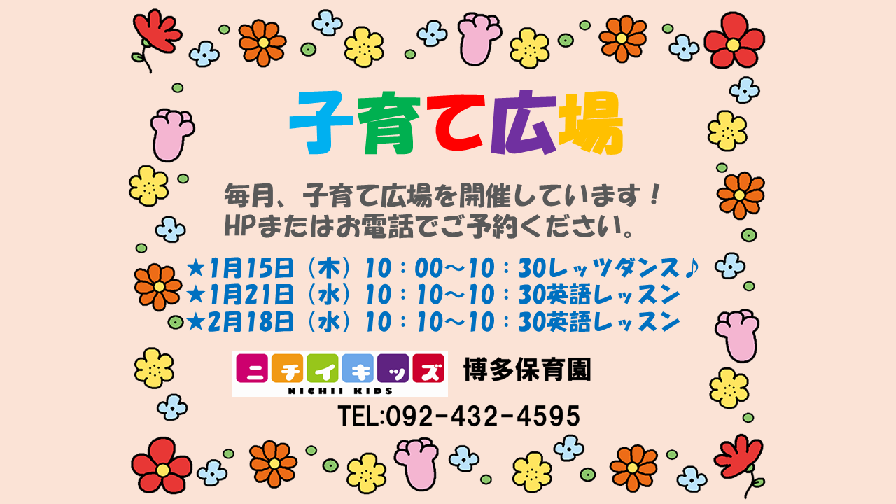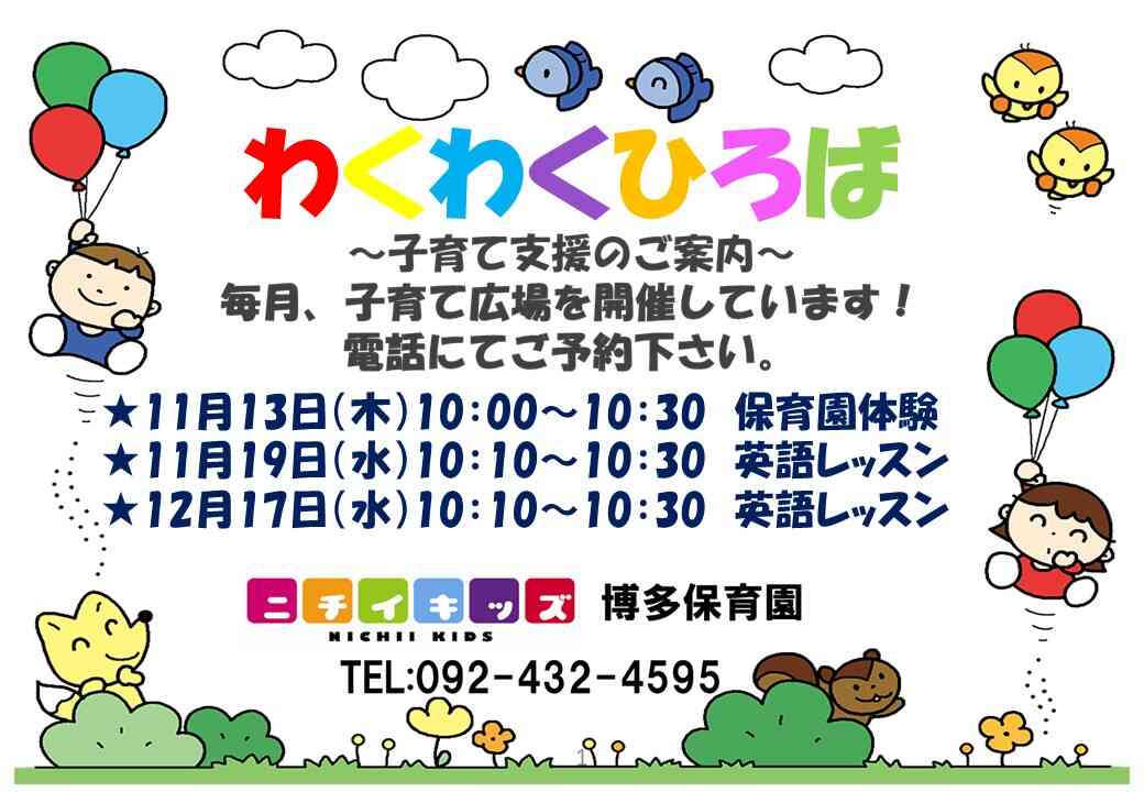 子育てひろばでは、ニチイキッズ博多保育園で行っている「英語レッスン」や季節の製作、食育などの行事に参加していただけます。