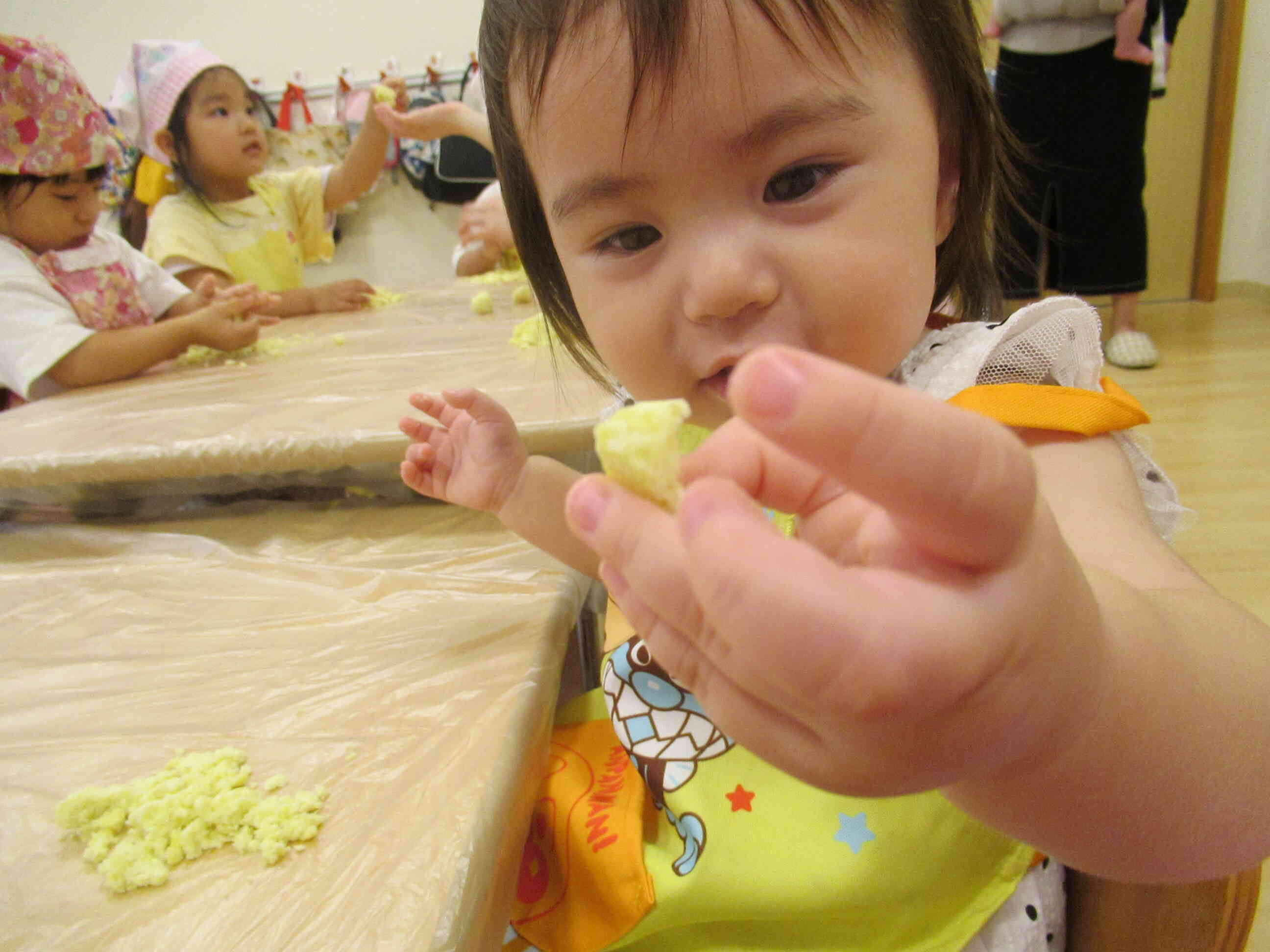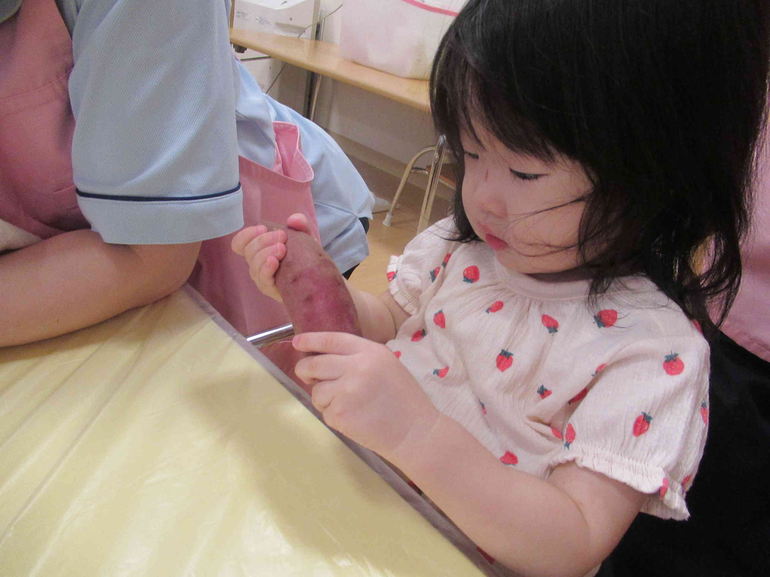 皮をむいて蒸かしたお芋を見せるとさっきとは色も形も匂いも違うお芋に子どもたちも不思議そうな表情です。