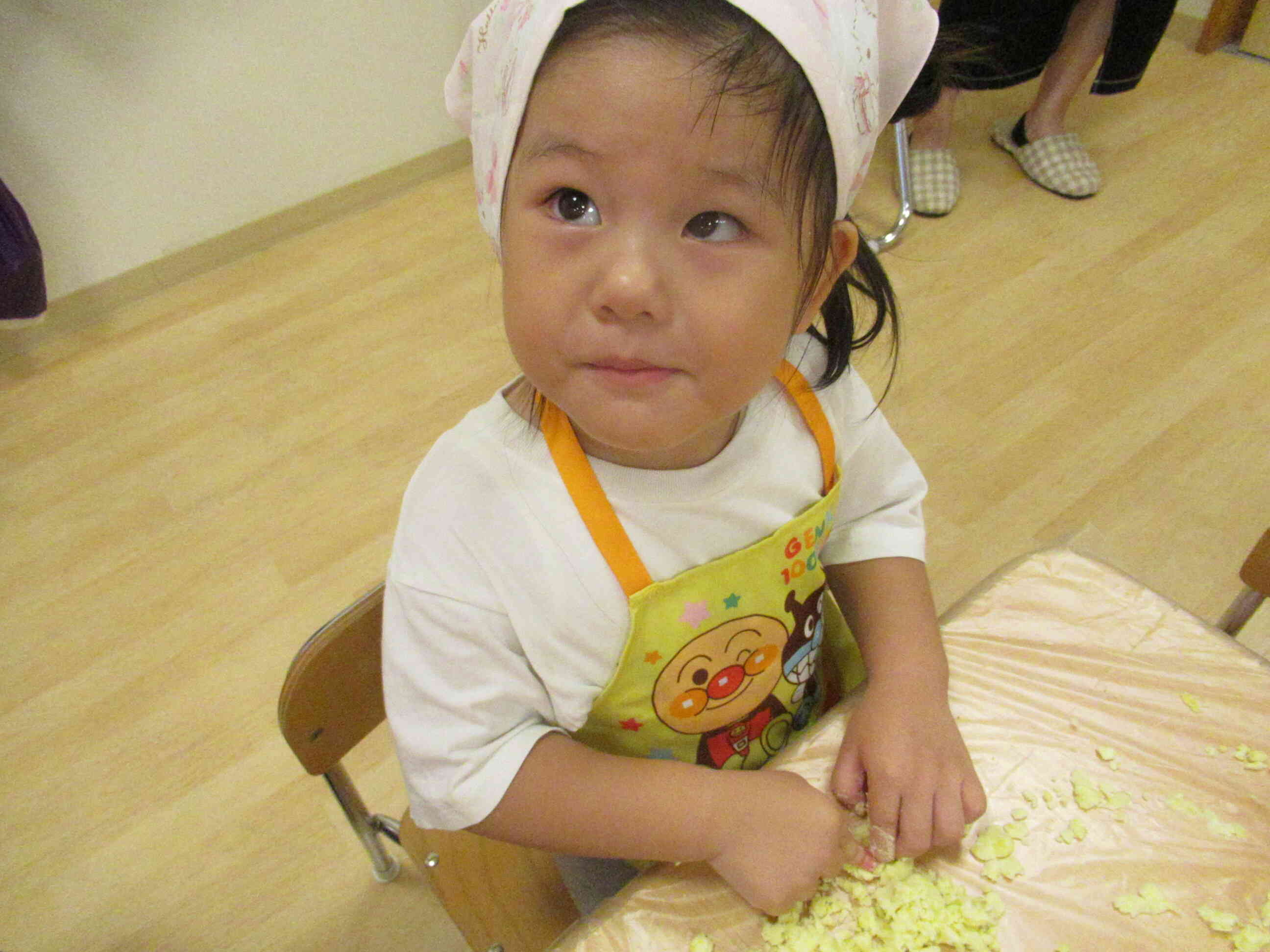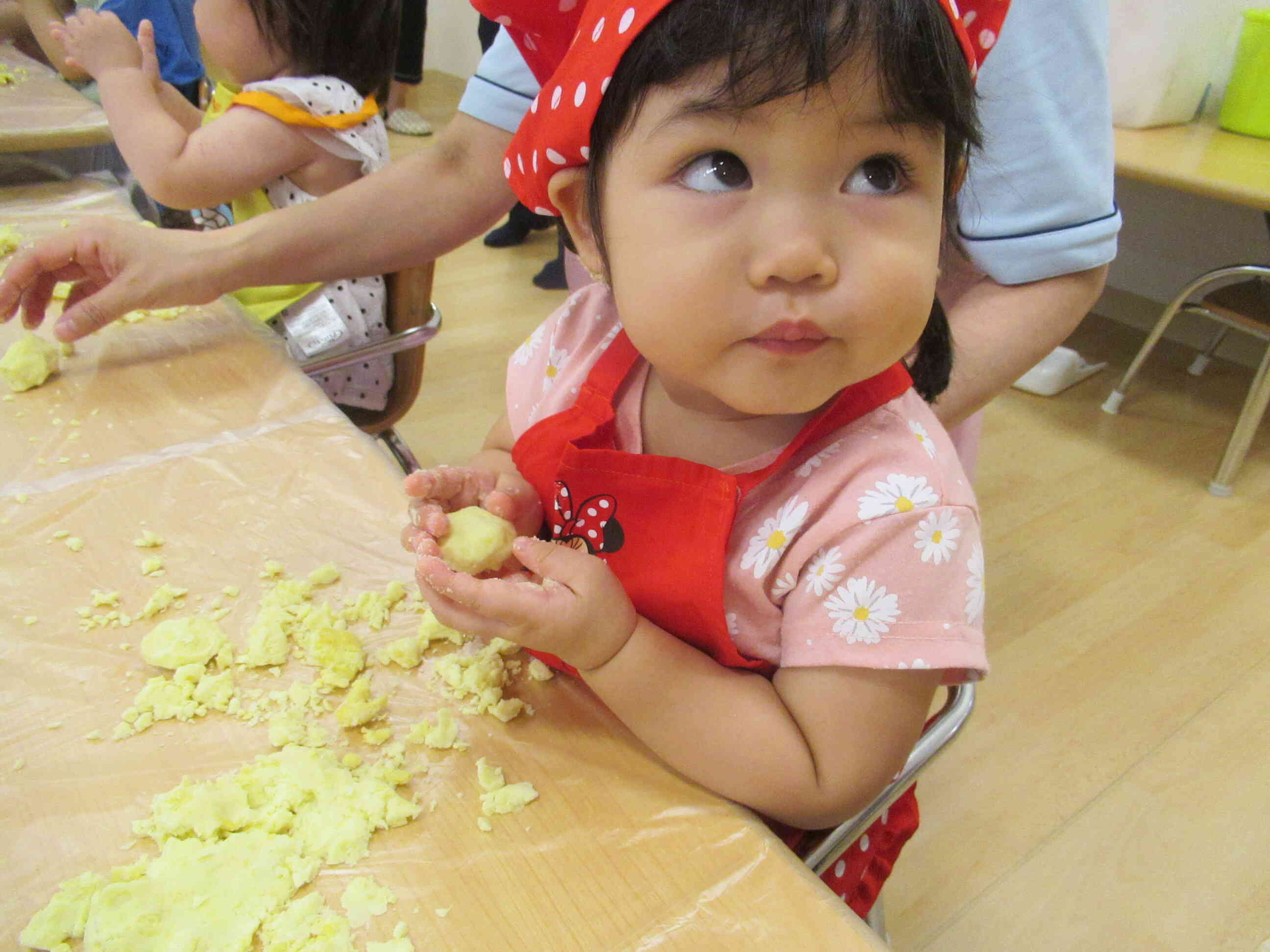 手にお芋を乗せてぎゅっと握ってみたり、一度丸めたお団子を崩してさらさらにしてみたりそれぞれが色々な方法で感触を楽しんでいました。