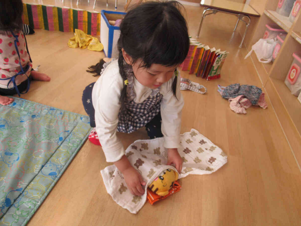 布を上手に畳んでお布団を作ると、ぬいぐるみを寝かせていたお友だち。