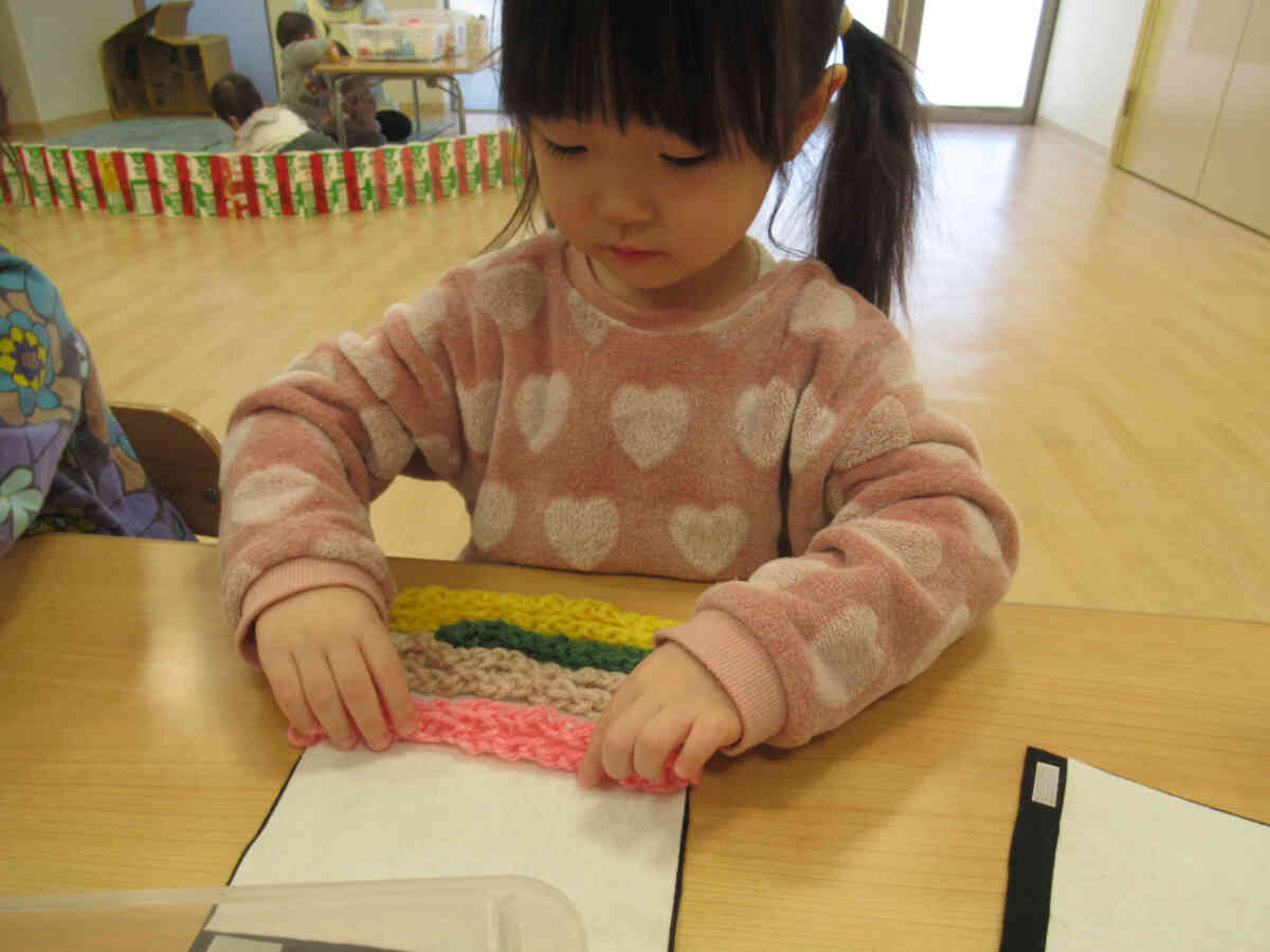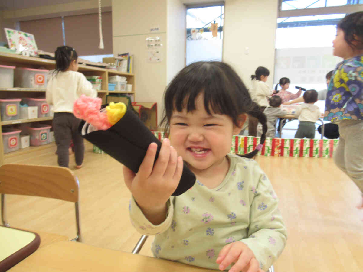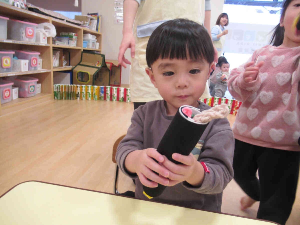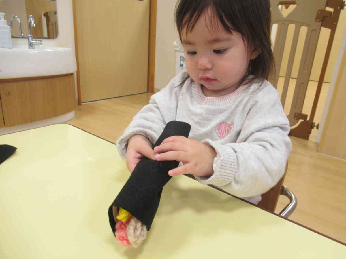 作った恵方巻をおままごとにも加え、おままごと中にも「巻き方教えてあげるね!」と嬉しそうに恵方巻を巻いて遊んでいましたよ♪