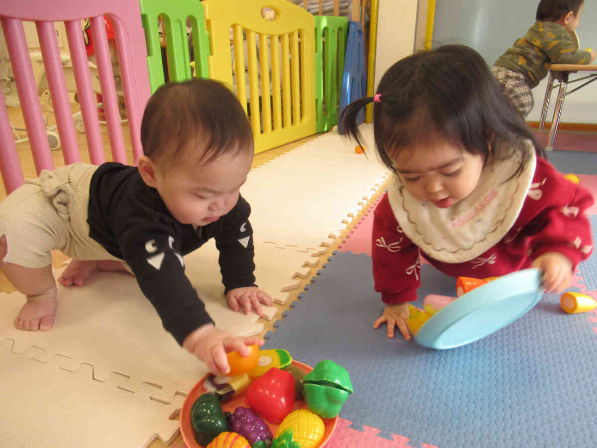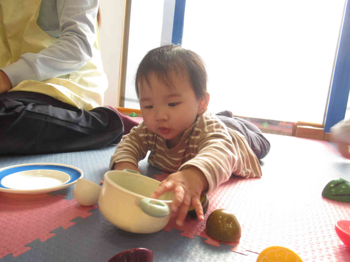 0歳児さんのお部屋ではおままごと遊びを行いました。