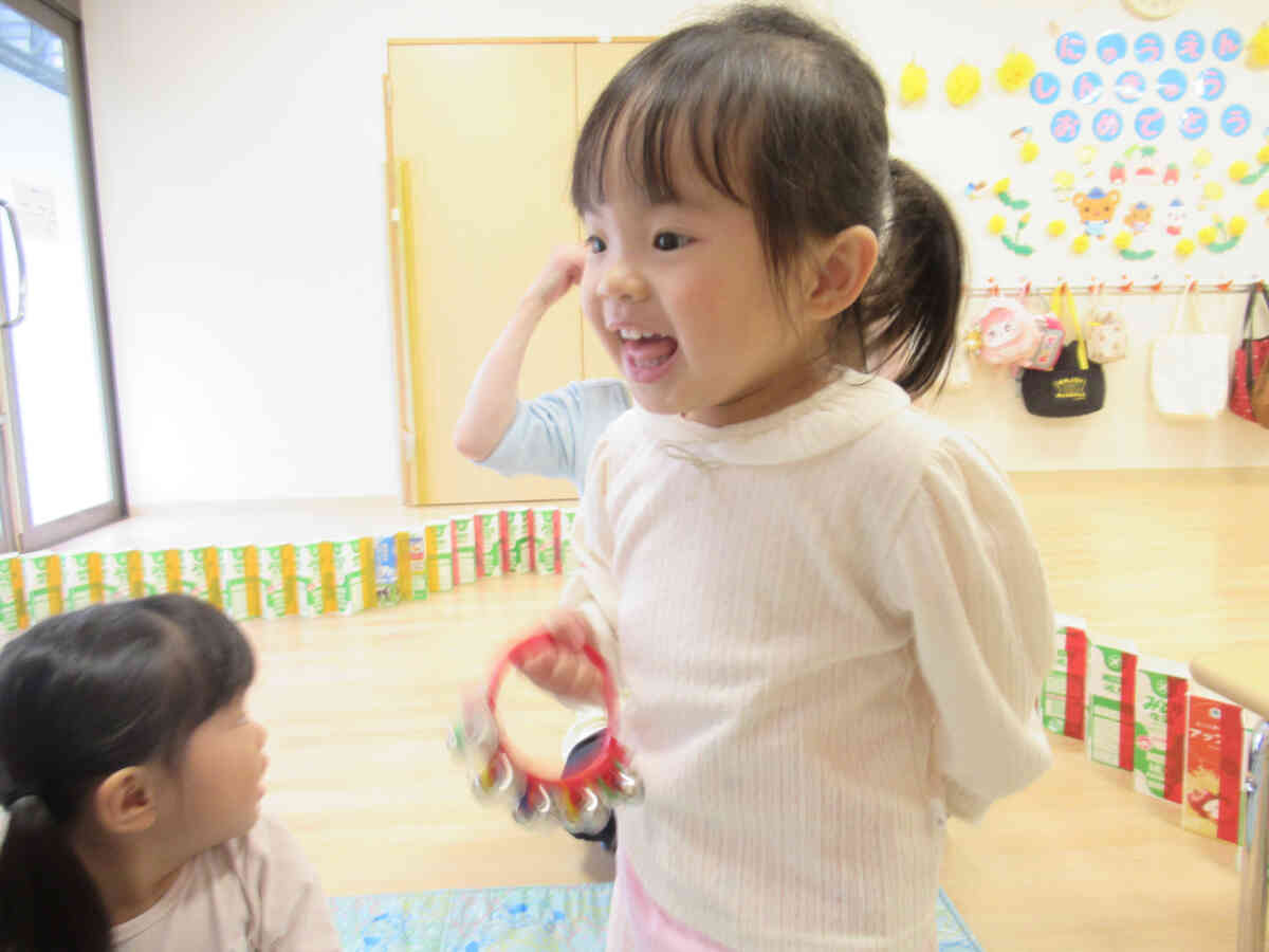 こちらのお友達は鈴がお気に入りだったようで「しあわせなら手をたたこう」をノリノリで歌っておどっていました♪