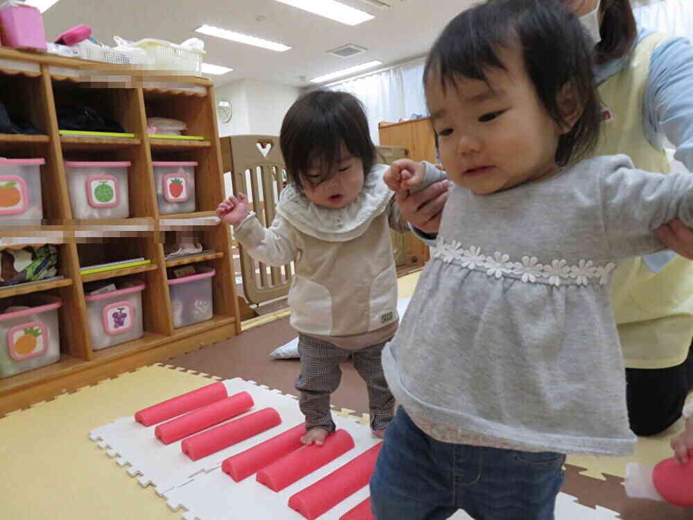 ひよこ組(0歳児クラス)の子ども達は 這い這いだった子が立ち上がろうとしたり、伝い歩きの子が 自足歩行が上手になったりで 大変活発になり動き回っています。自分の行きたいところへ思うように行けることが嬉しいね。