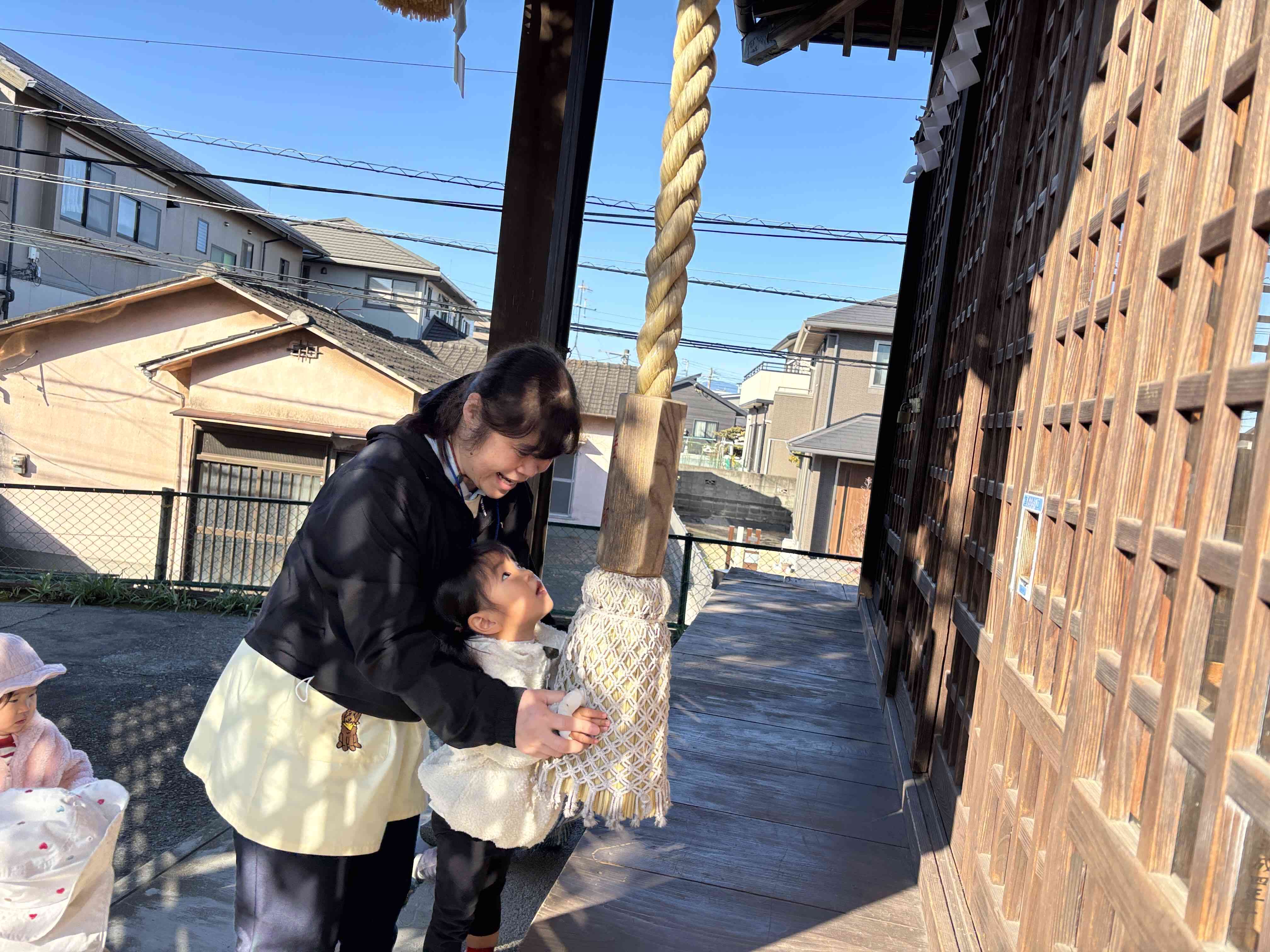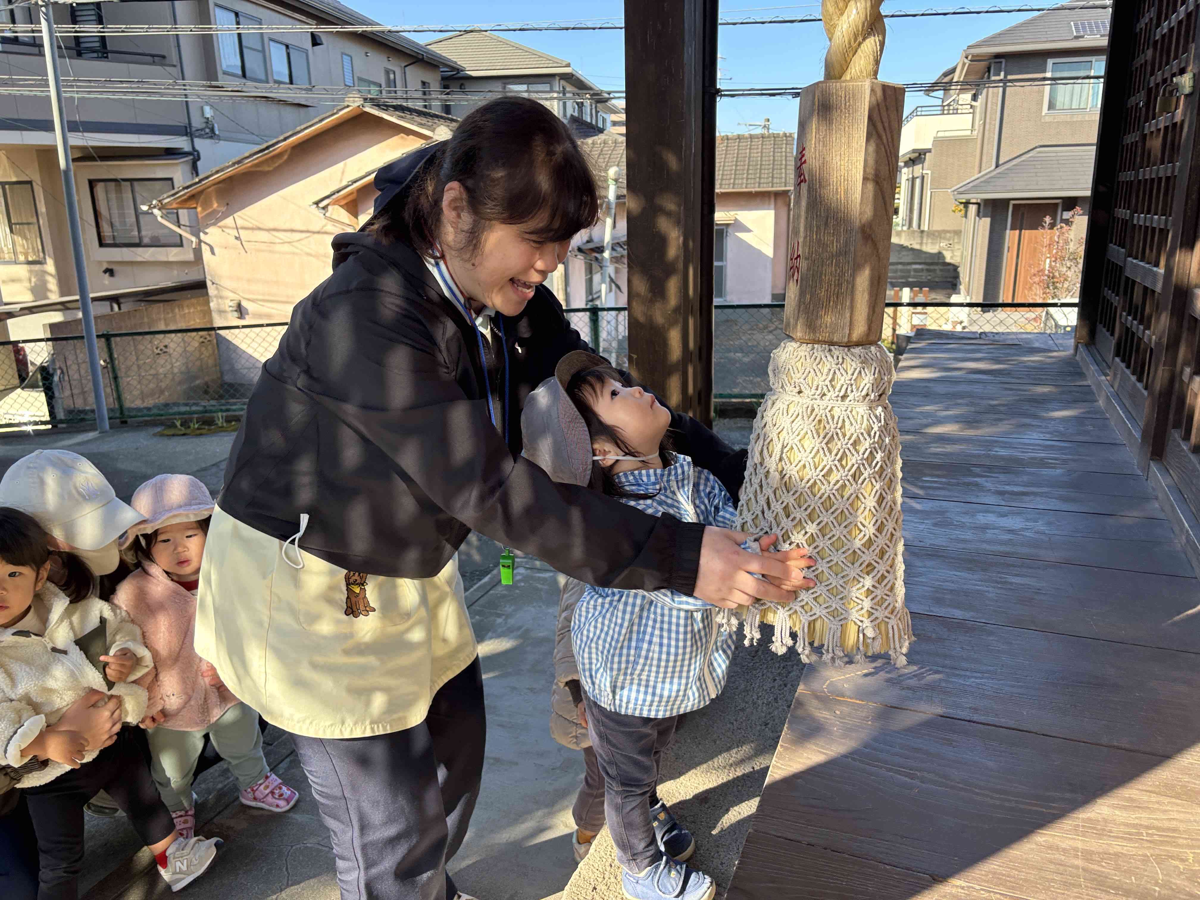 神社に着いてからは、一人ずつ先生と一緒に鐘を鳴らし