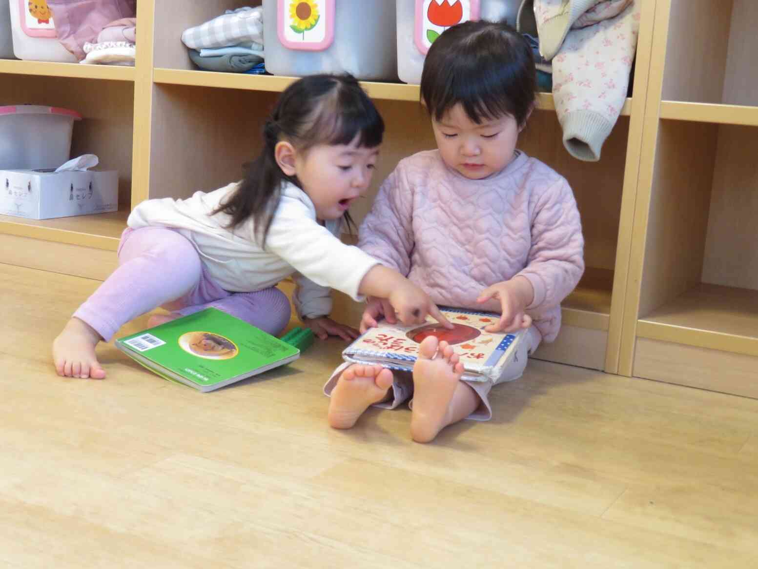 仲良く座り、大好きな絵本タイムを楽しんでいました。