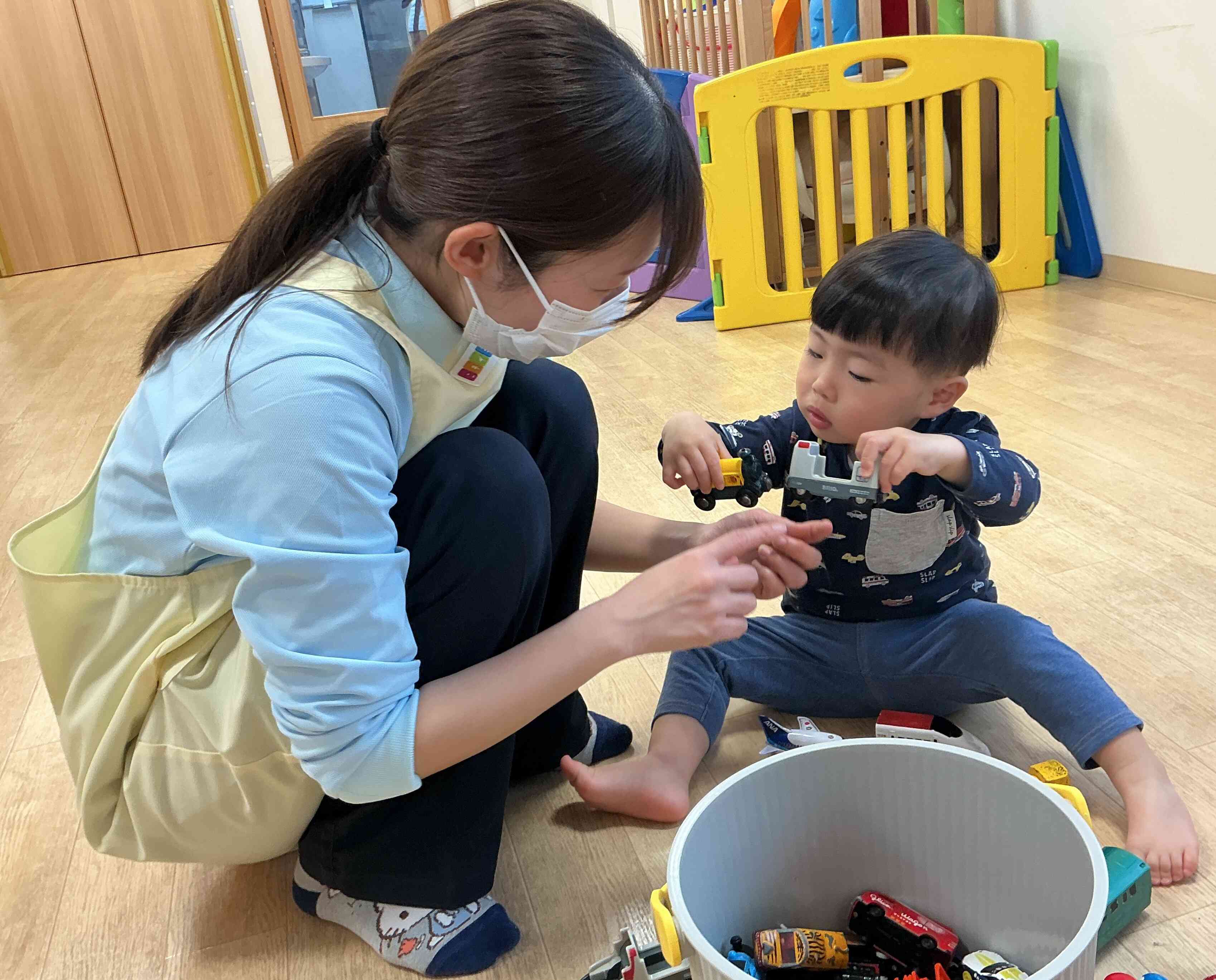 先生と一緒に電車遊びを楽しんでいます。