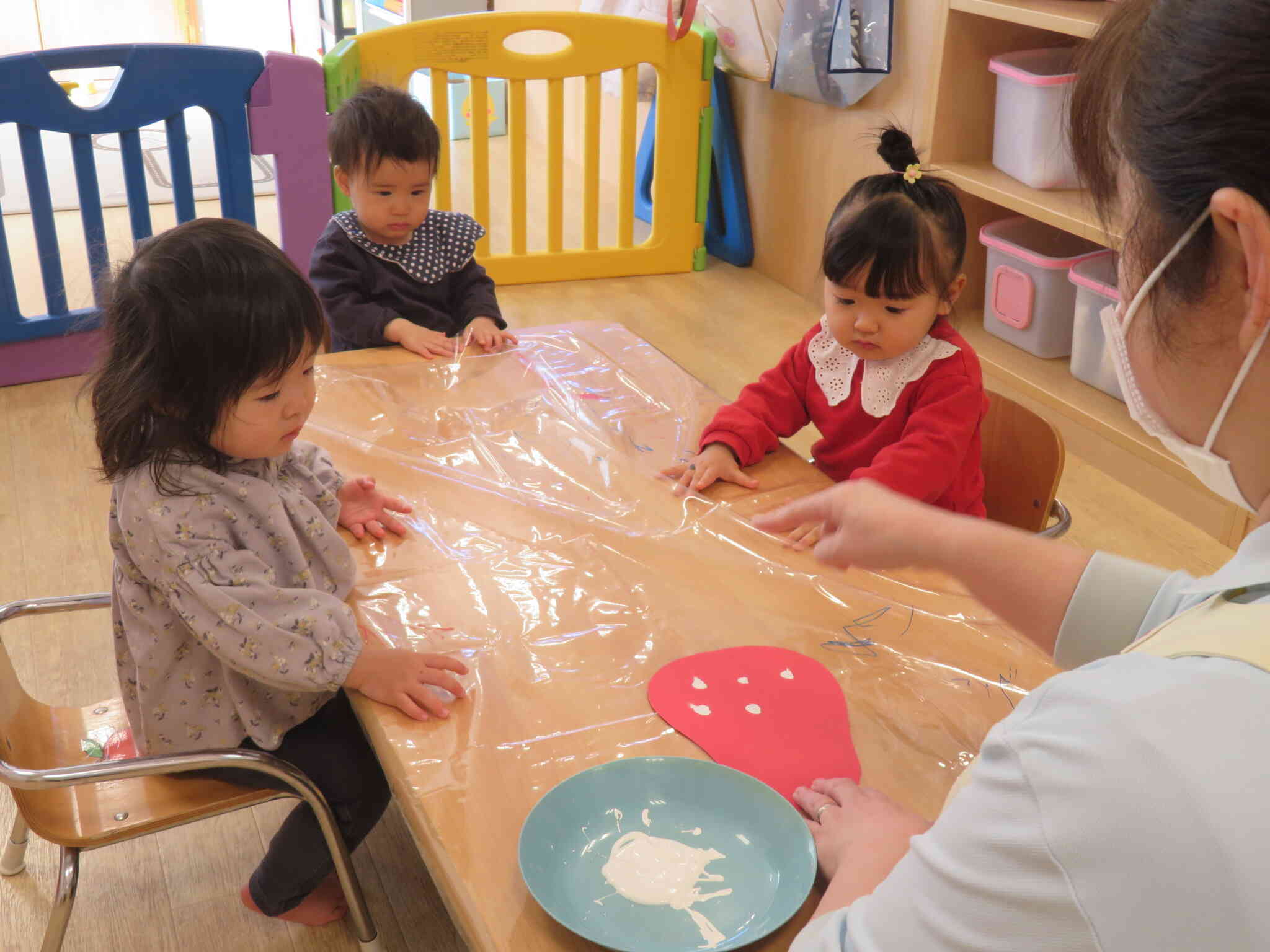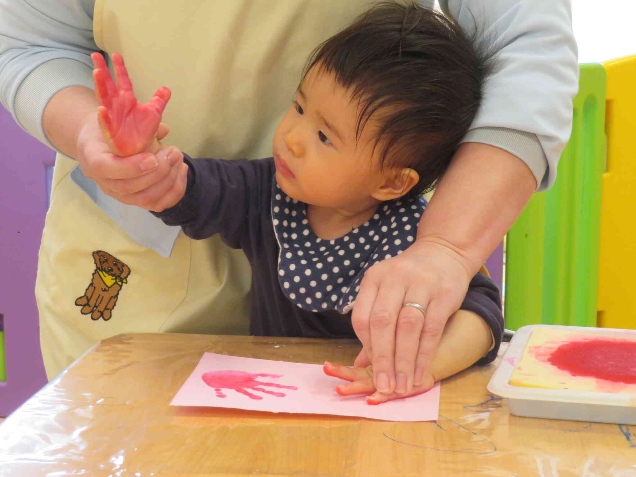 手に付いた絵の具を興味津々で眺めたり、、