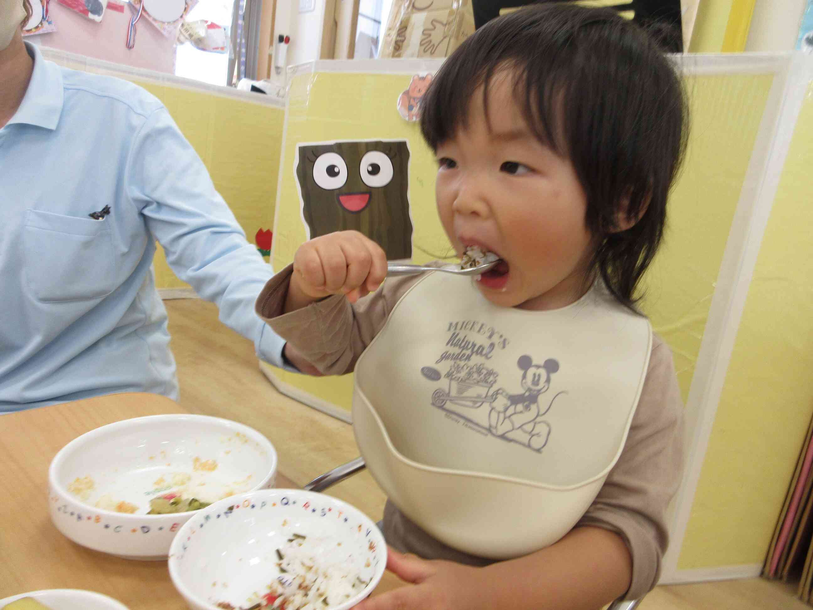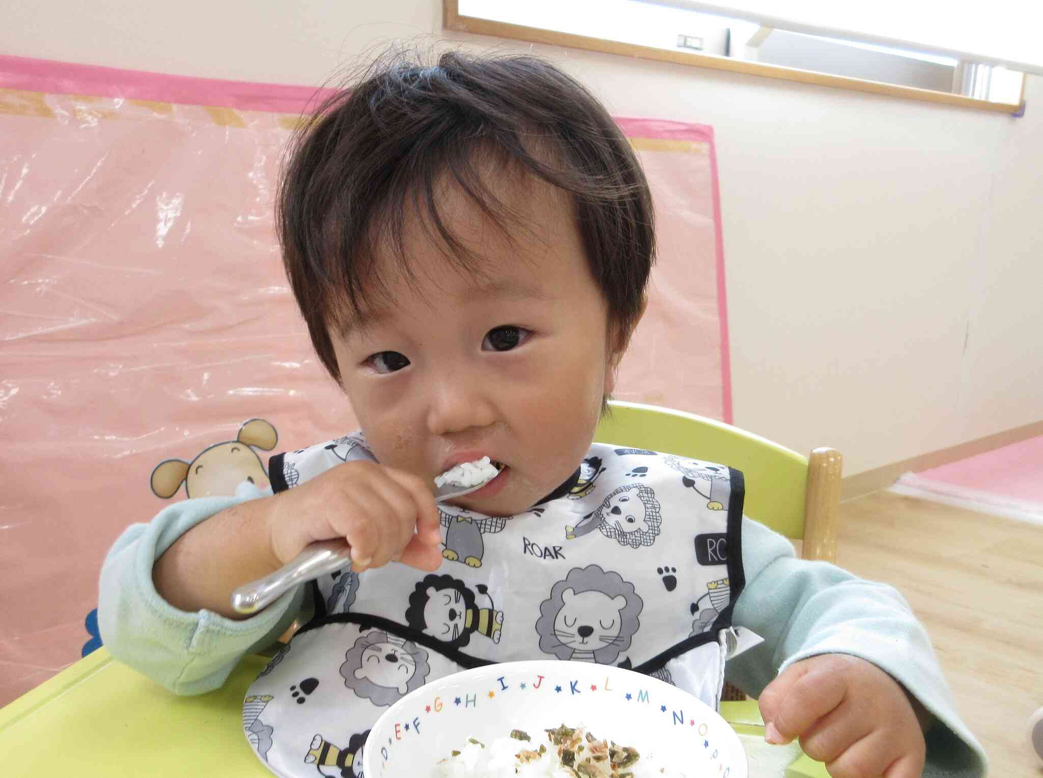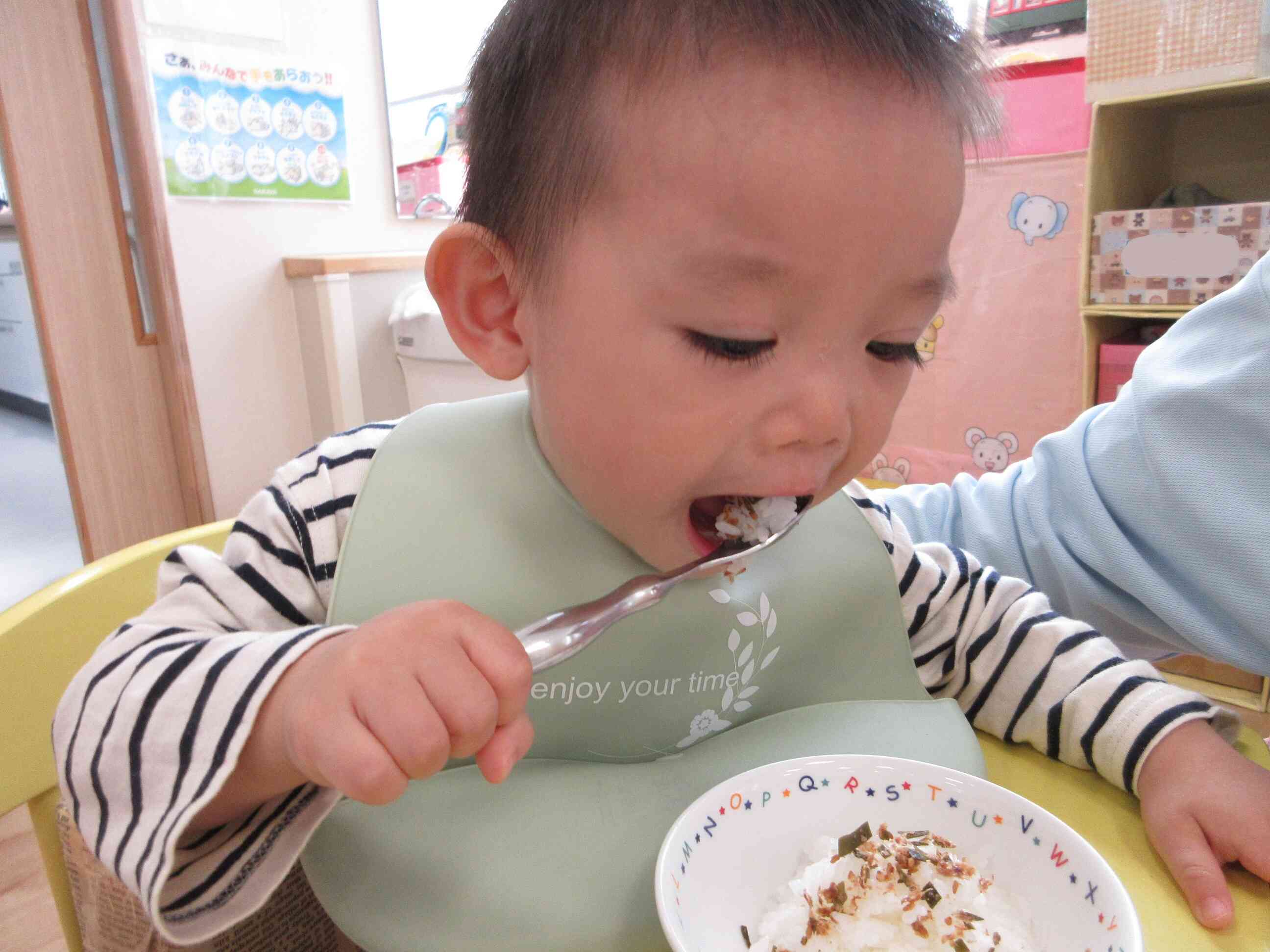 ふりかけが美味しくて、いつも以上にご飯がとまらない様子でした♪上手にスプーンを使って食べています。