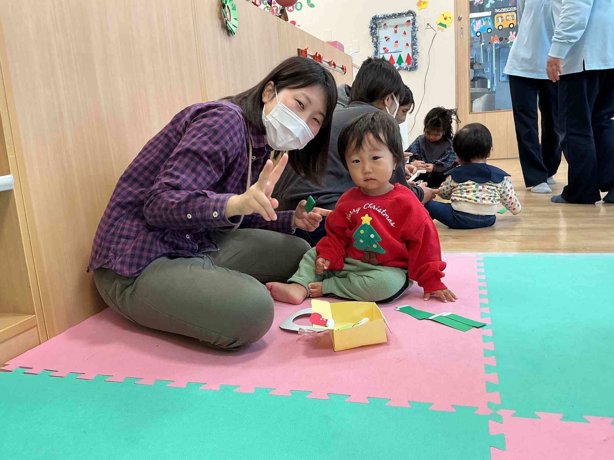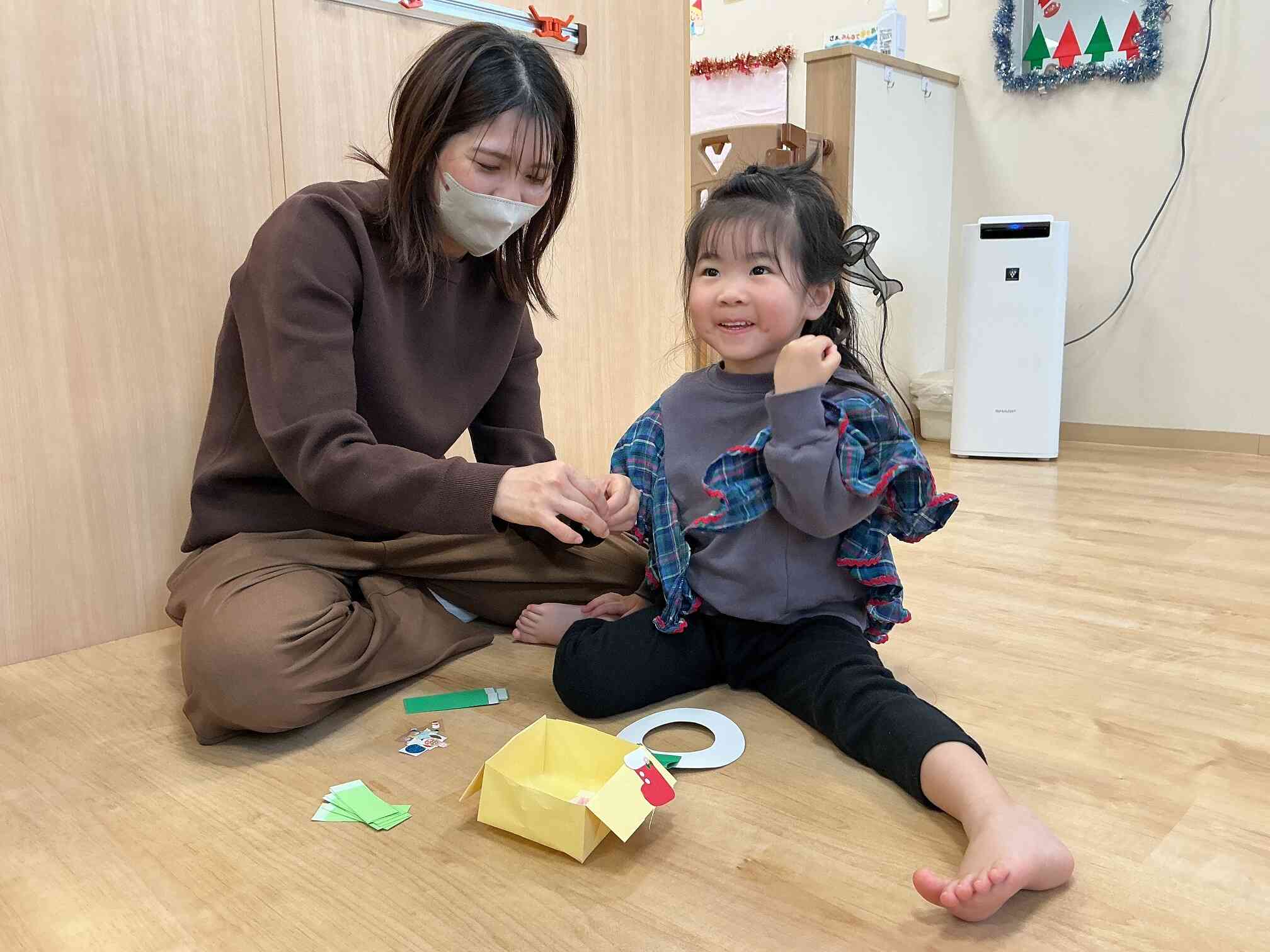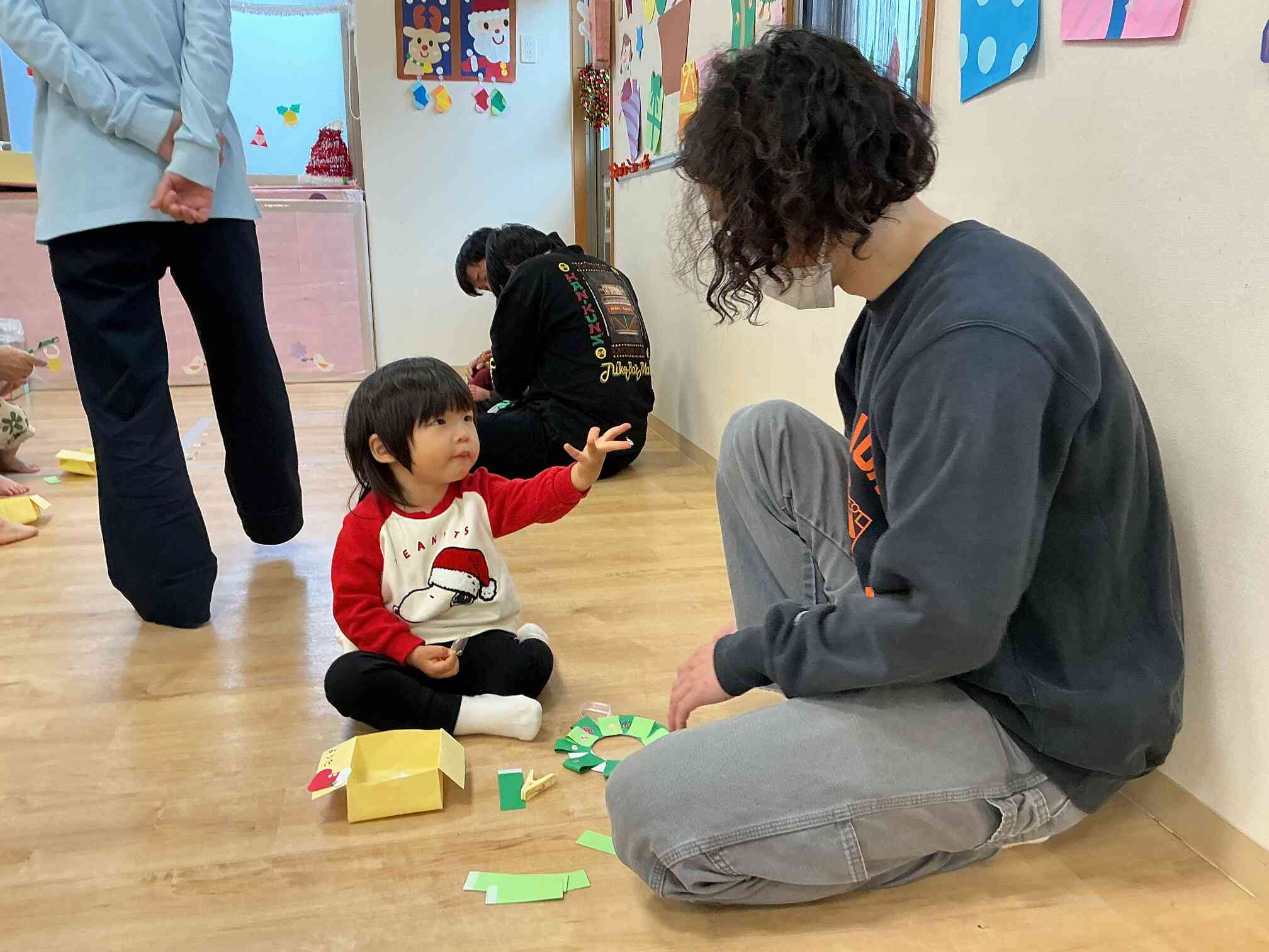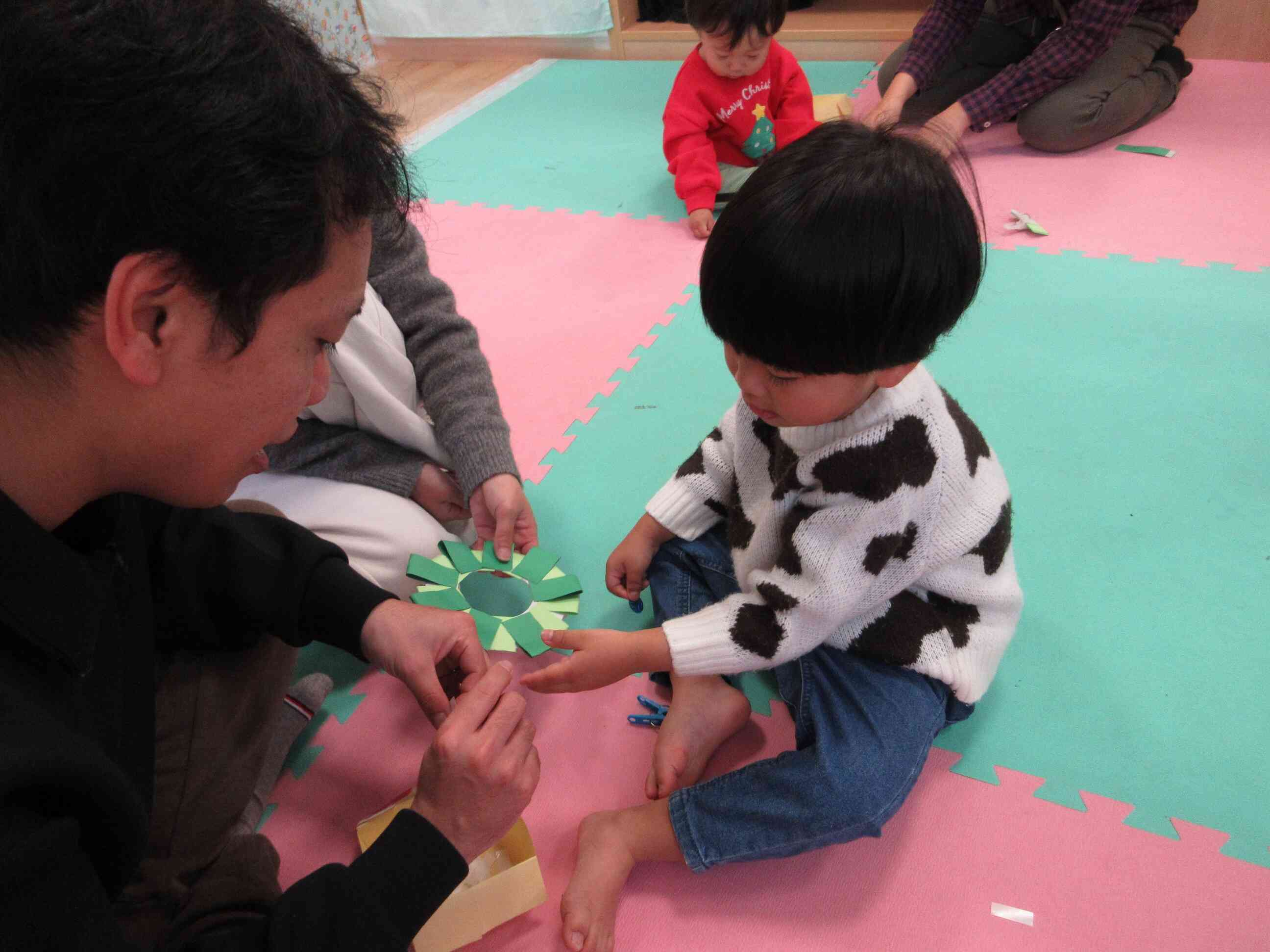 おうちの人と力を合わせて、手作りのクリスマスリースを作りました