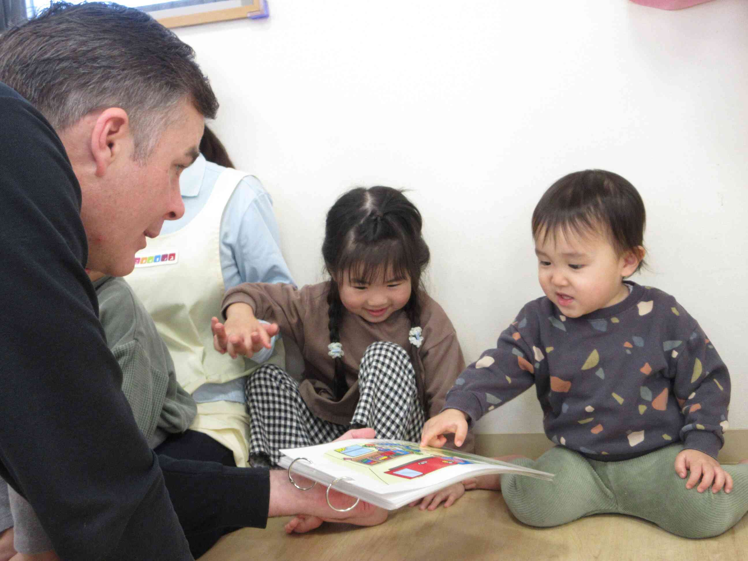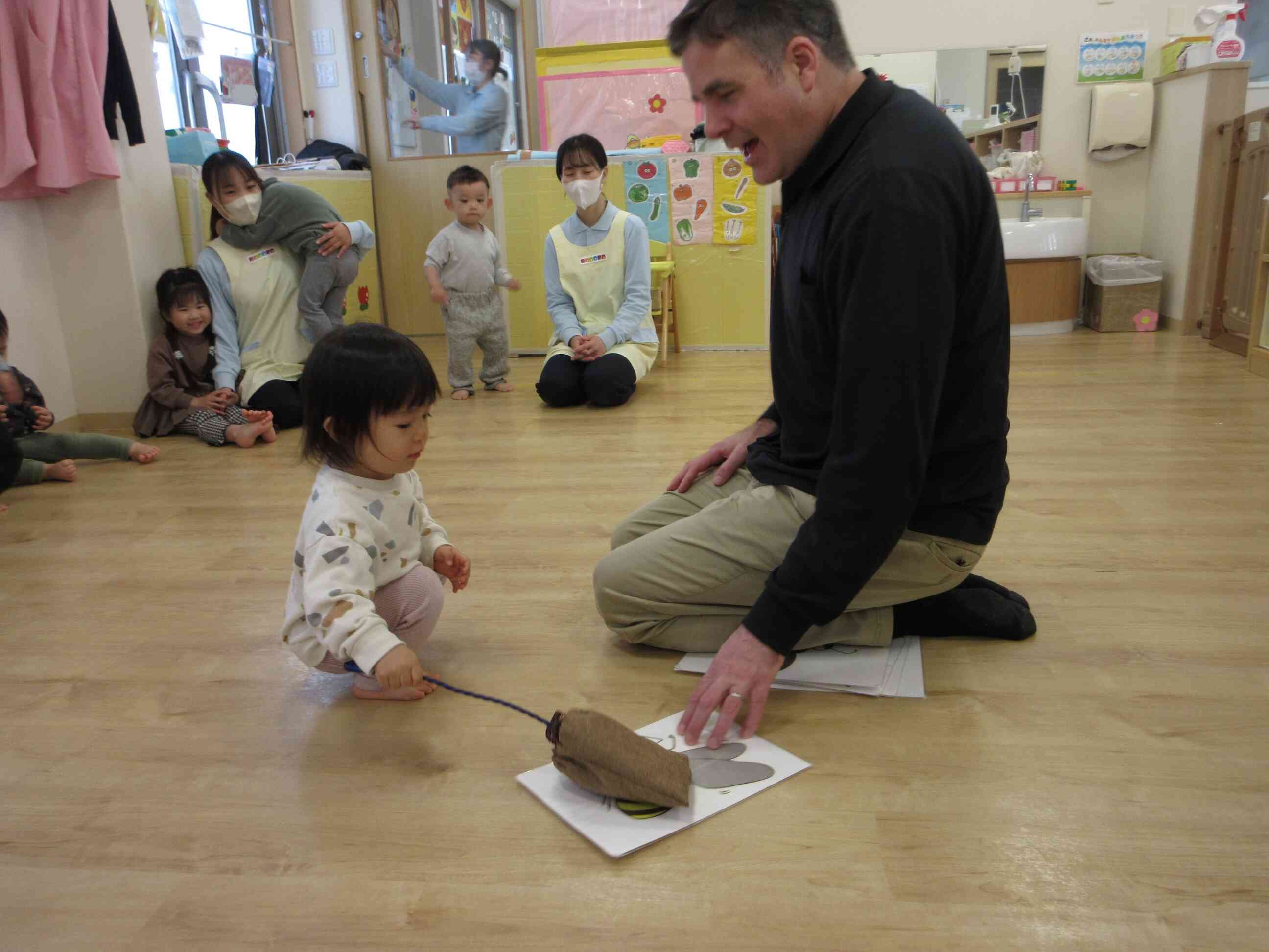 入園当初は先生が近くに来られると少し緊張した様子でしたが、今では自分の足で先生のそばに近づいていました。