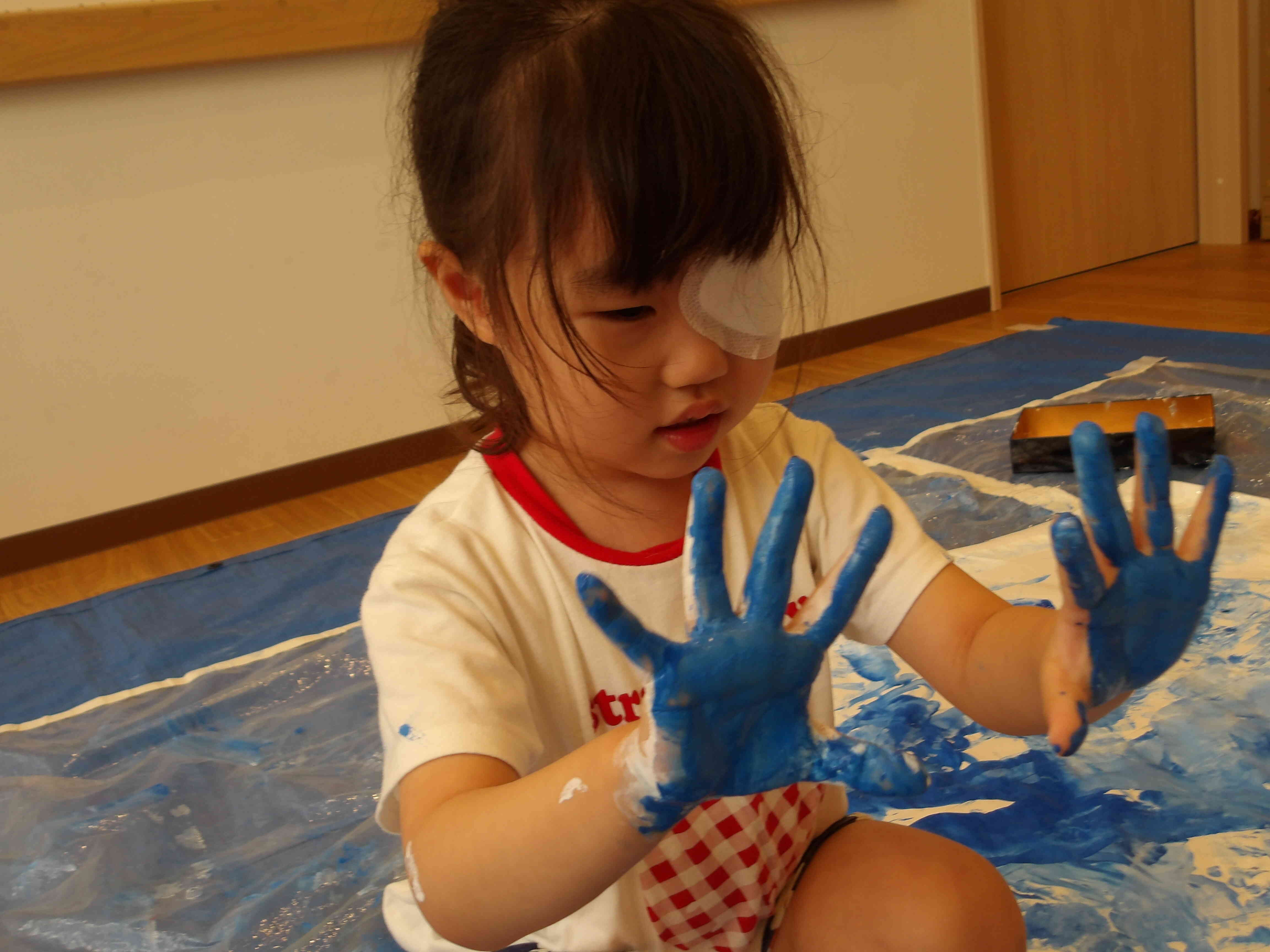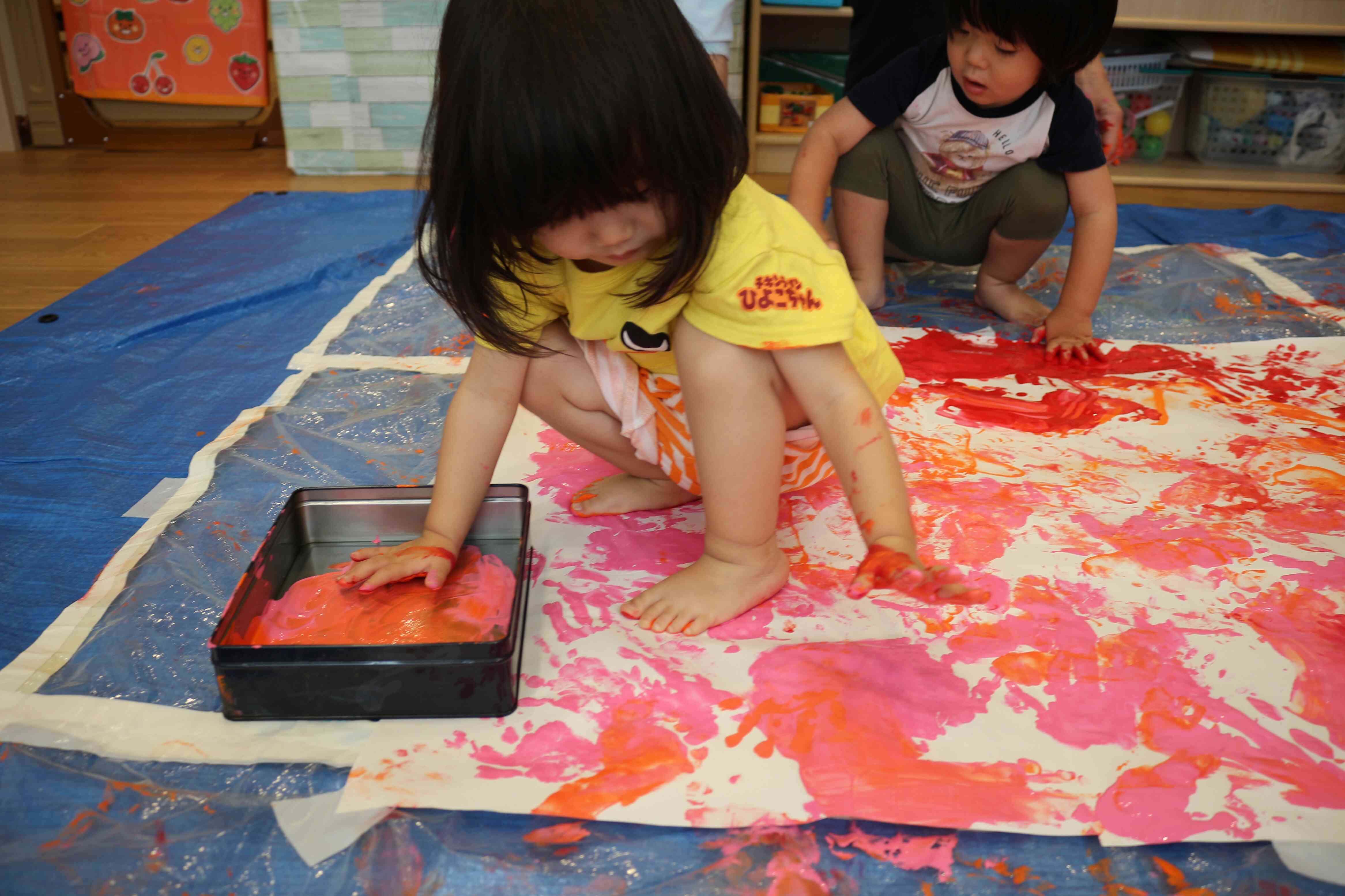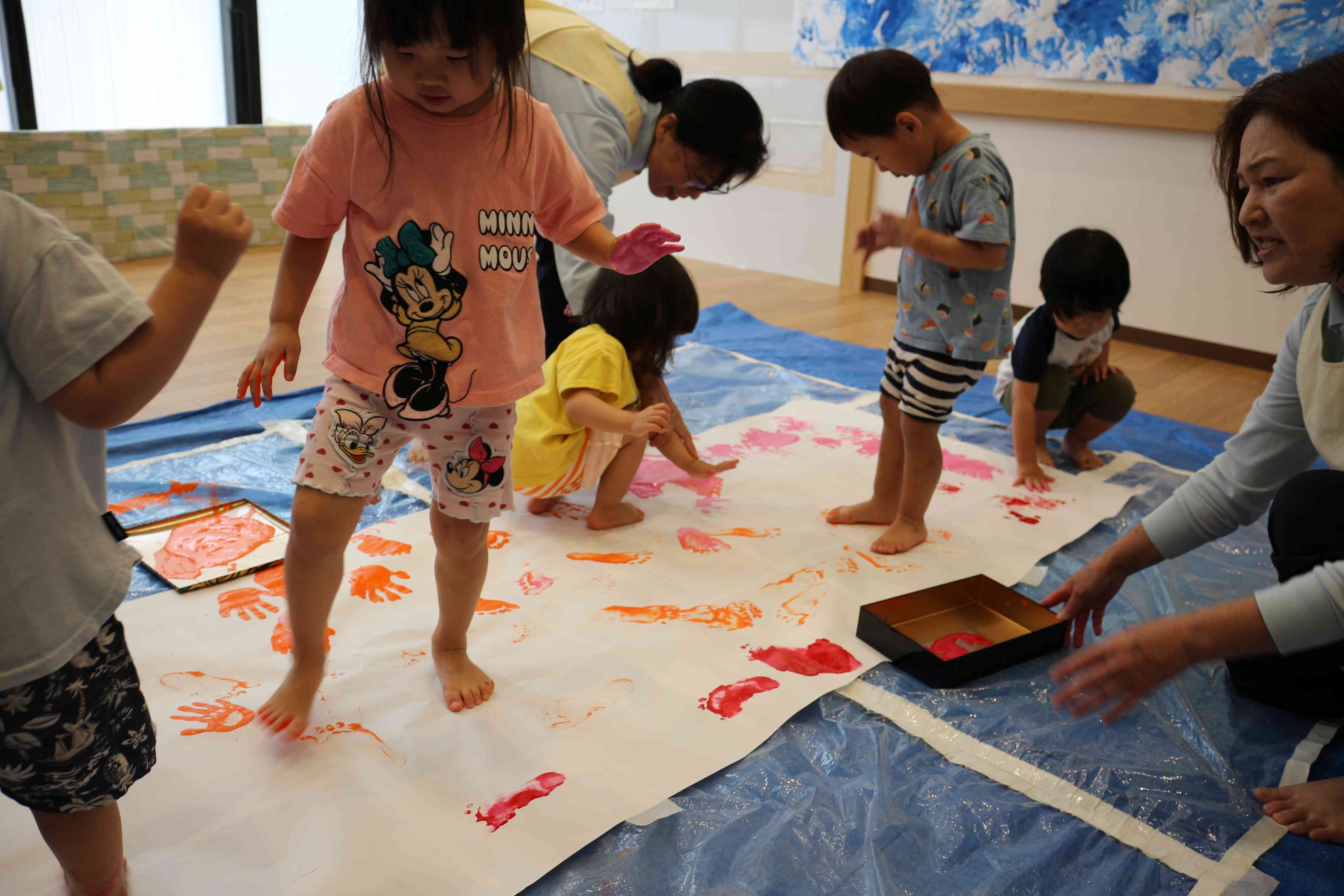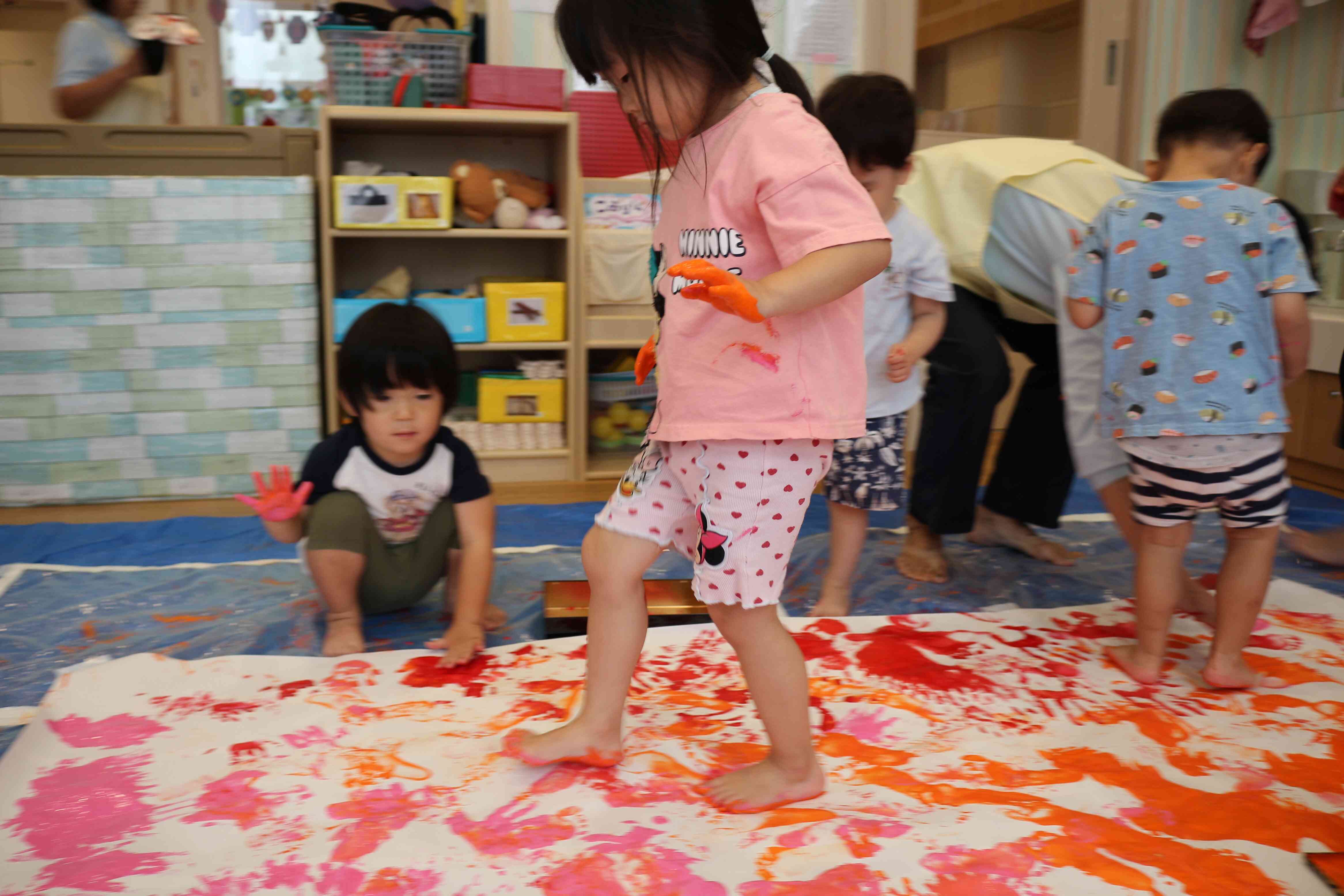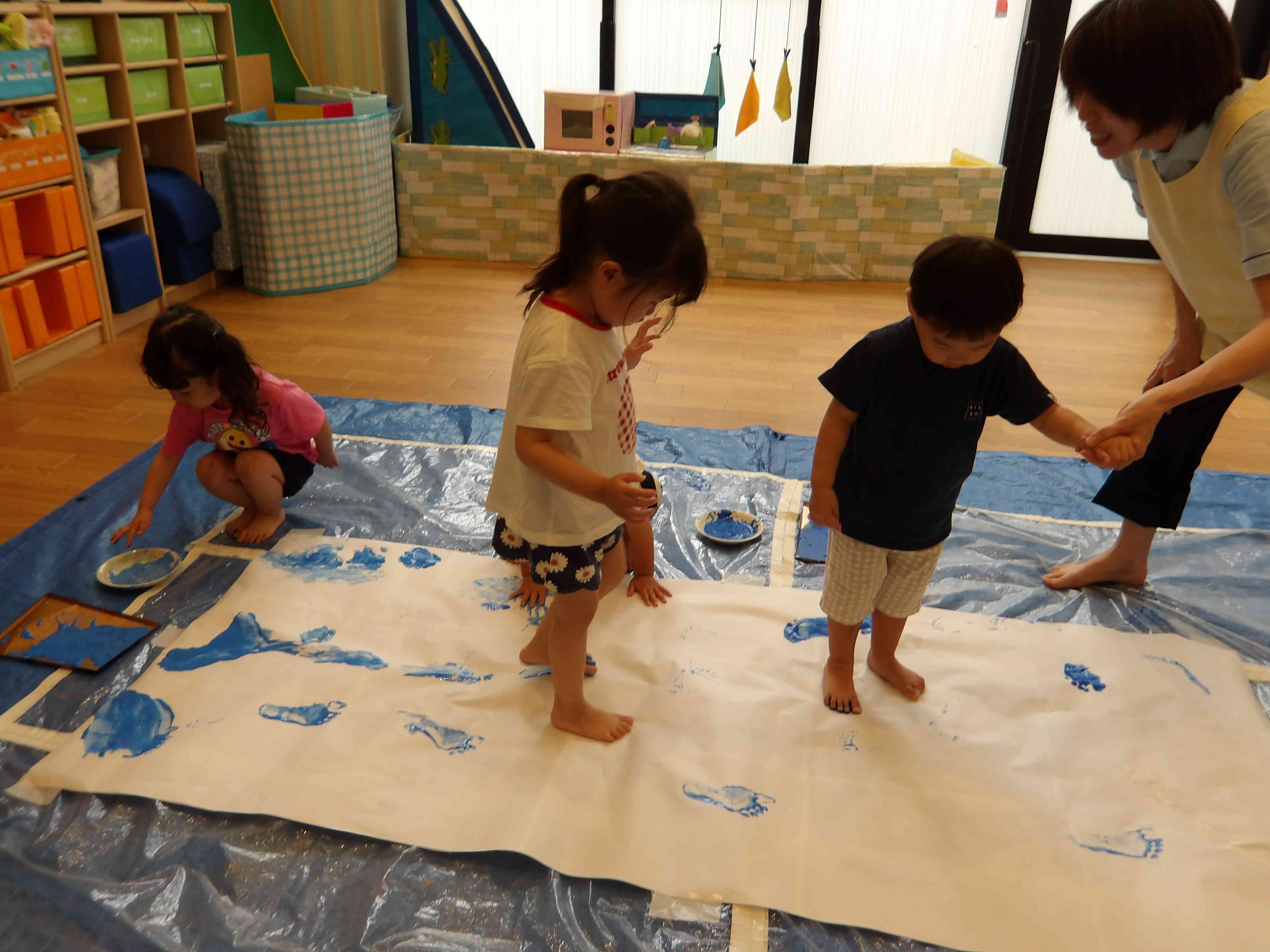 最初は、見たこともない大きな紙に戸惑っていましたが先生と一緒に足の裏に絵の具をつけ白い紙の上を端から端まで歩いたり、両手に絵の具をたっぷりつけペタペタペタっとつけたりしていました。紙に残った自分の足型を見て「みて~♪」と喜んでいました。