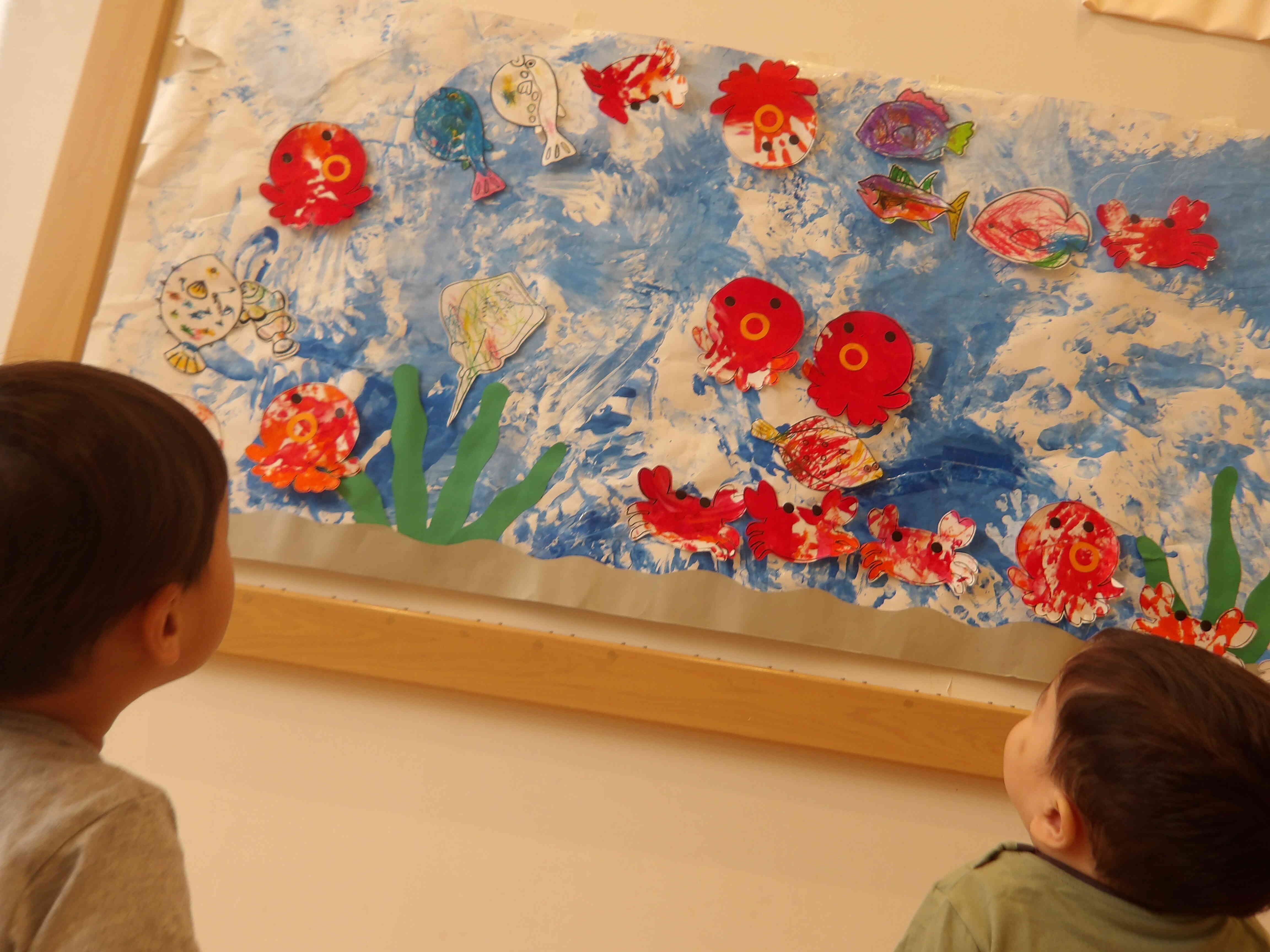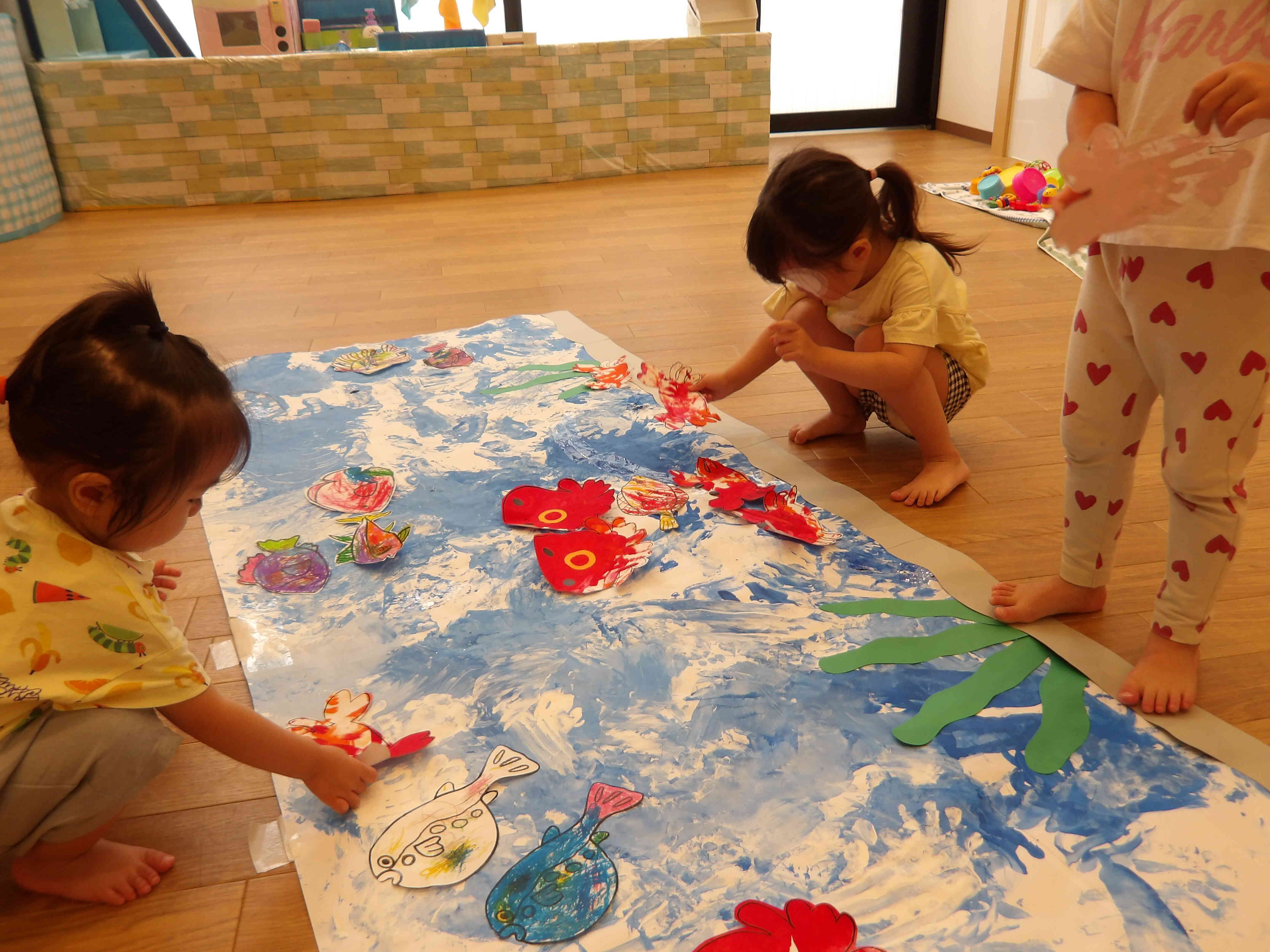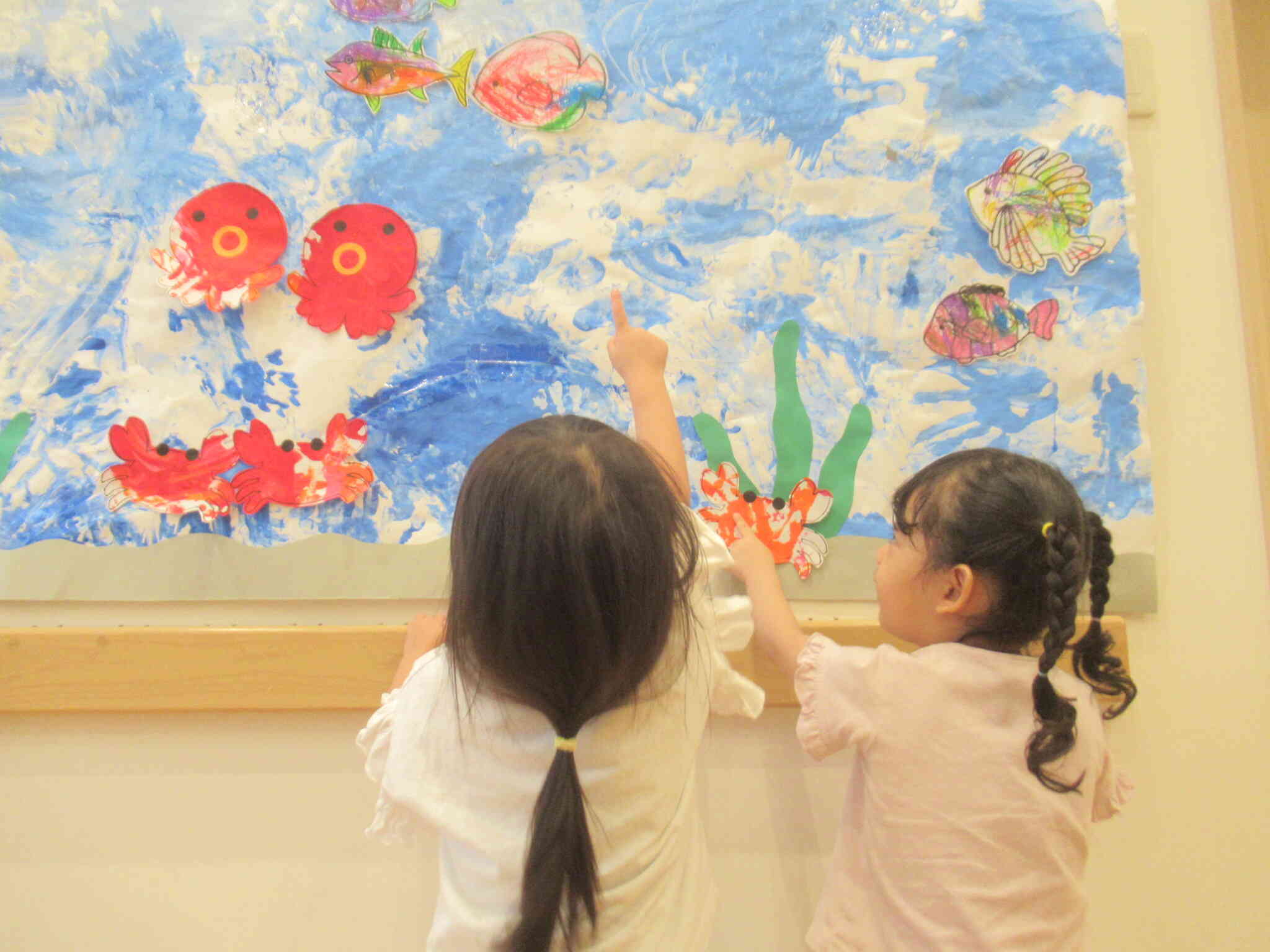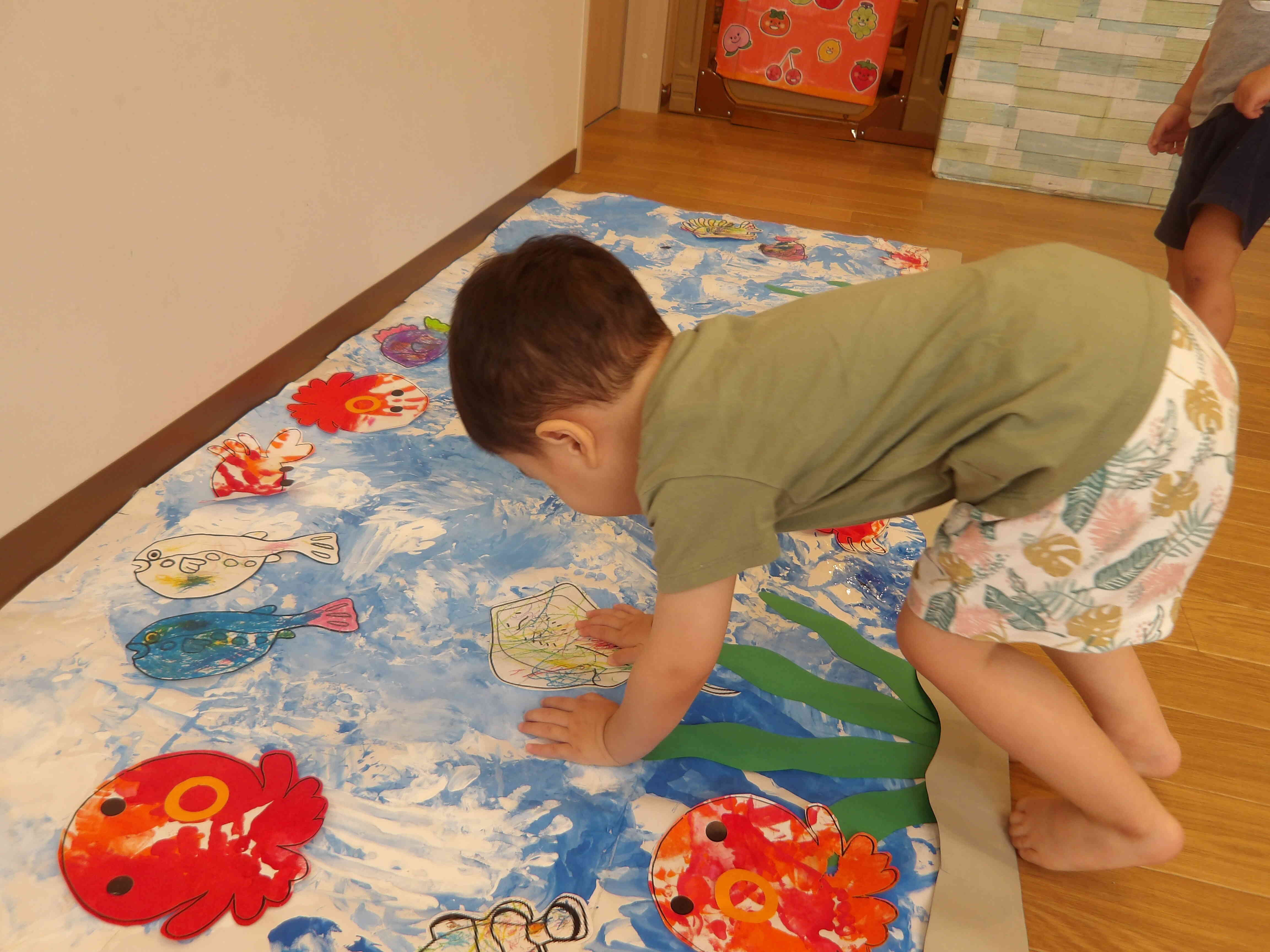 赤、オレンジ、ピンクに色を塗った紙はタコやカニの形に切取り、クレヨンで塗ったさかなと一緒に貼っていきました。
