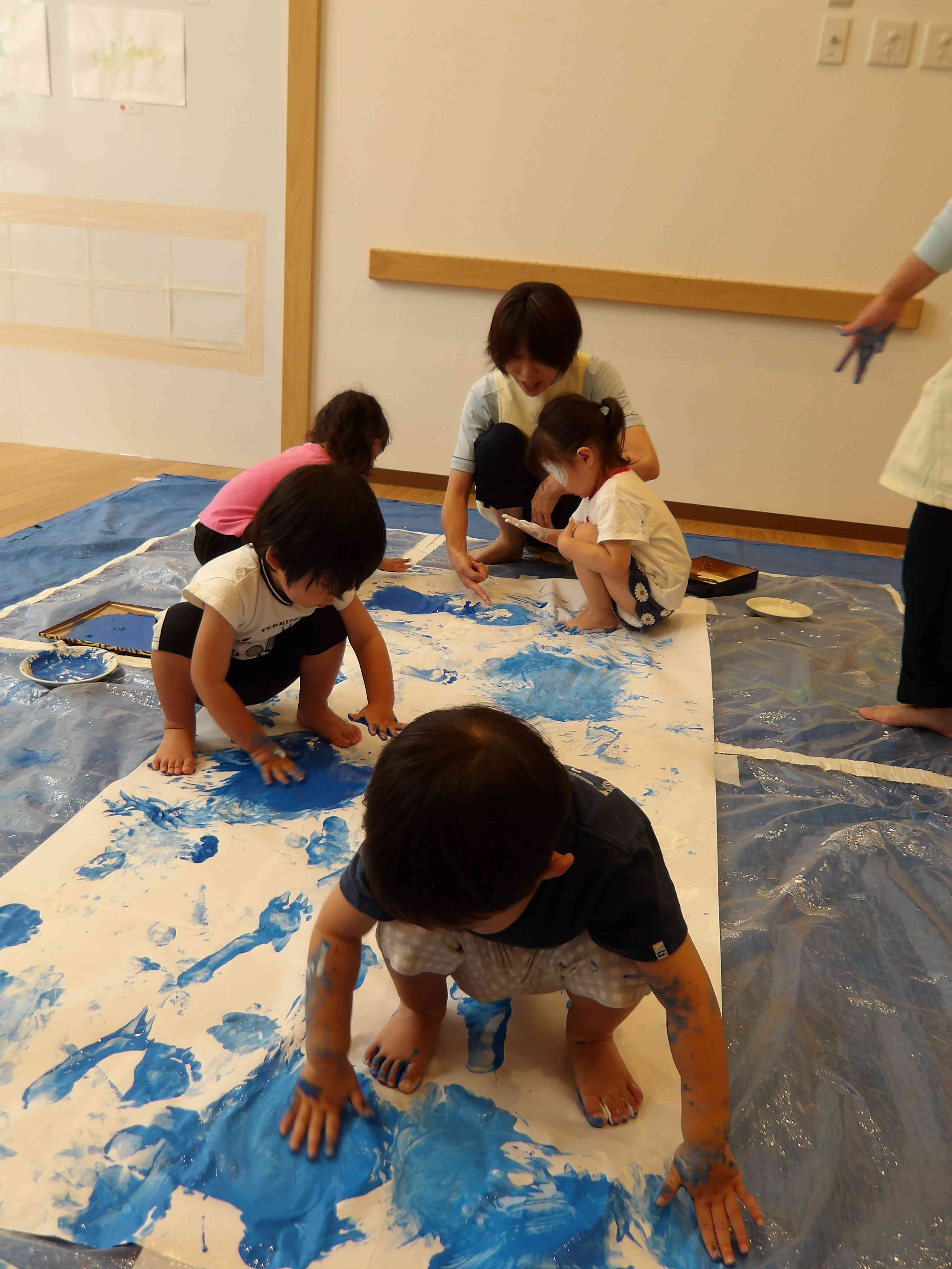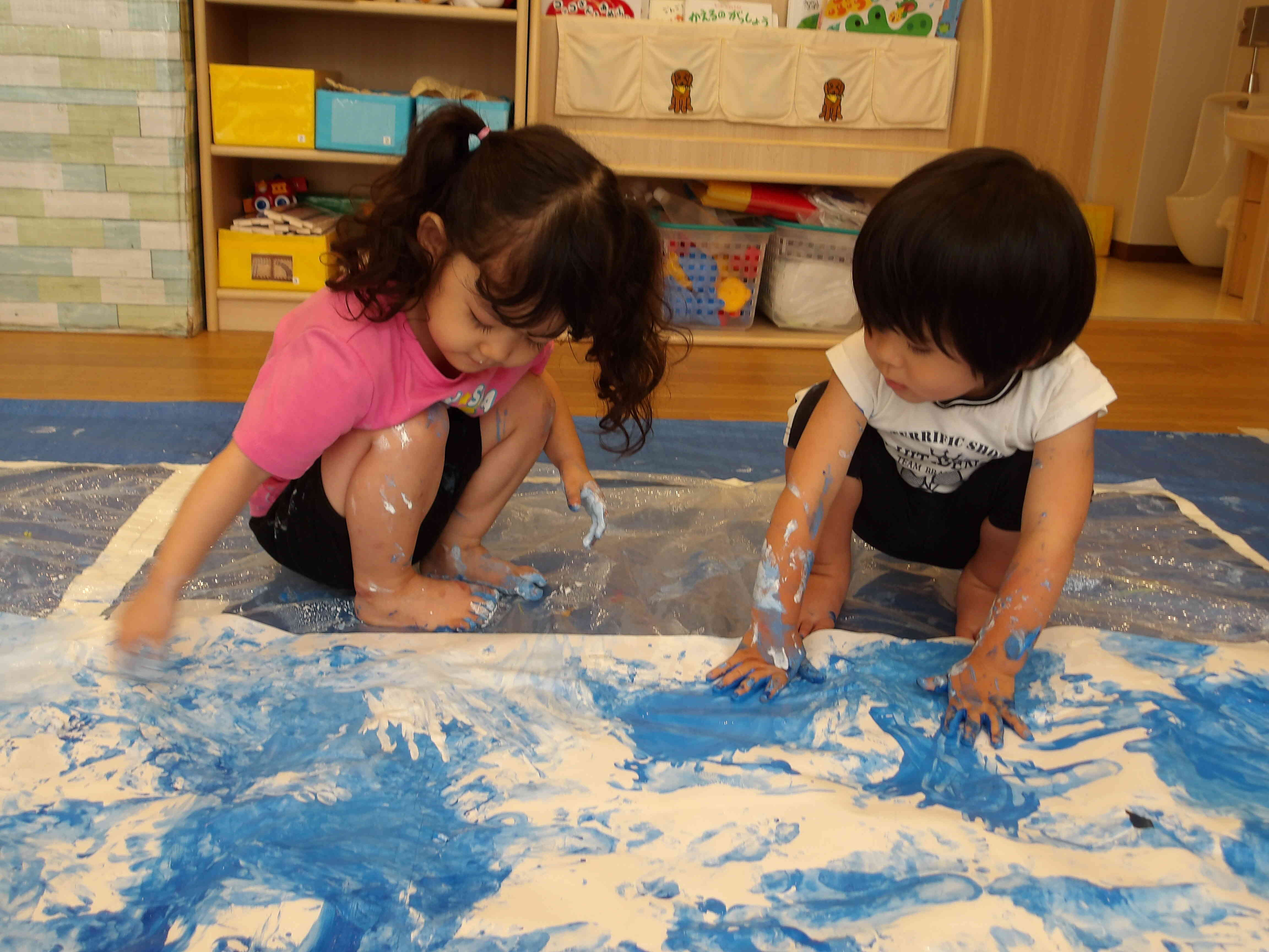 きりん組さんは大きな紙に青、水色、白の絵の具と赤、オレンジ、ピンクの絵の具を足や両手を使って色を塗りました。
