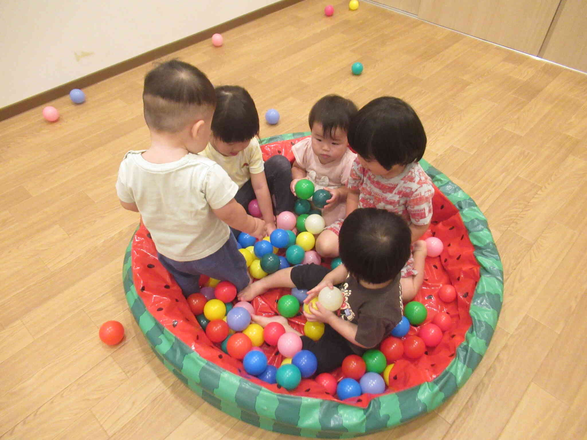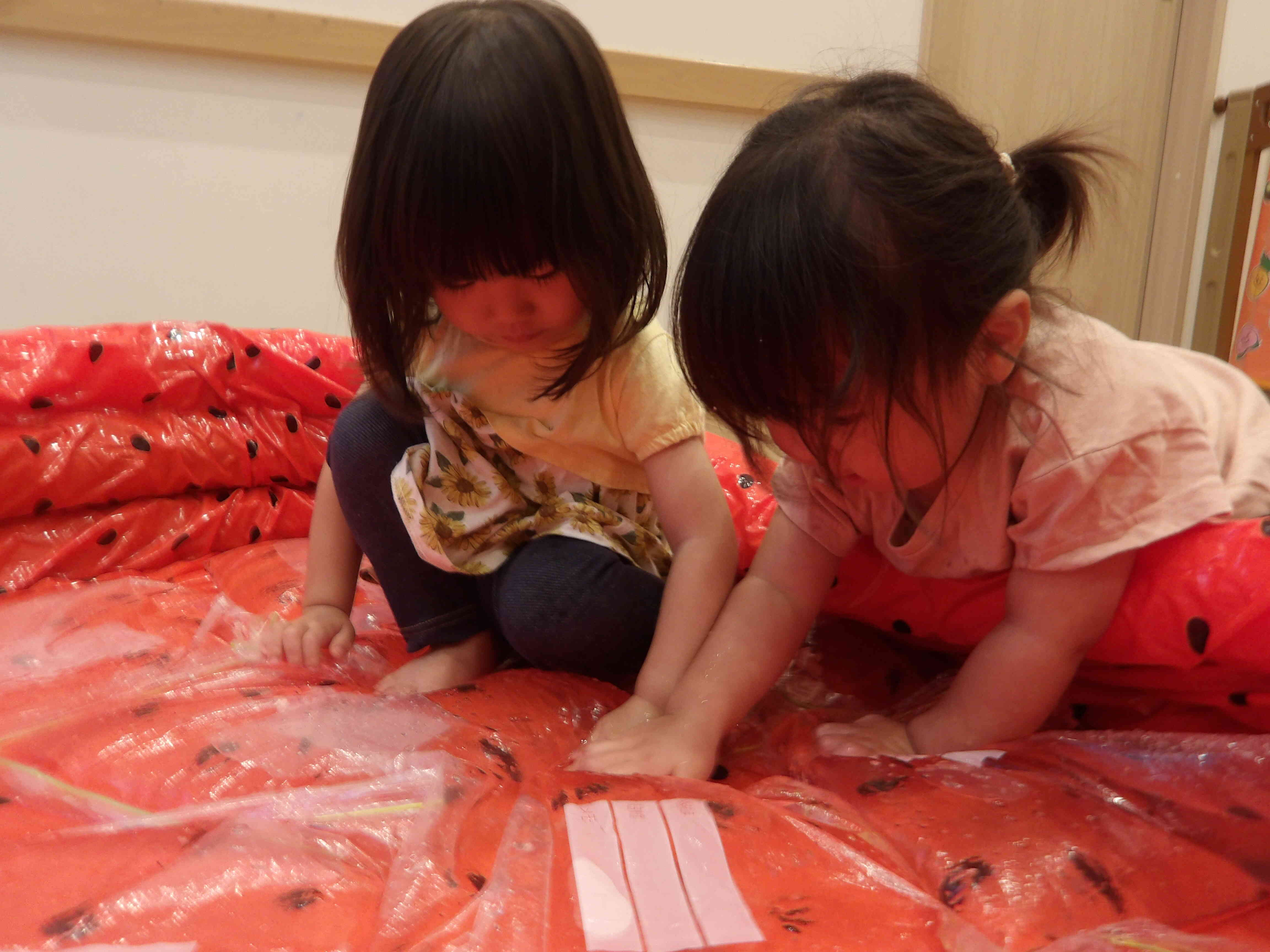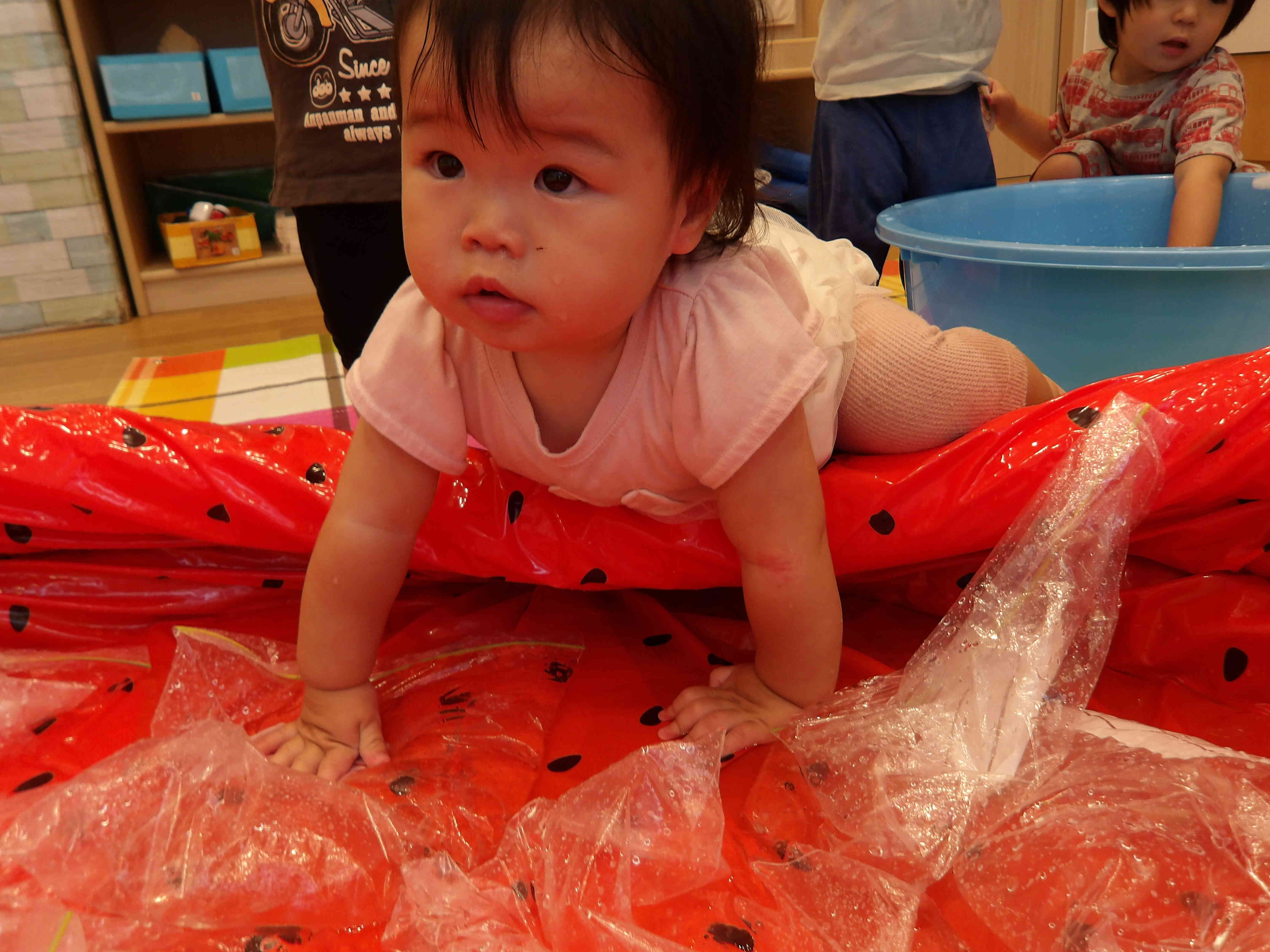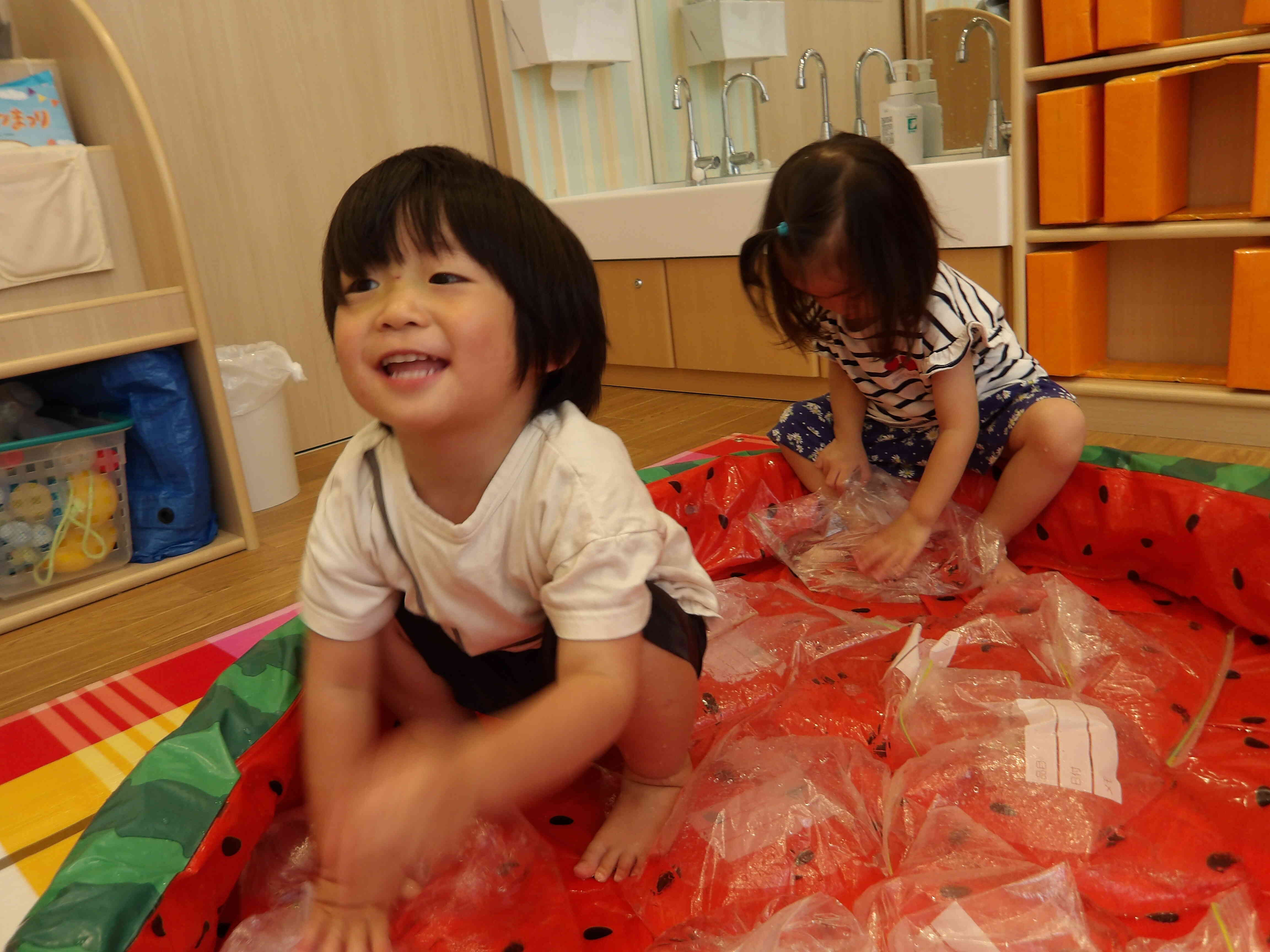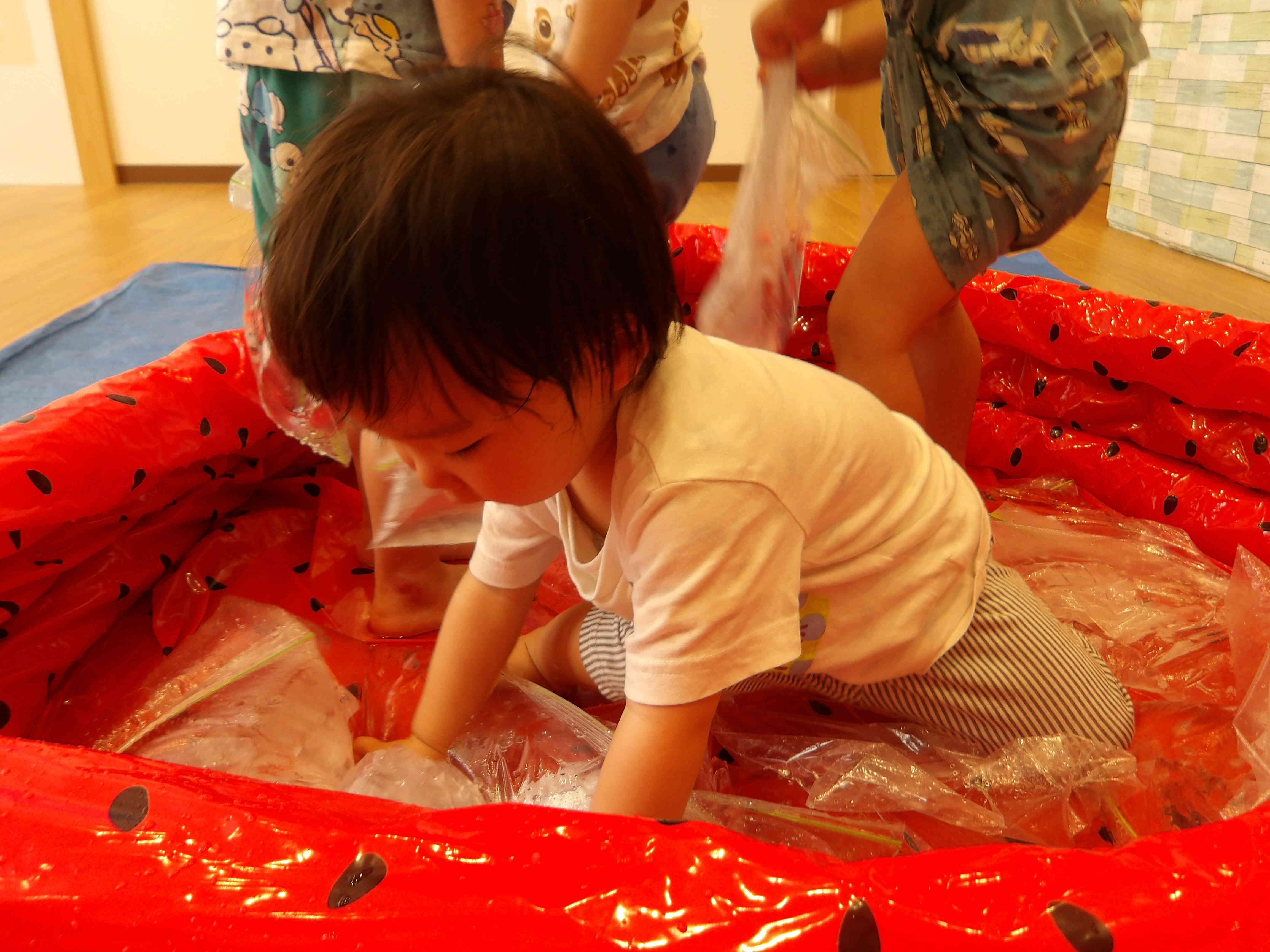 いつもと違う足の感触に少し歩いてすぐ外に出てしまう子、プールの中で横になって全身で感触を楽しむ子など子ども達の反応も様々でした。