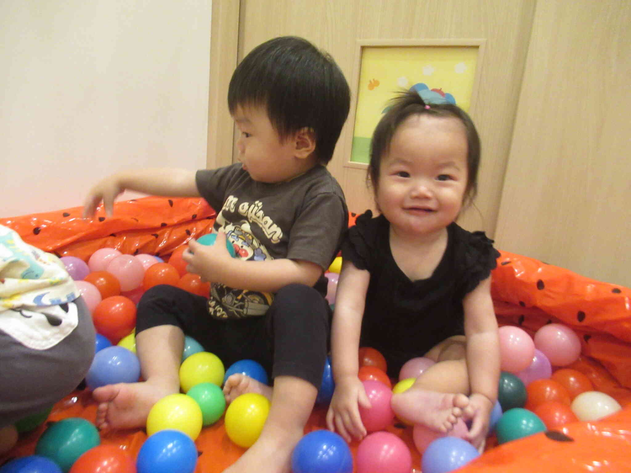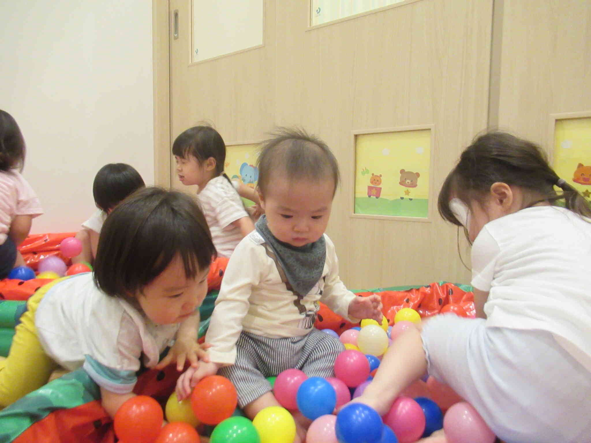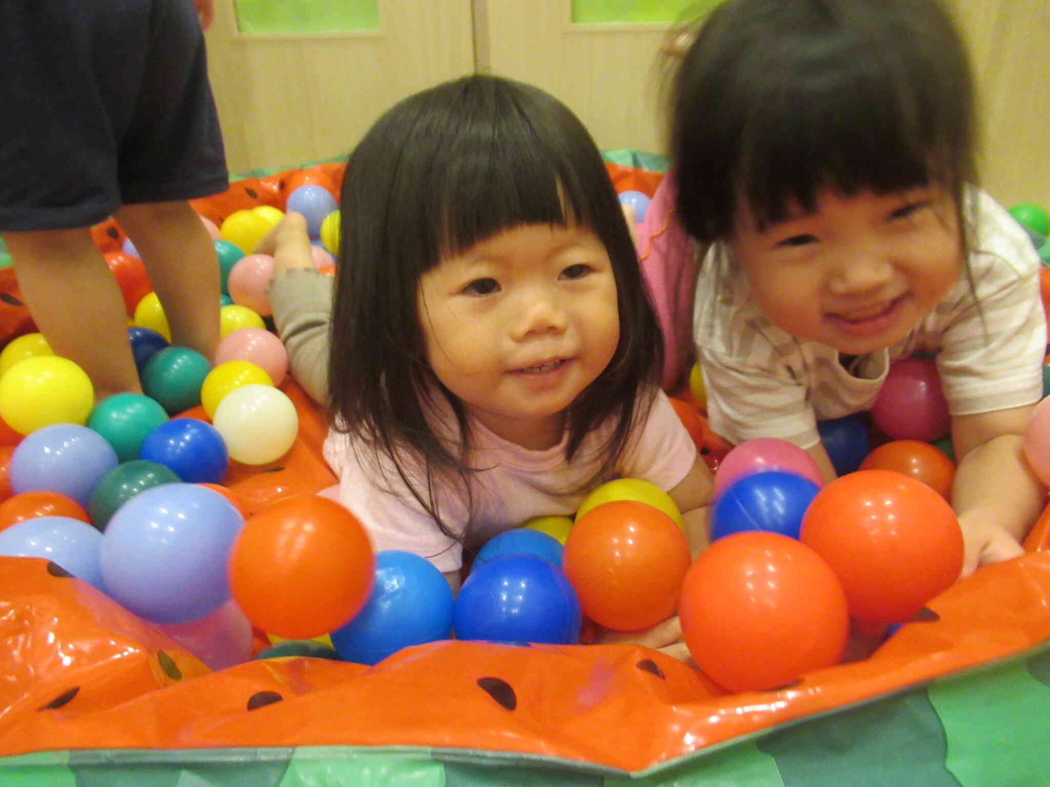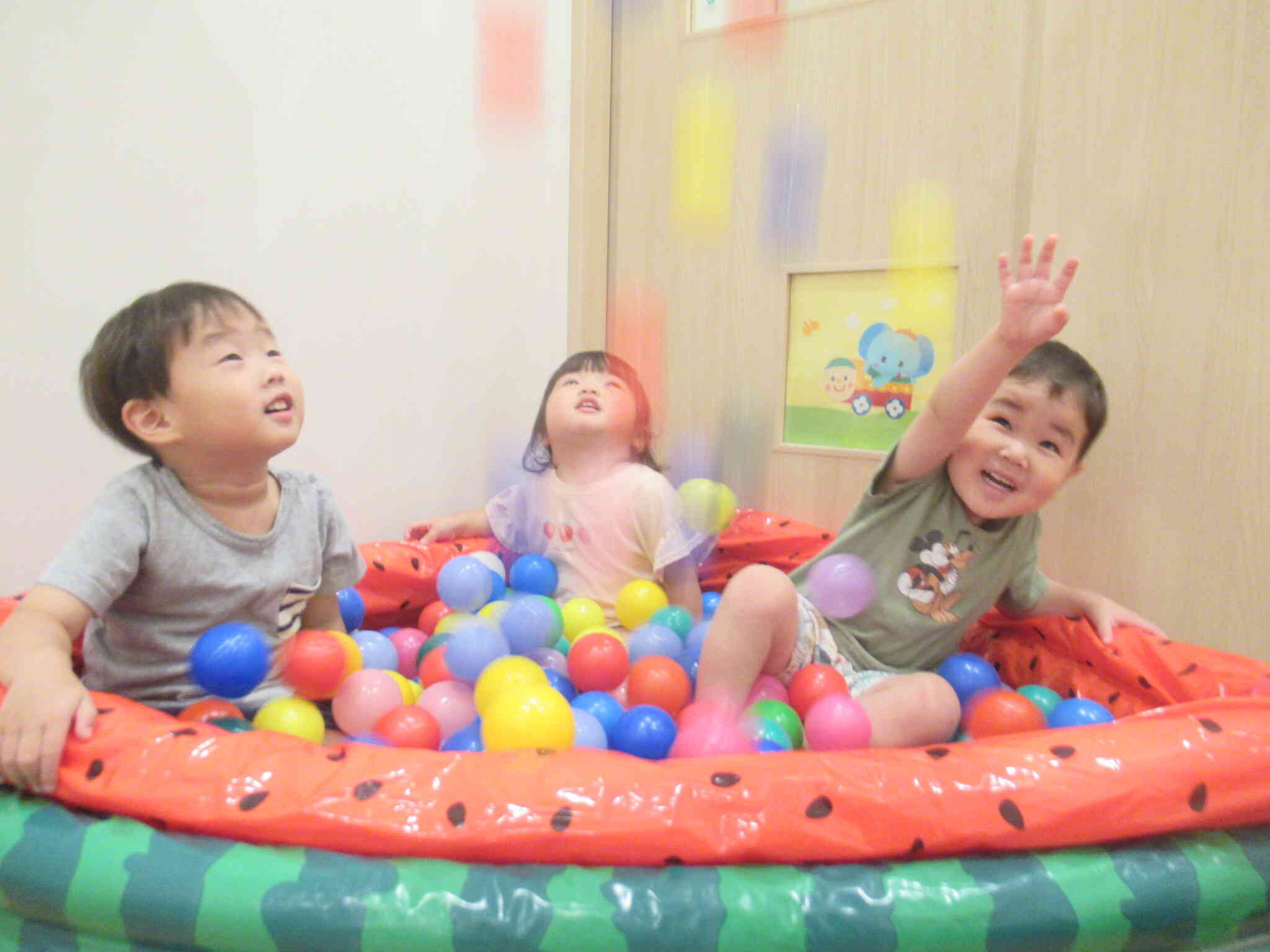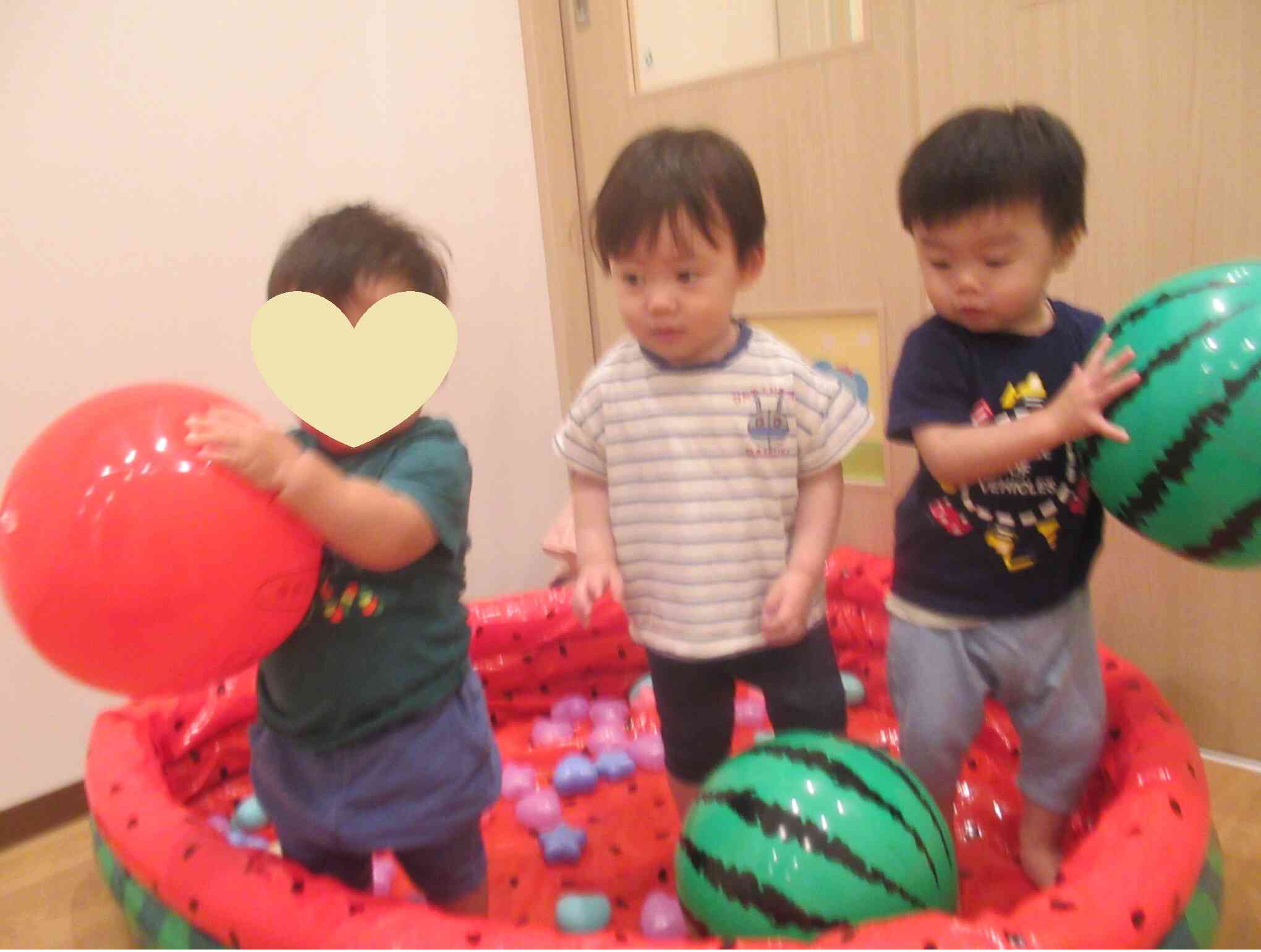 いつもと違う足の感触に少し歩いてすぐ外に出てしまう子、プールの中で横になって全身で感触を楽しむ子など子ども達の反応も様々でした。