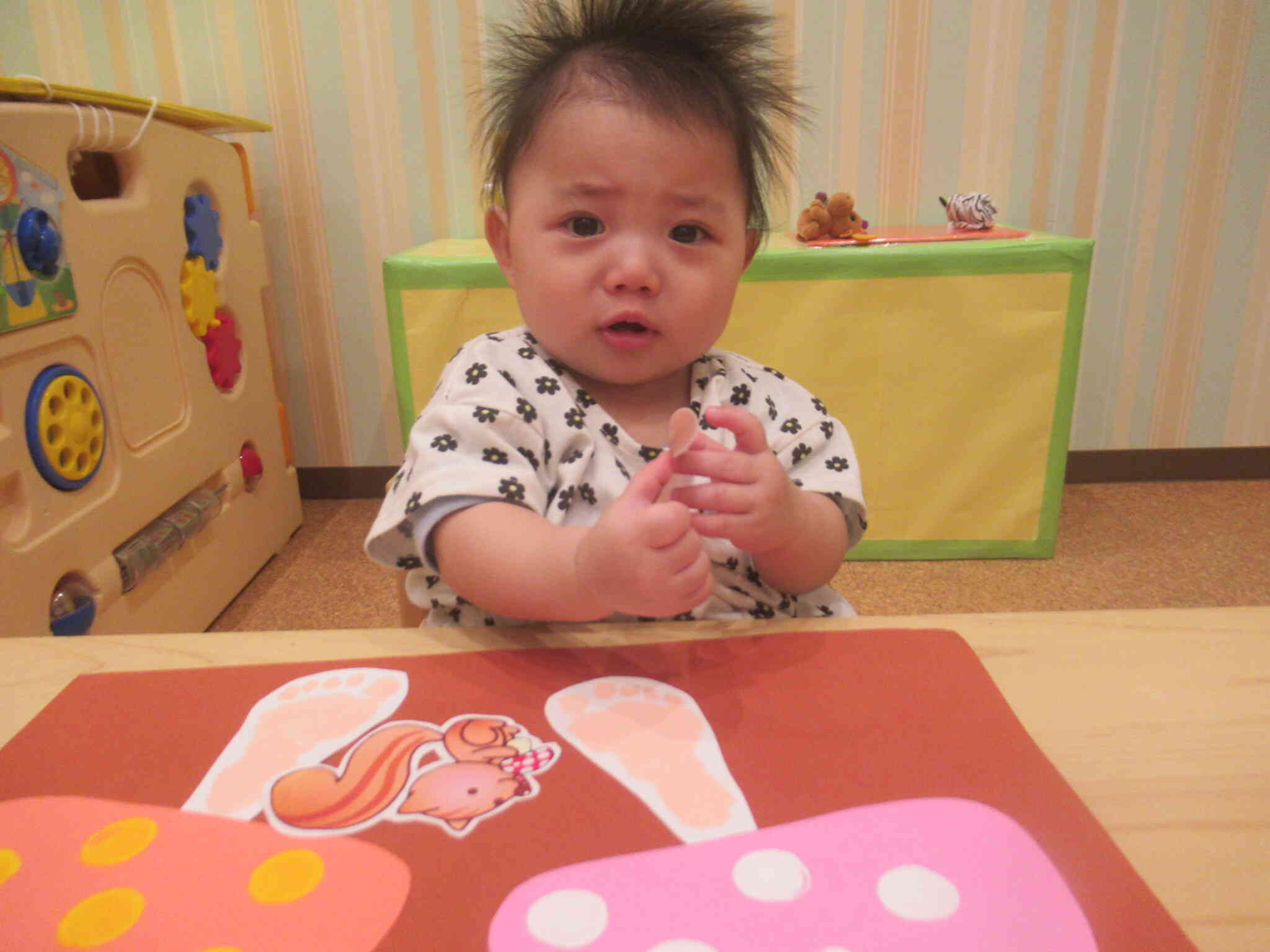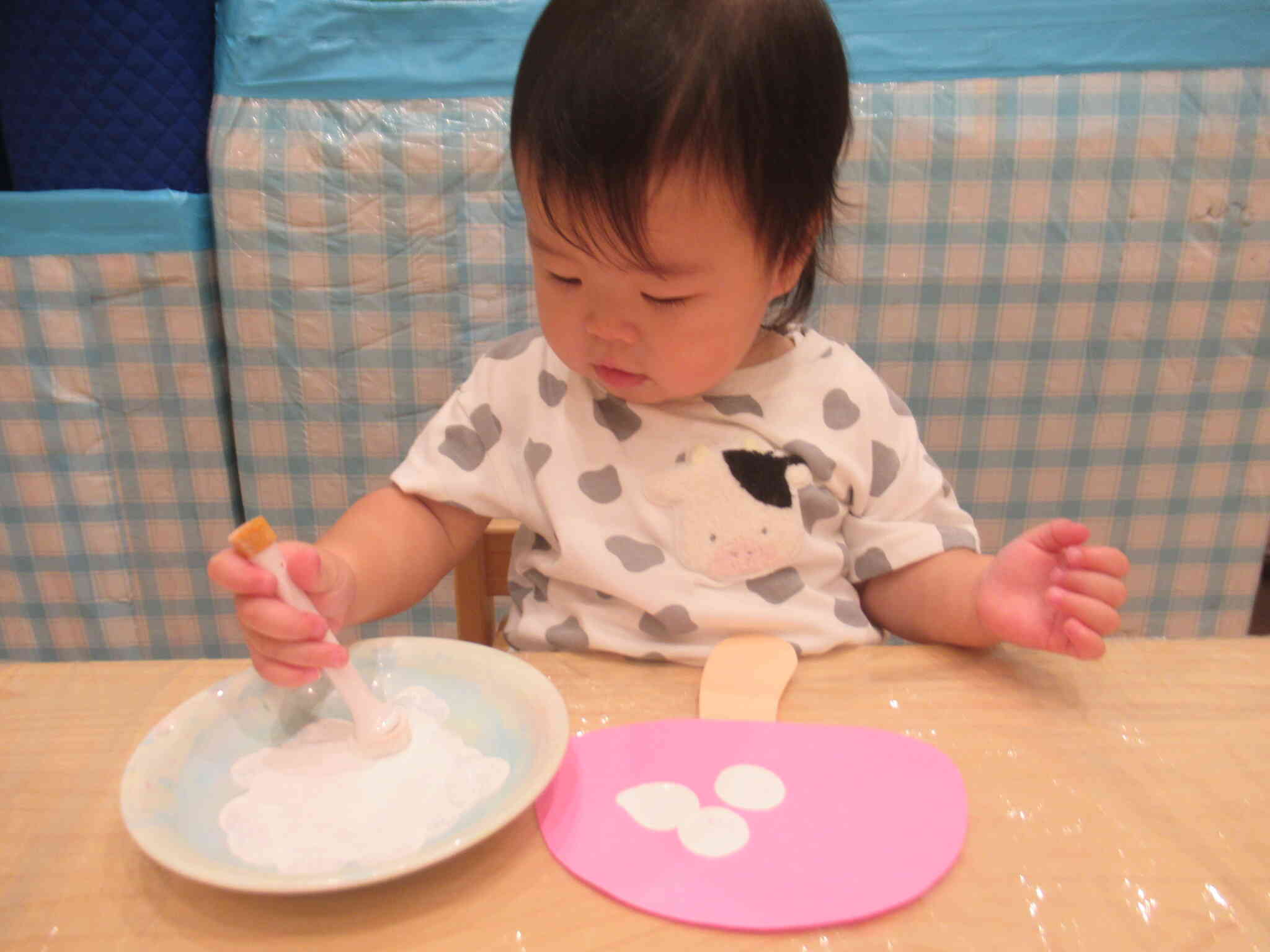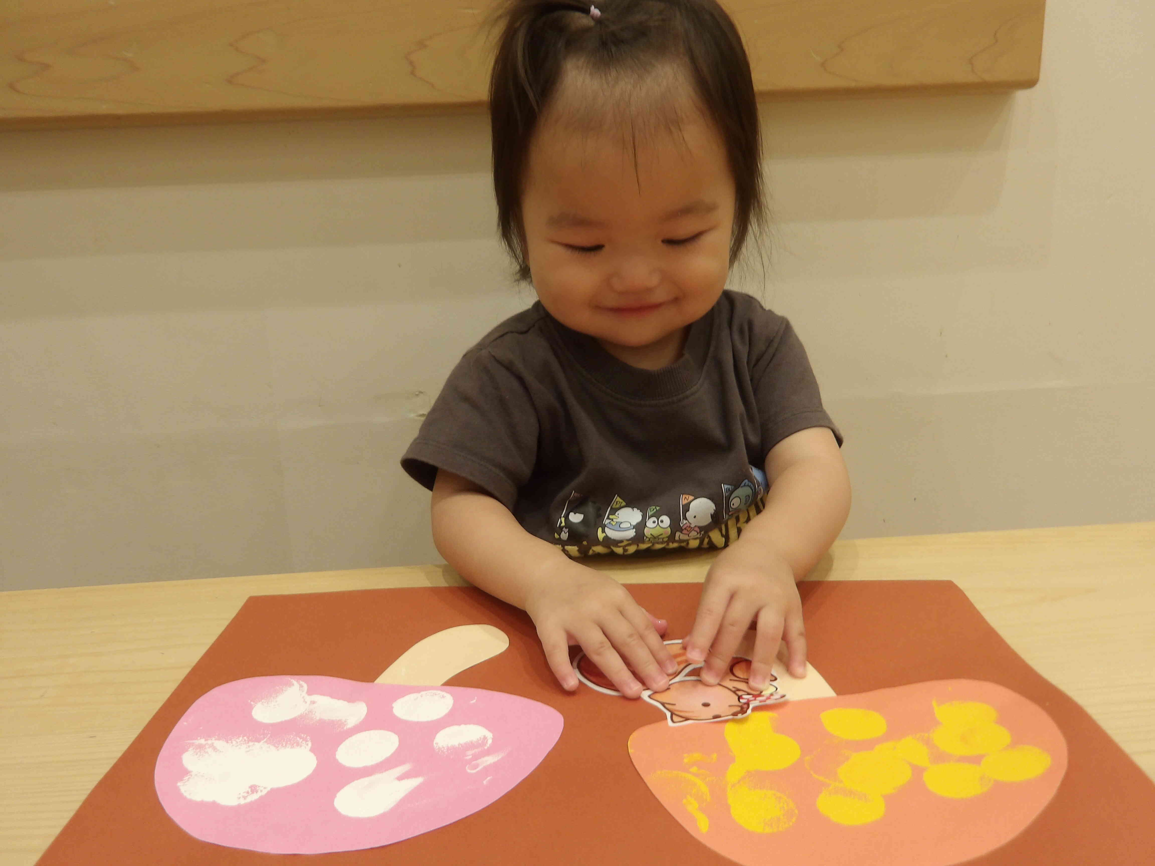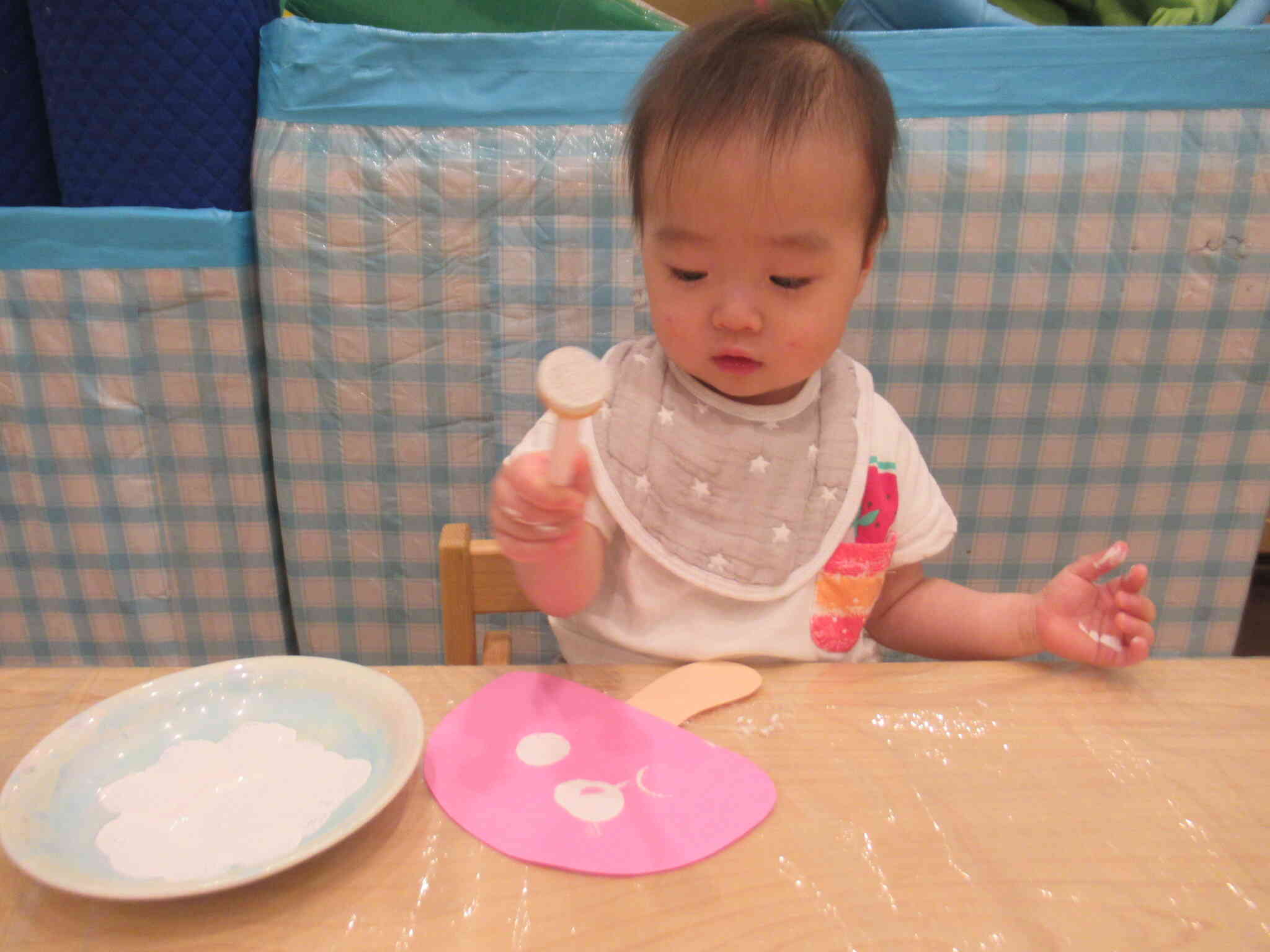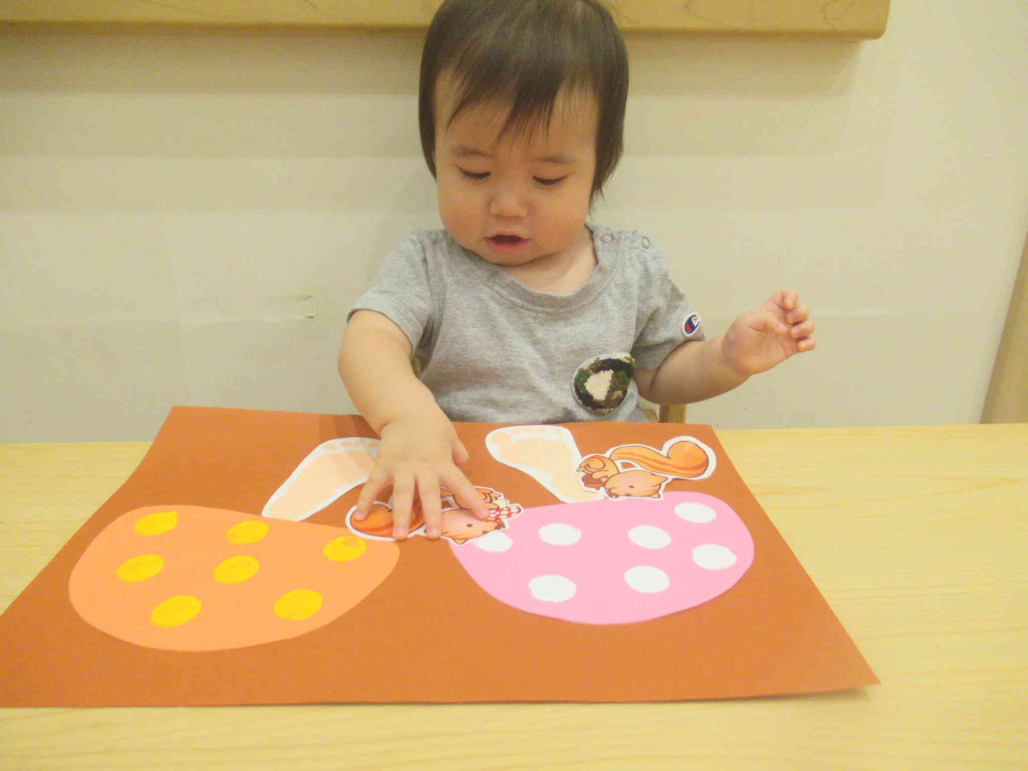 大きなきのこにスタンプで模様をつけました。製作も楽しんで行っています♪