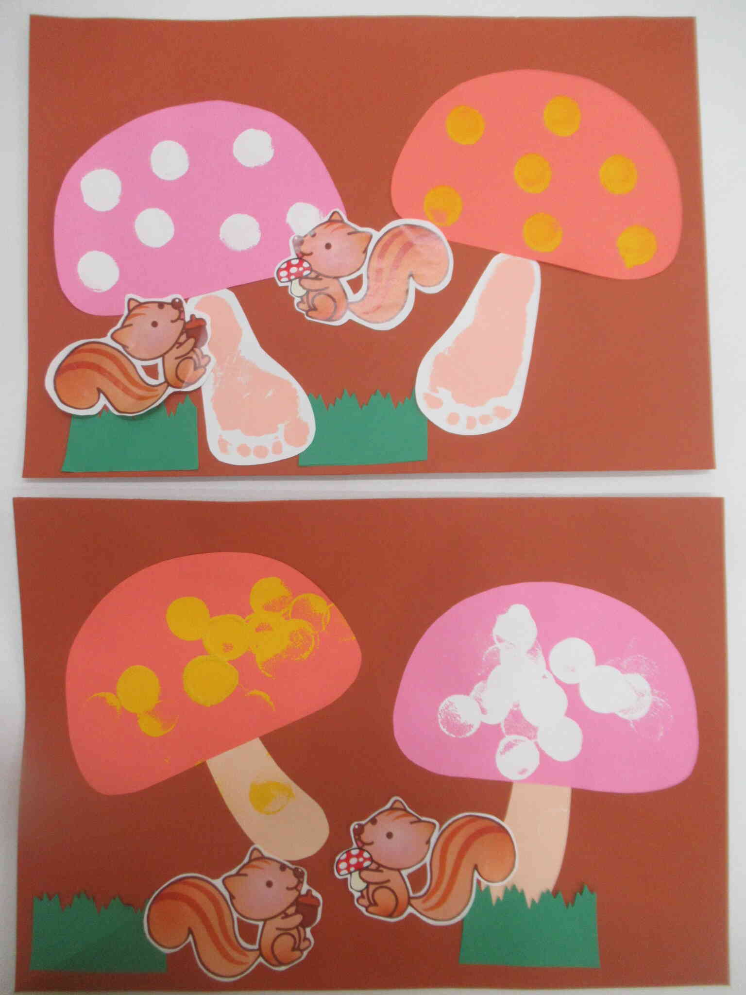 スタンプしたきのこの周りにかわいいリスさんが遊びに来たようですね♡