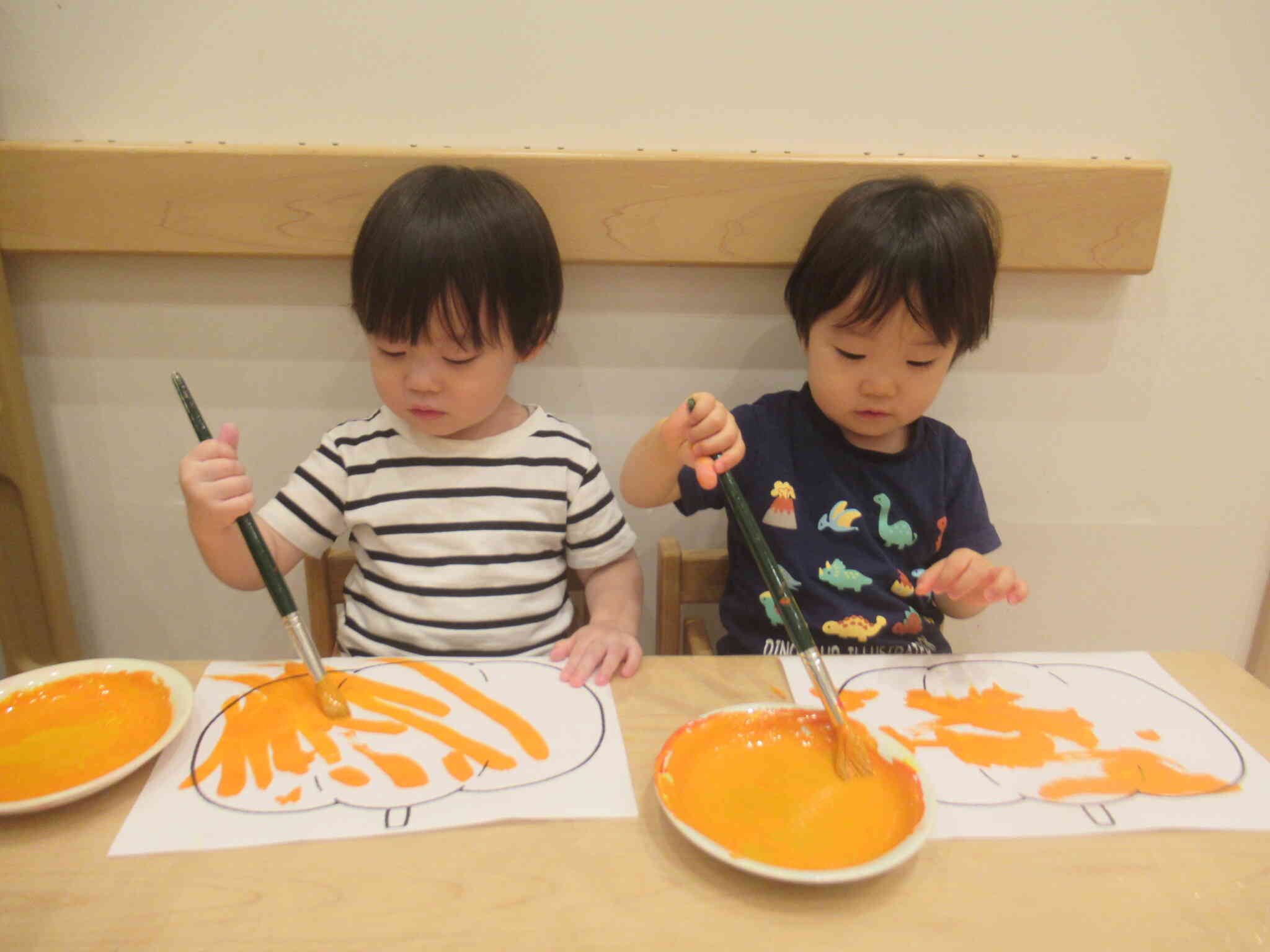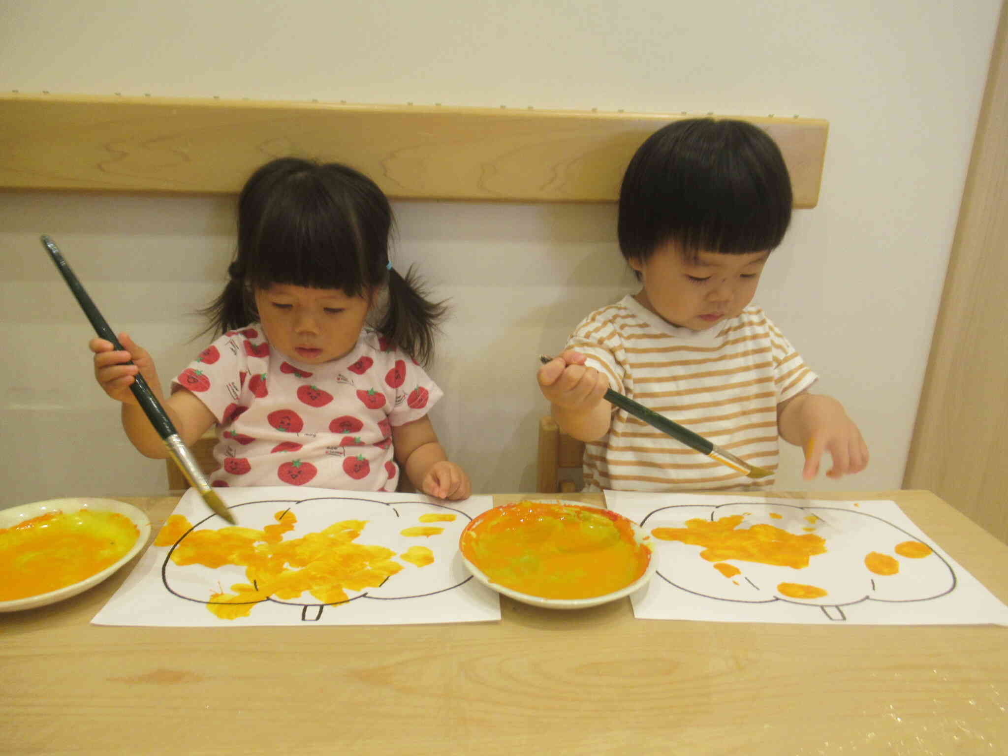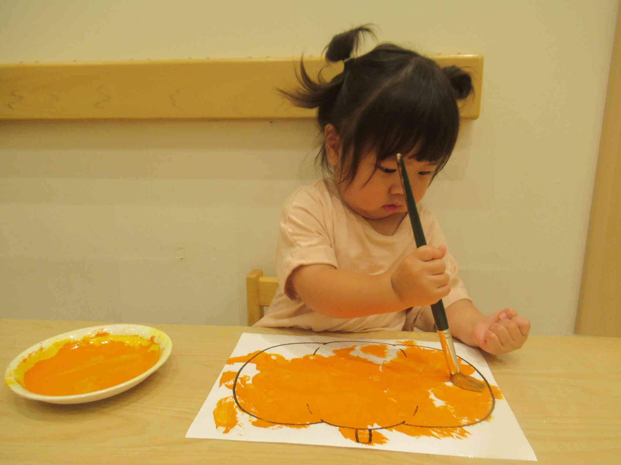 絵具を付けた筆をしっかり握ってかぼちゃに色を塗りました