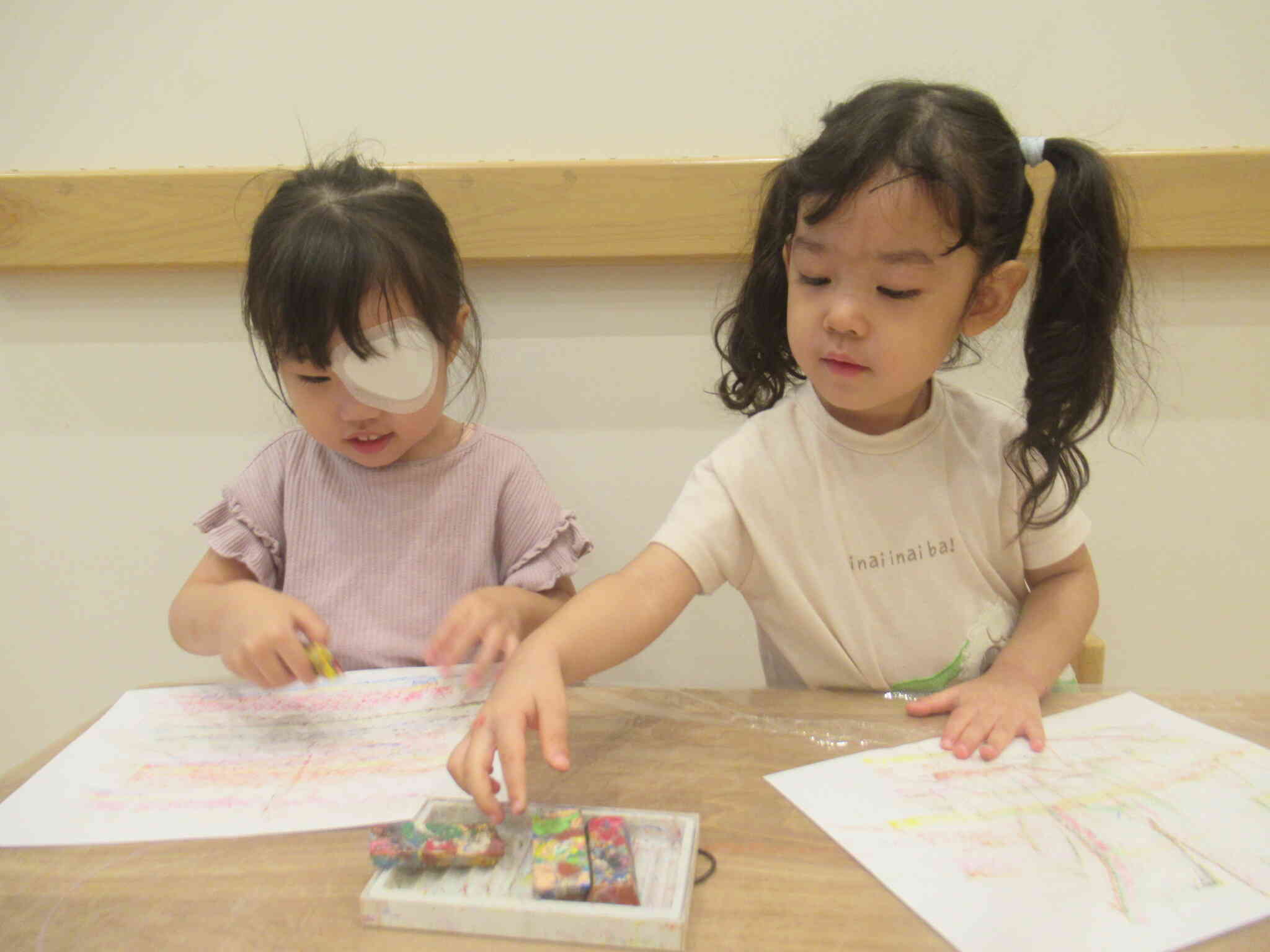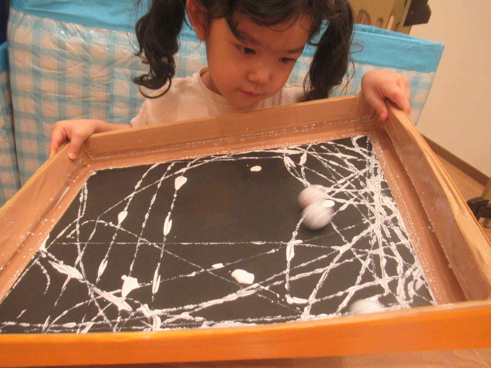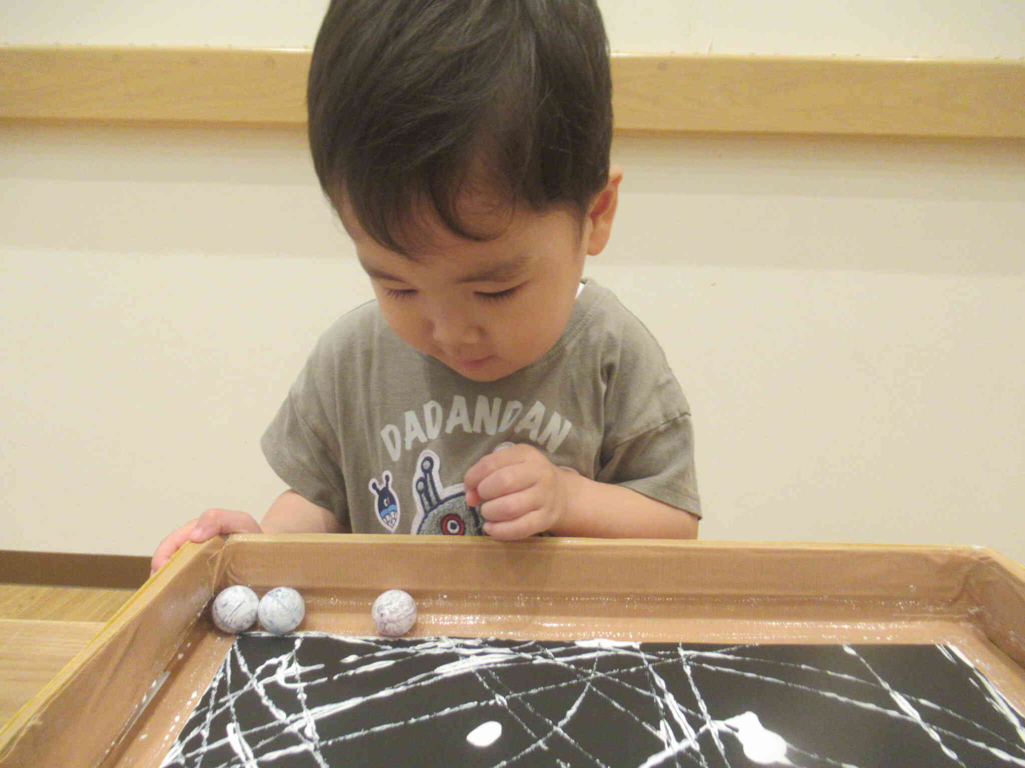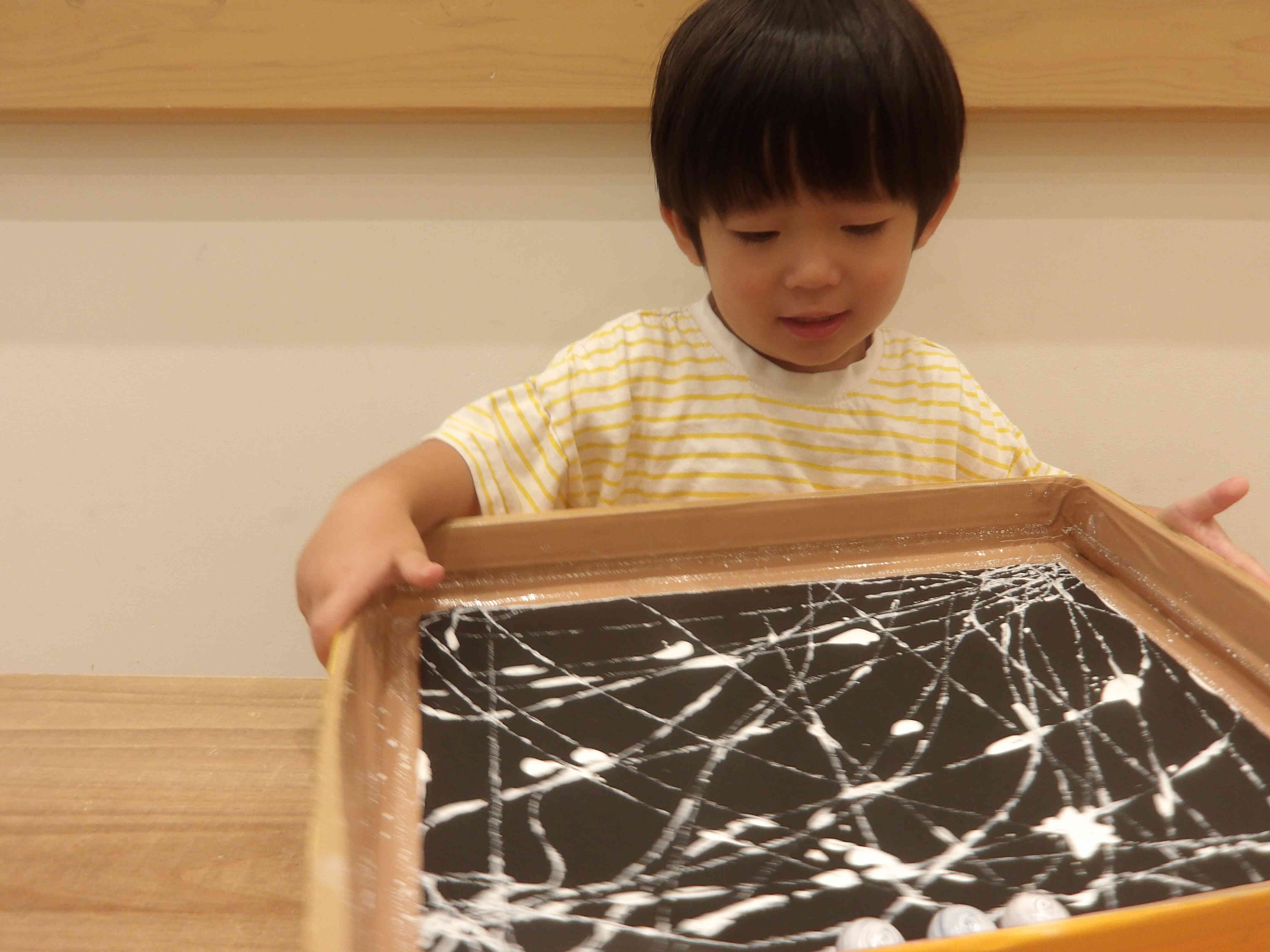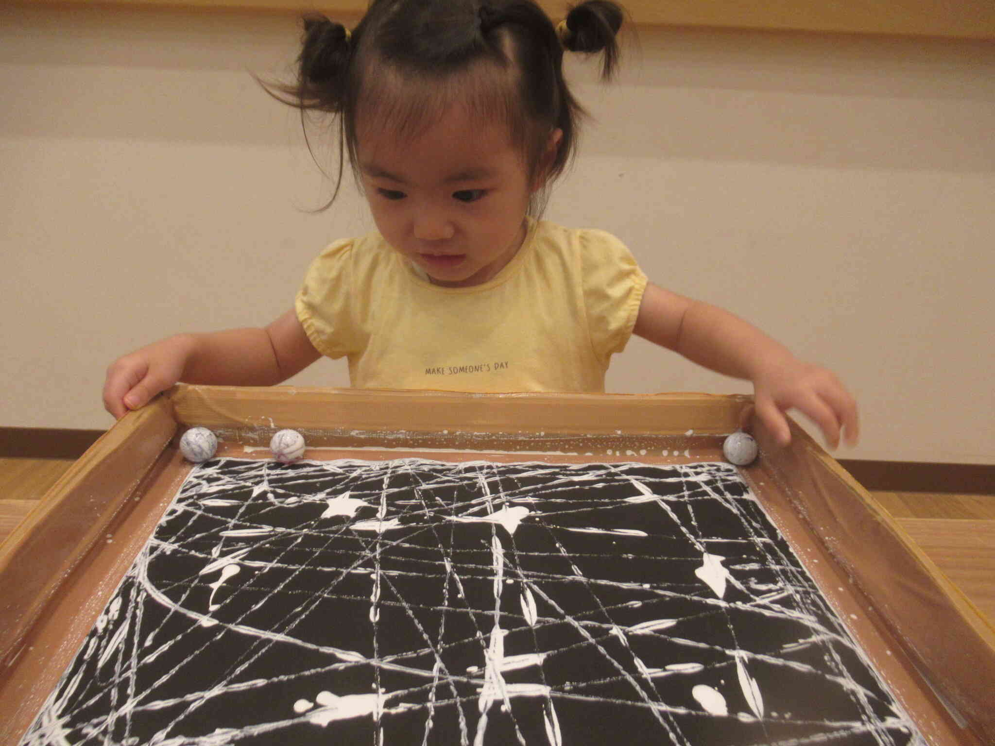 きりん組さんは黒色画用紙の上に白絵具をつけたビー玉を転がして蜘蛛の巣を描きました。