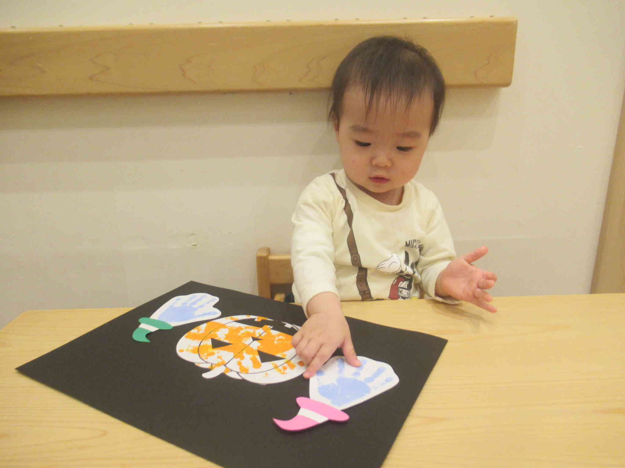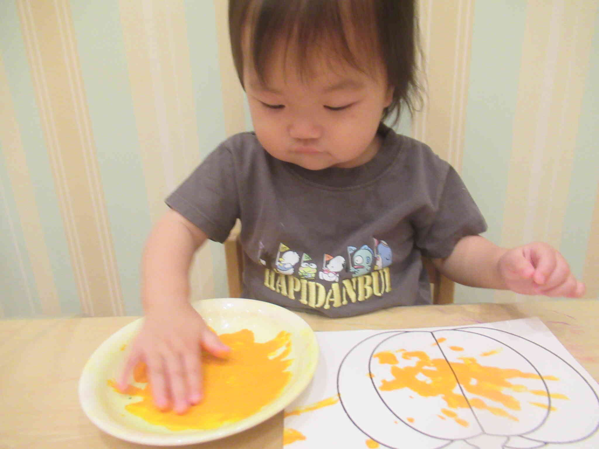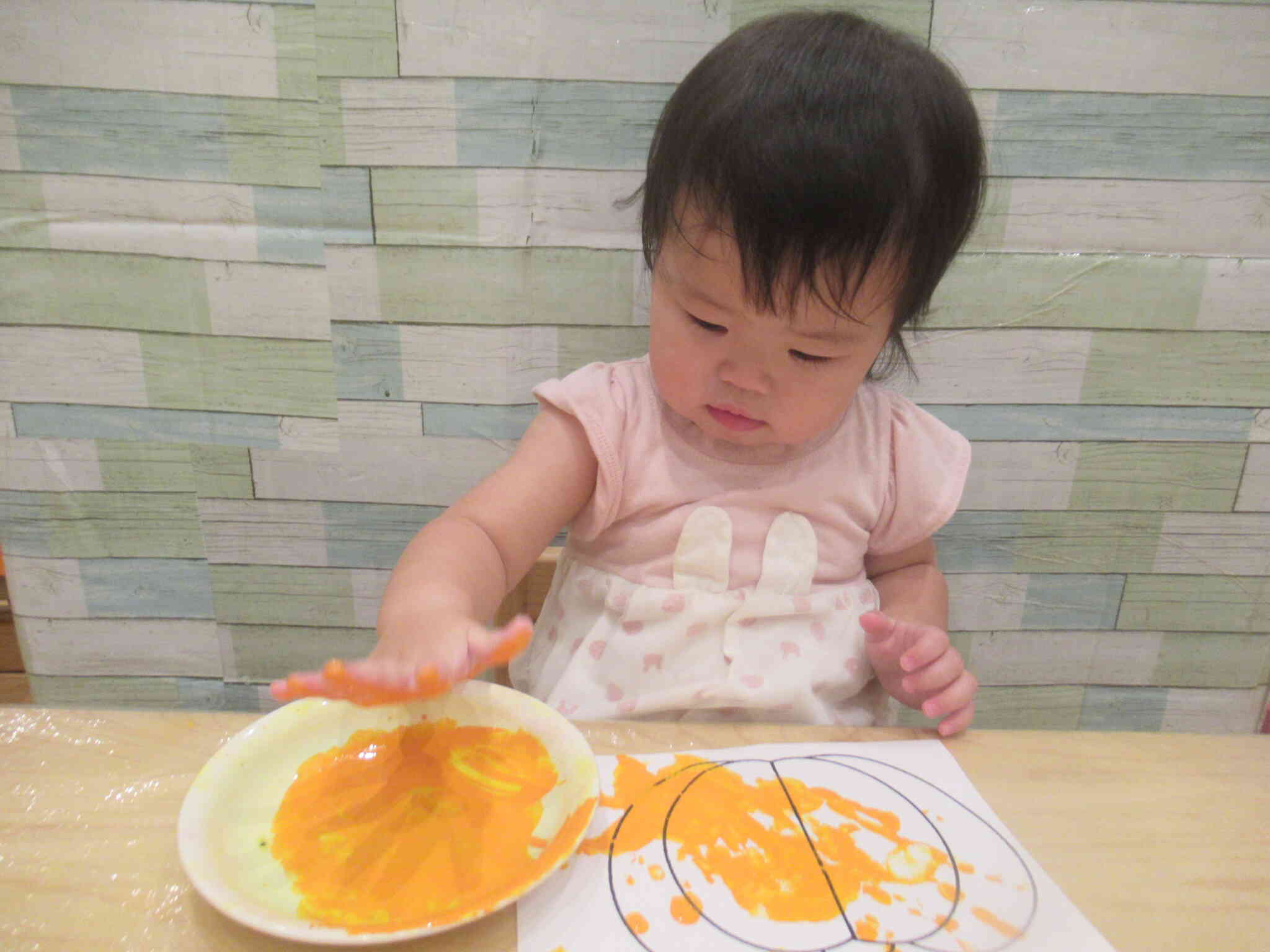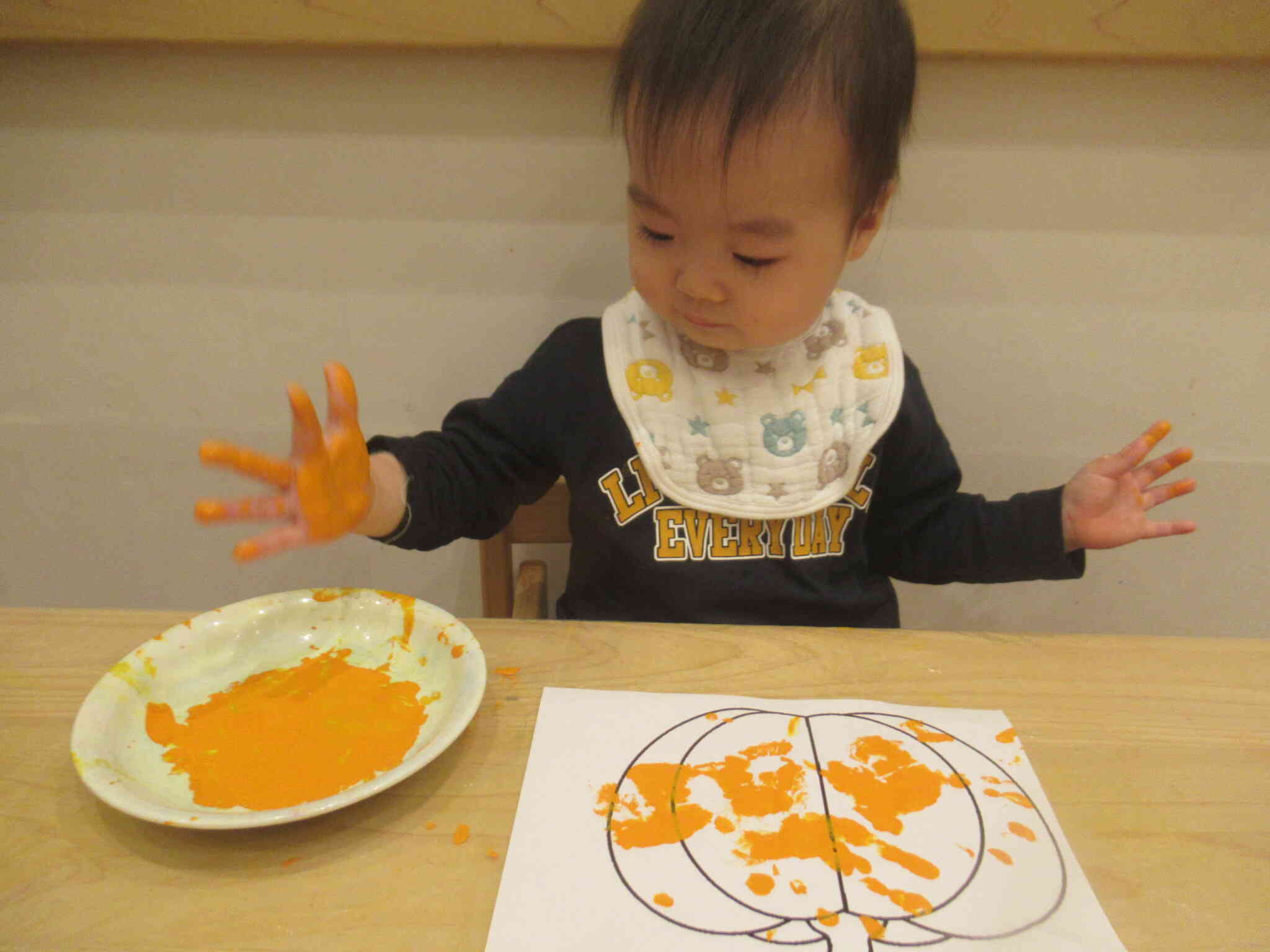 ぱんだ組さんはハンドペイントでかぼちゃに色を付けました。