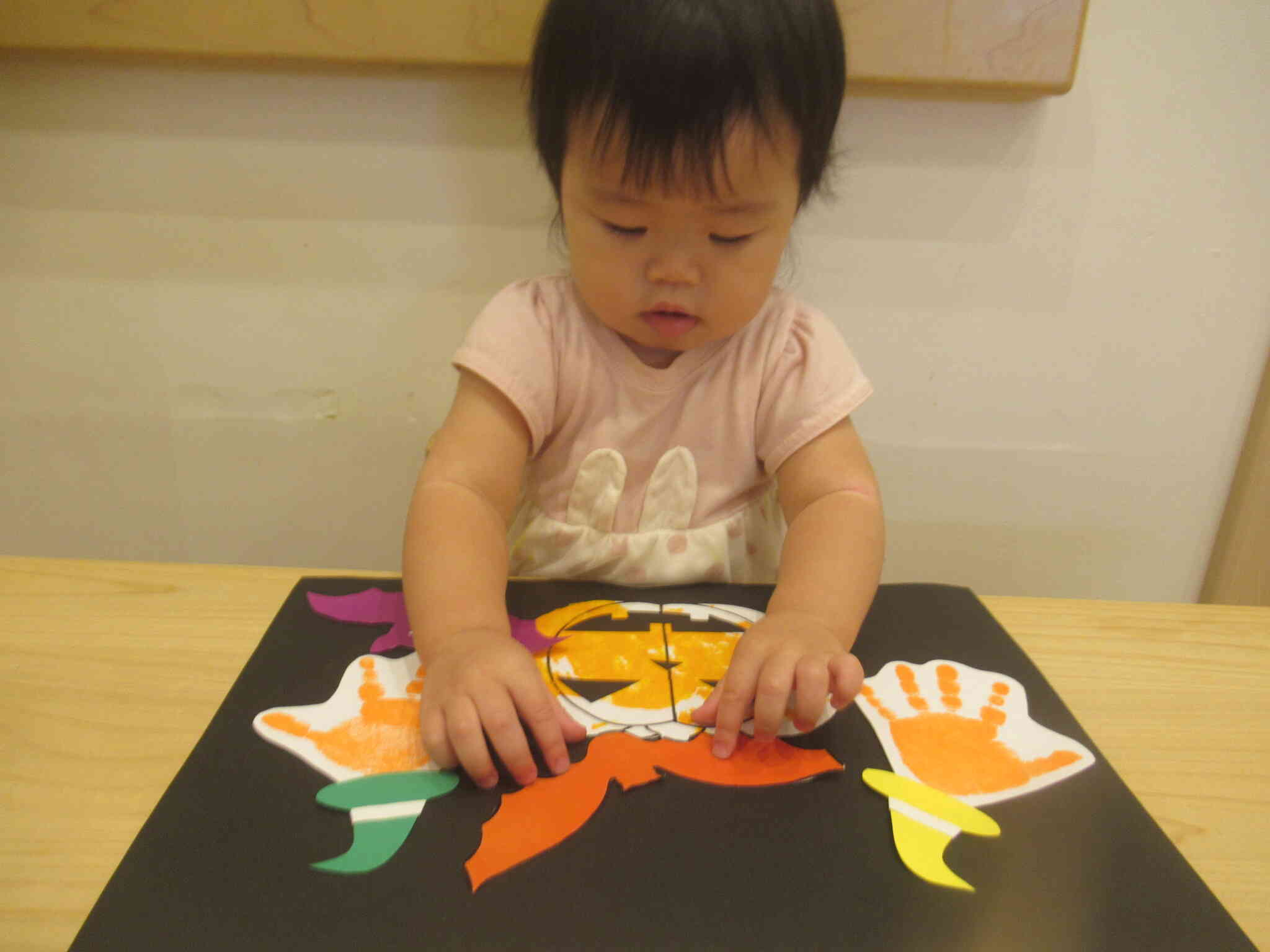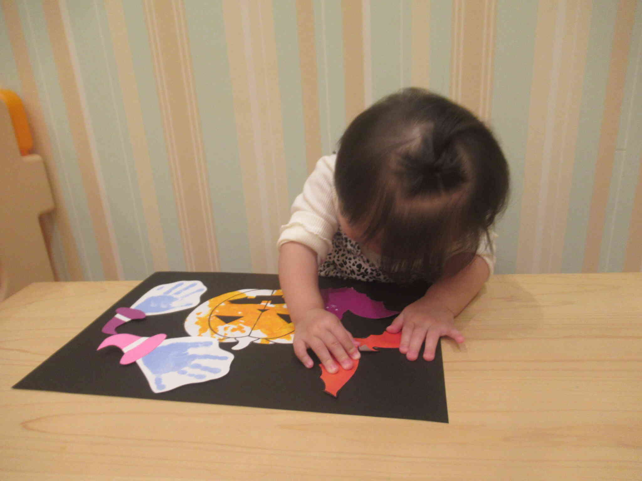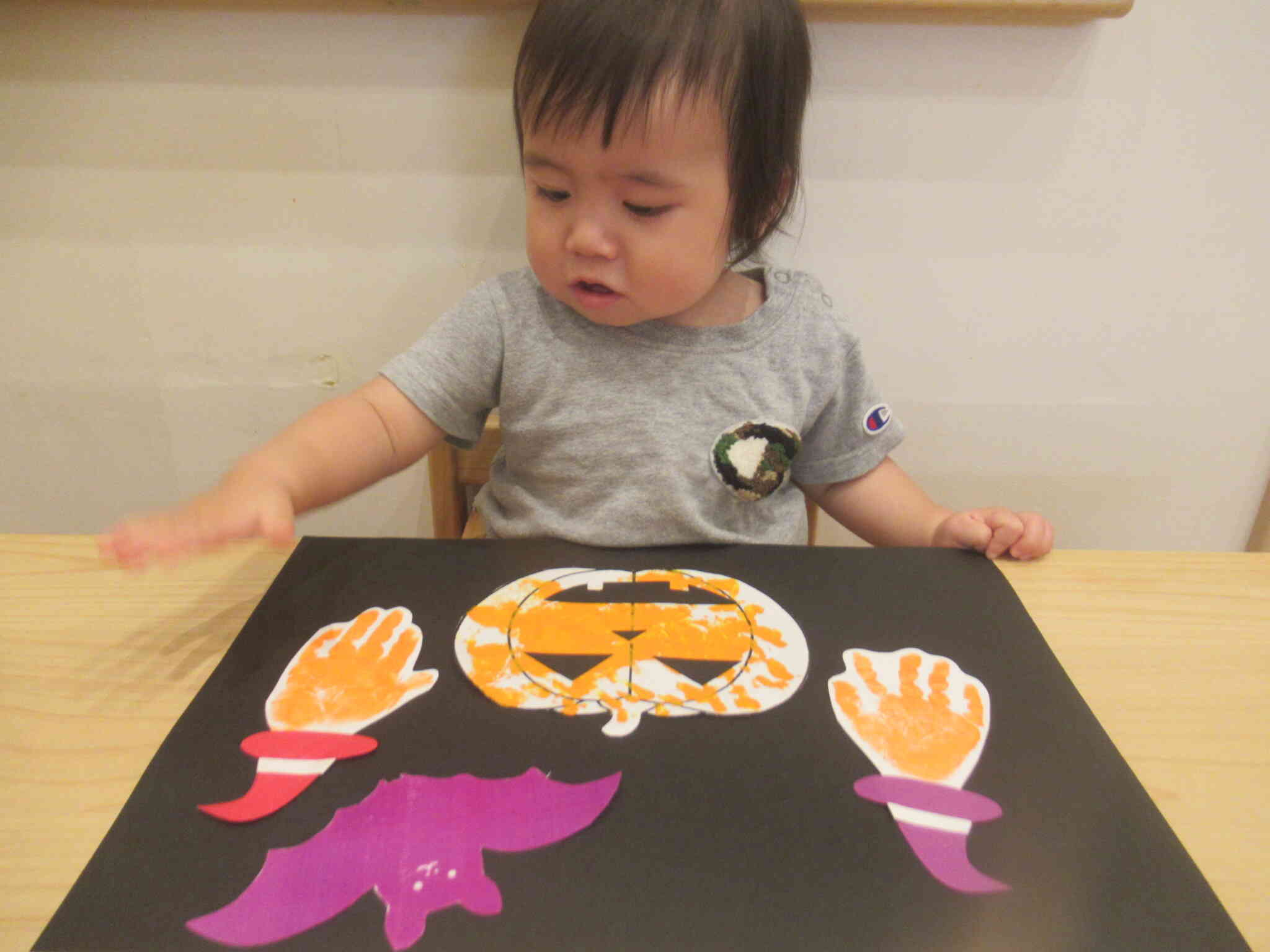 目をつけたかぼちゃの周りに手型で作ったおばけやこうもりをはったら完成です。