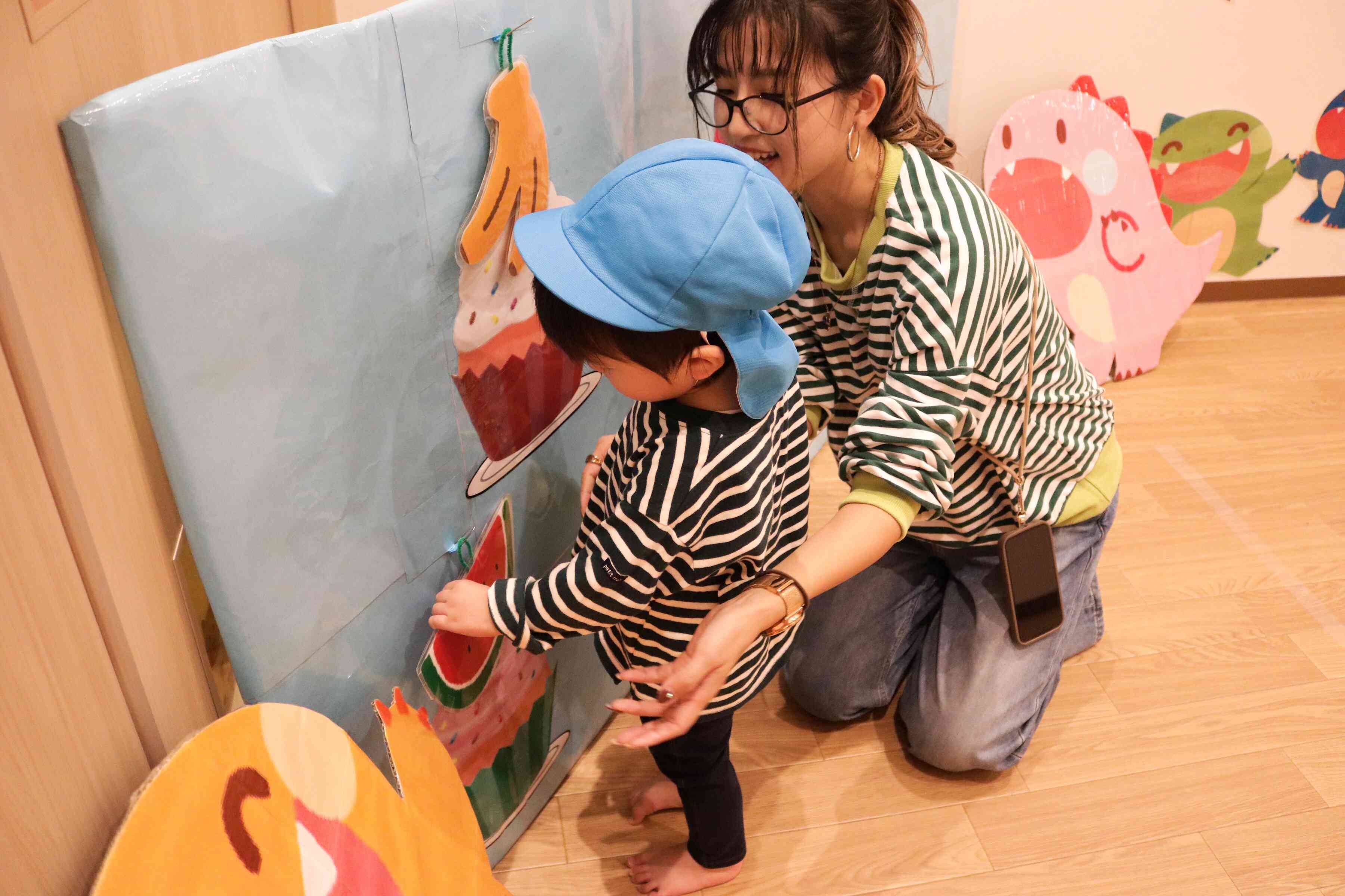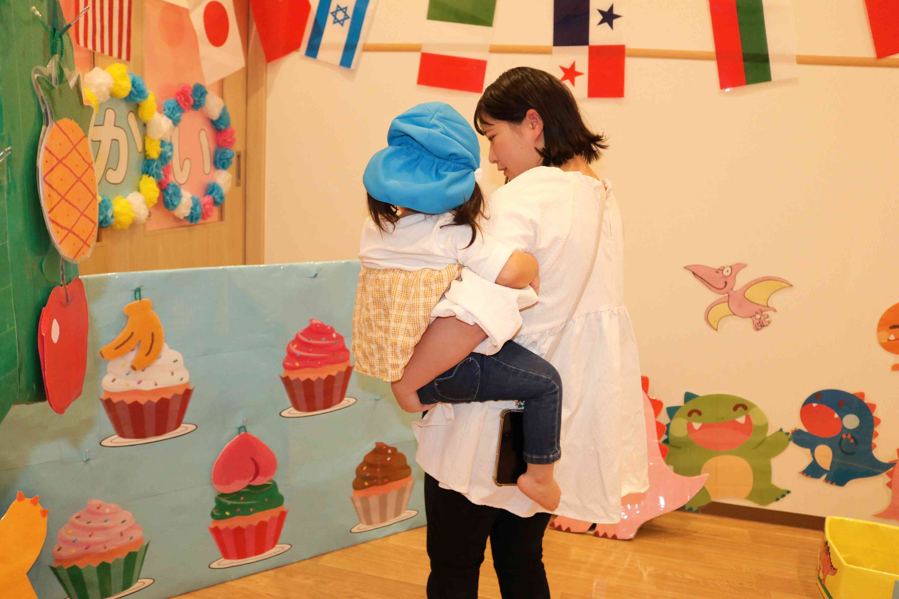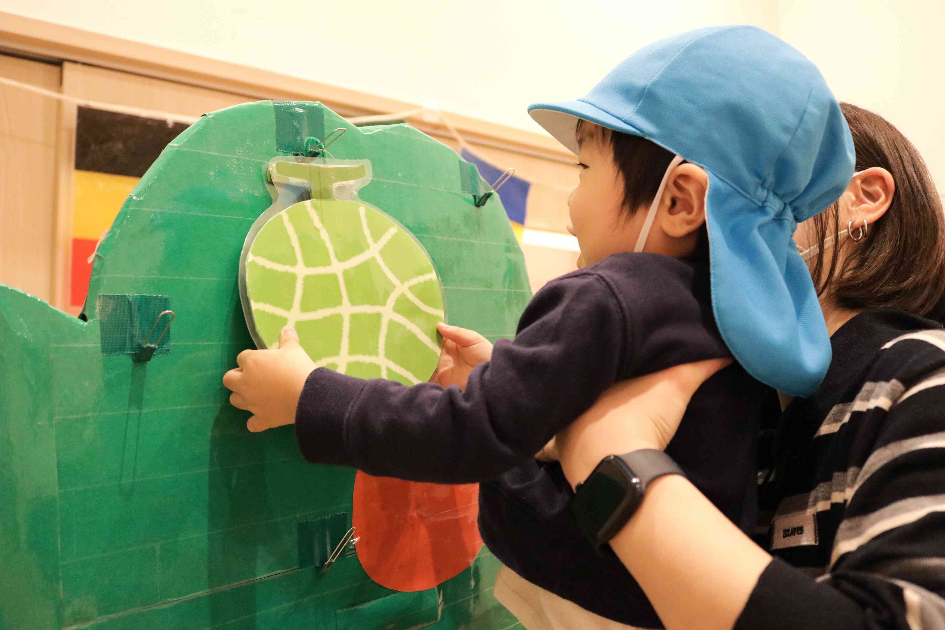 お母さんに抱っこしてもらい自分のマークのくだものをとり、ケーキに飾ります。