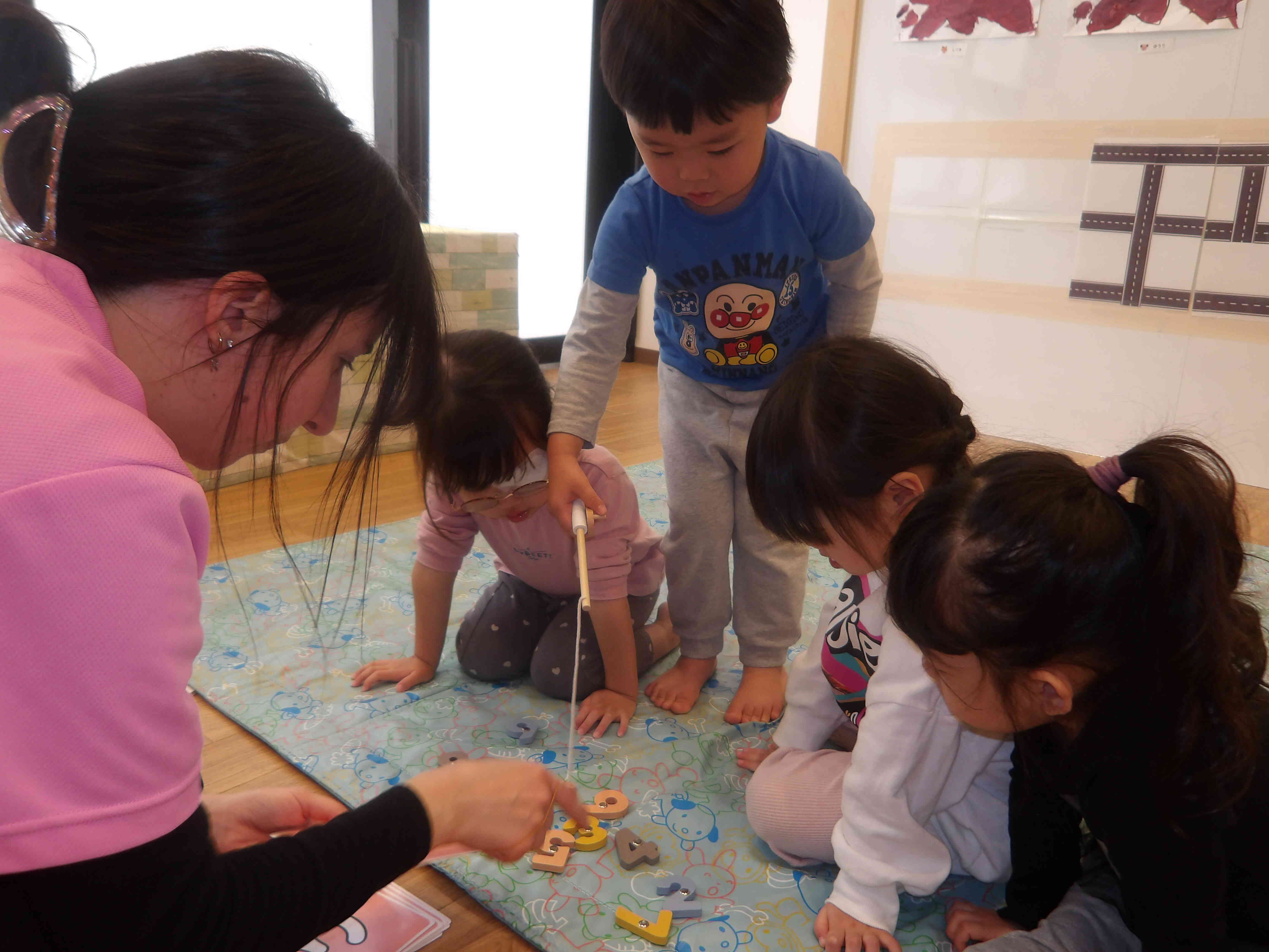 数字ブロックを釣竿を使って吊り上げています。