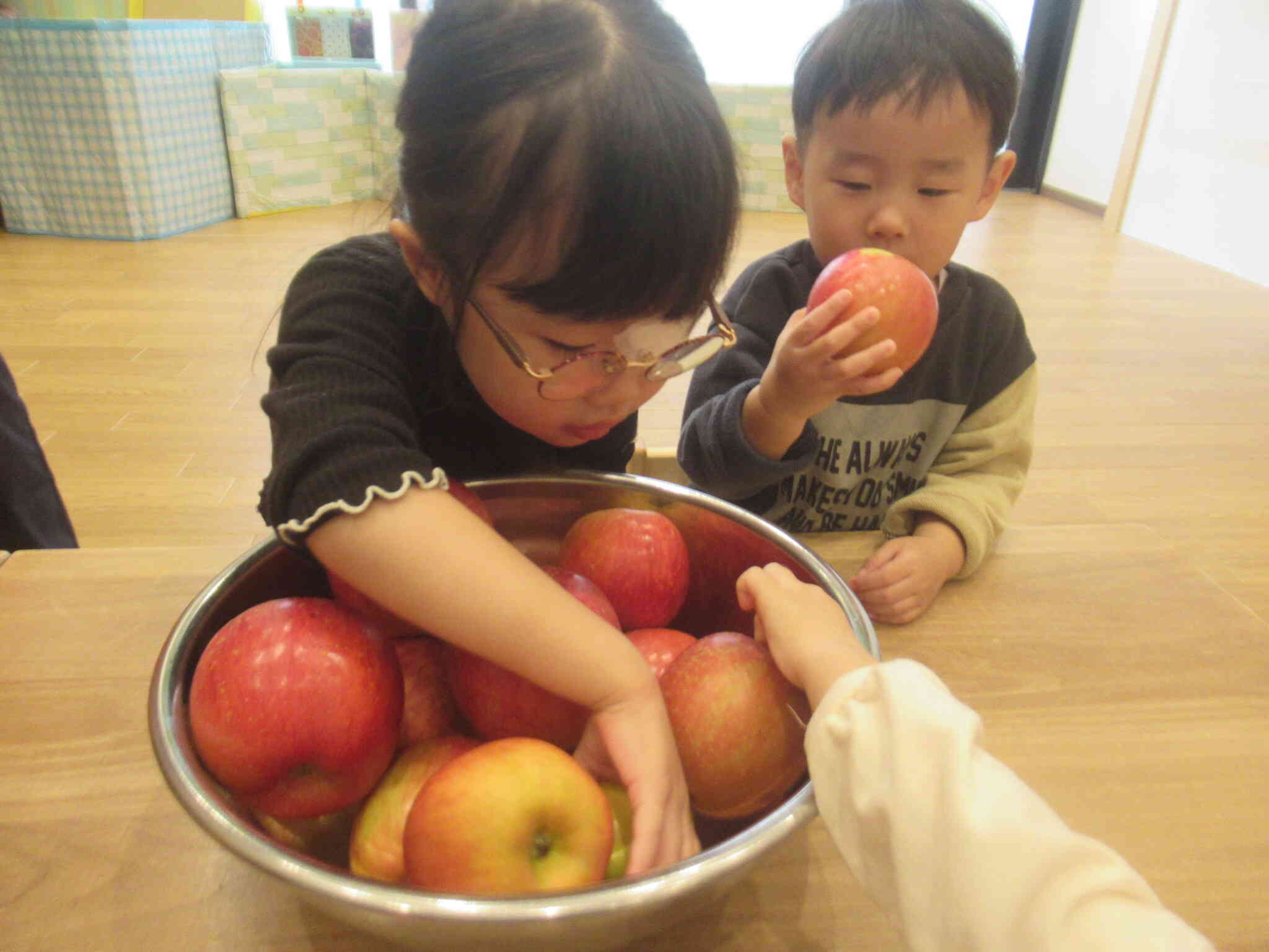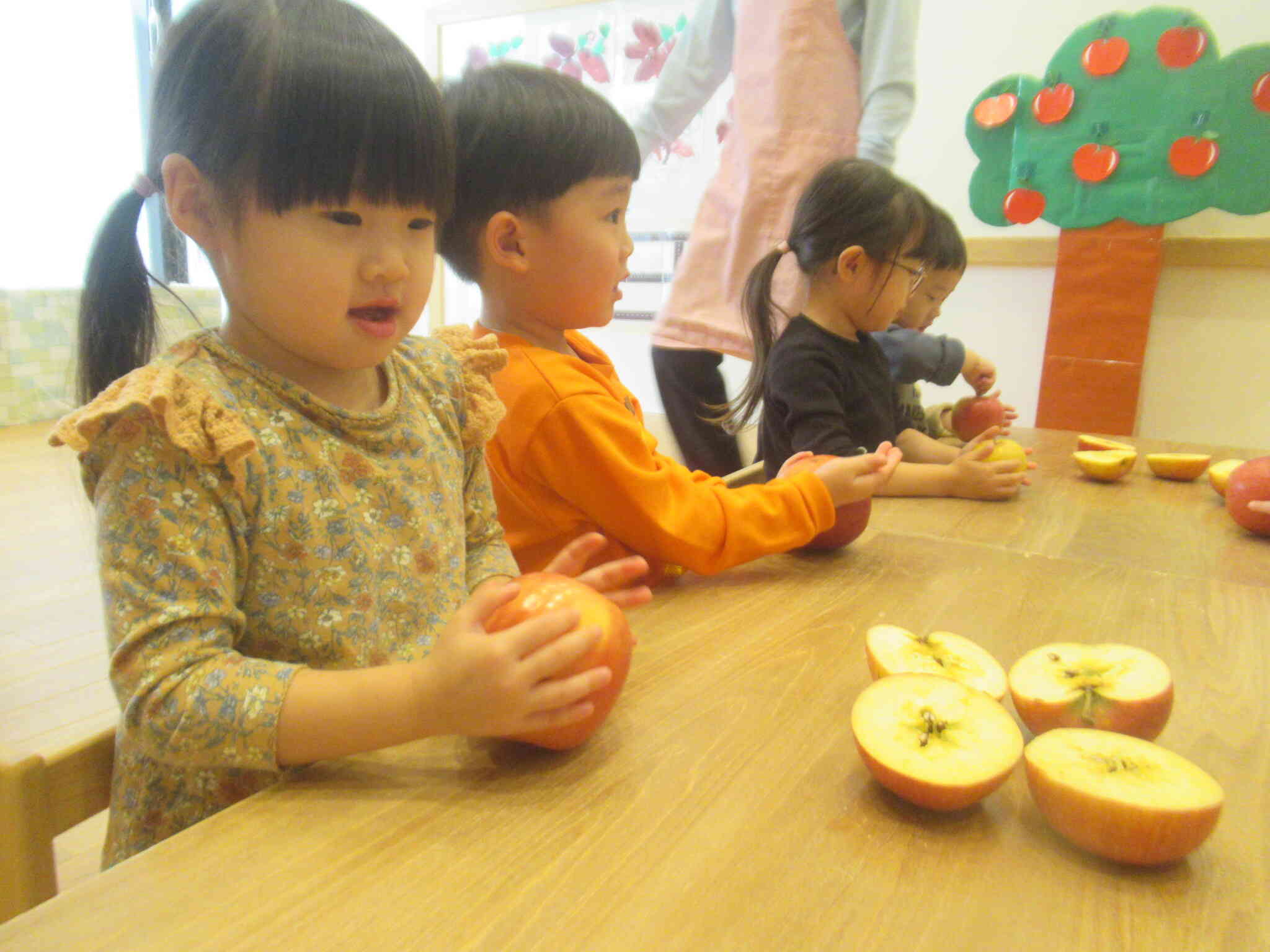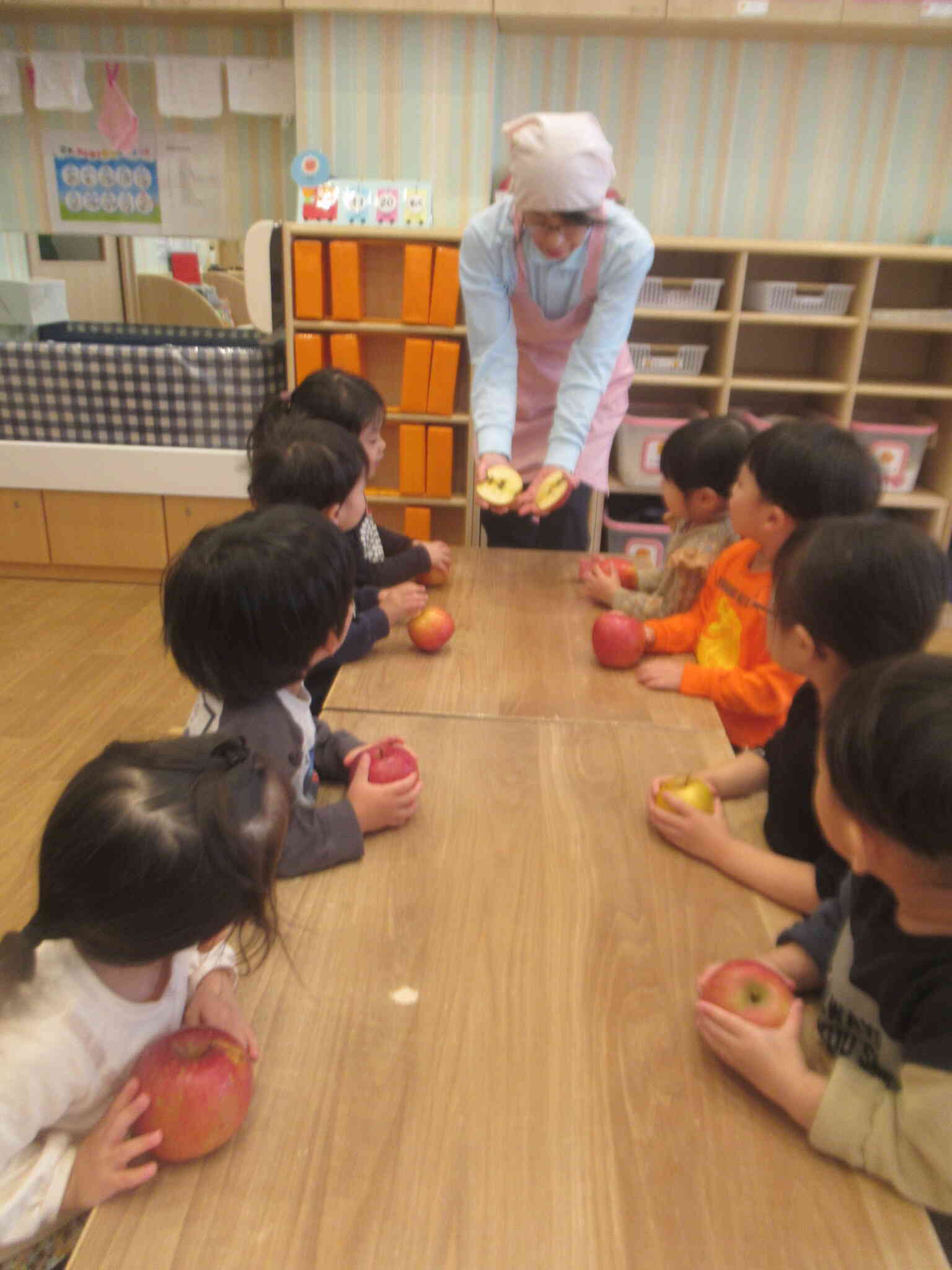 11月食育「りんごをさわろう、食べてみよう(きりん組)」