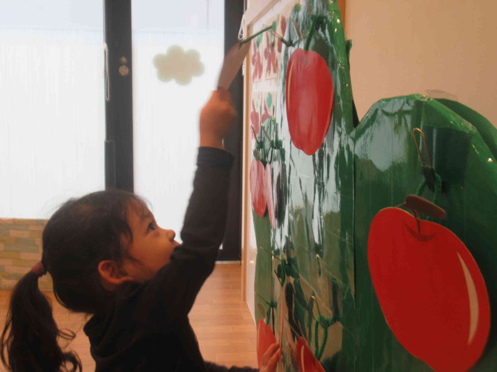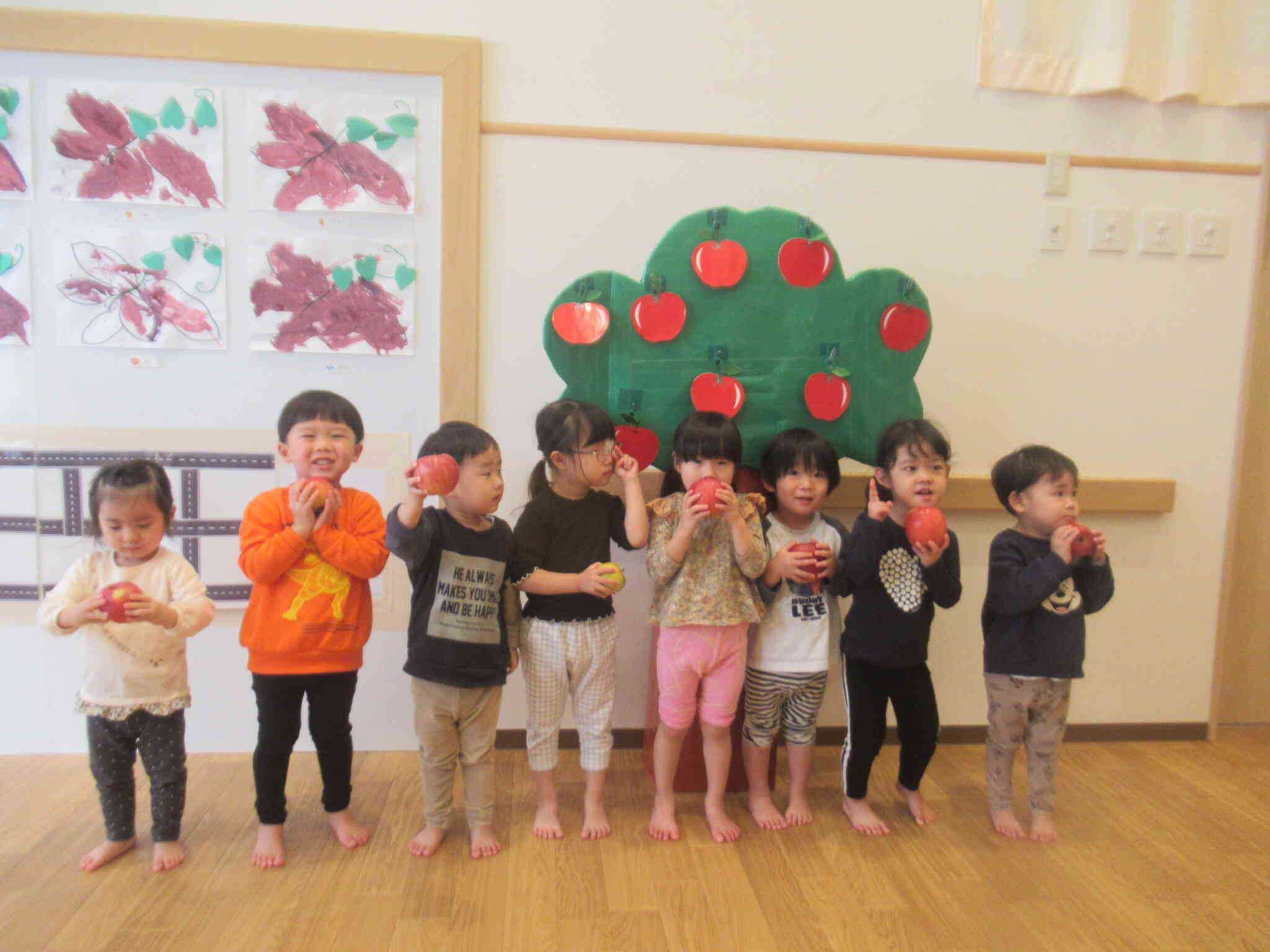 こあら組、きりん組のお友だちはりんごをさわる前に「りんご狩りごっこ」を楽しみました。