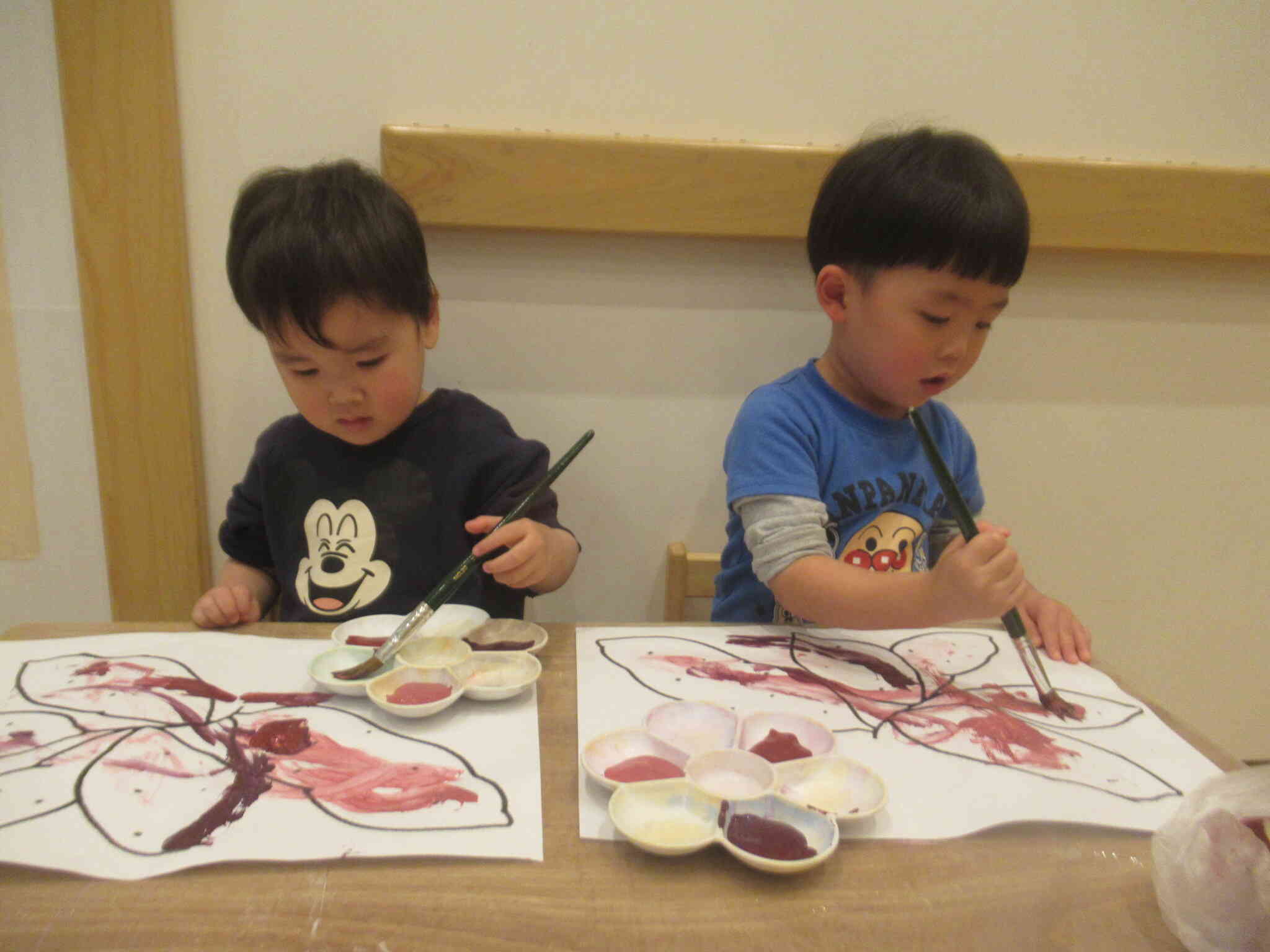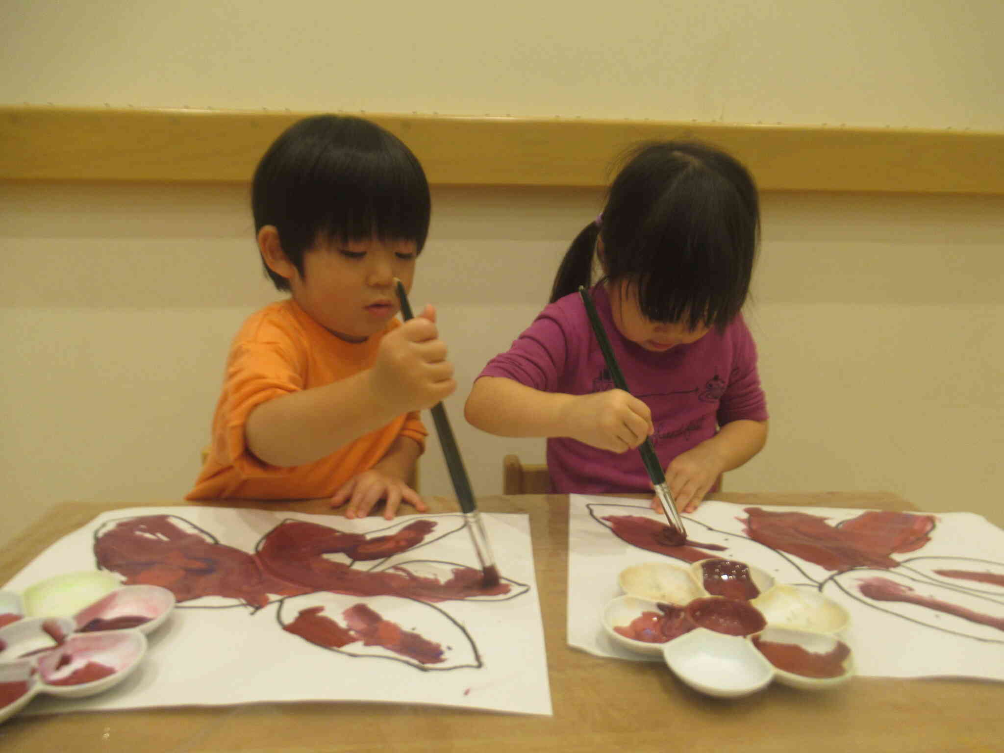 大きな紙に描かれたさつまいもに絵具を使って色塗りをしました。