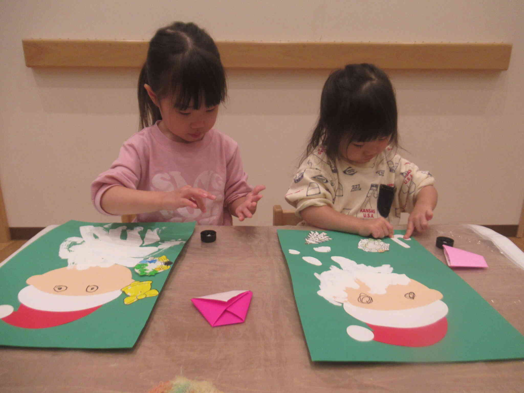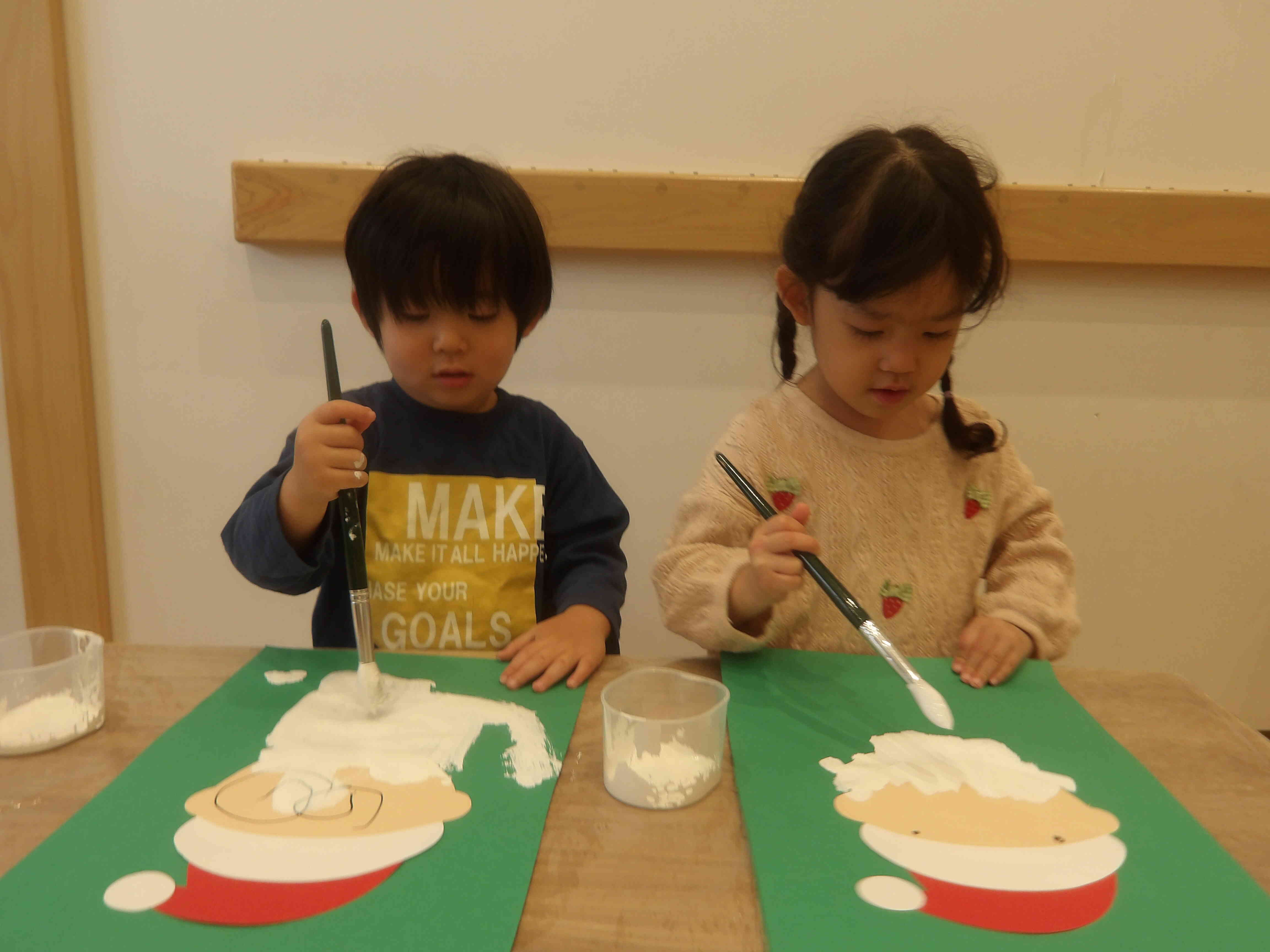 きりん組さんはサンタさんの顔をクレヨンで書き、ひげを絵具で塗りました。