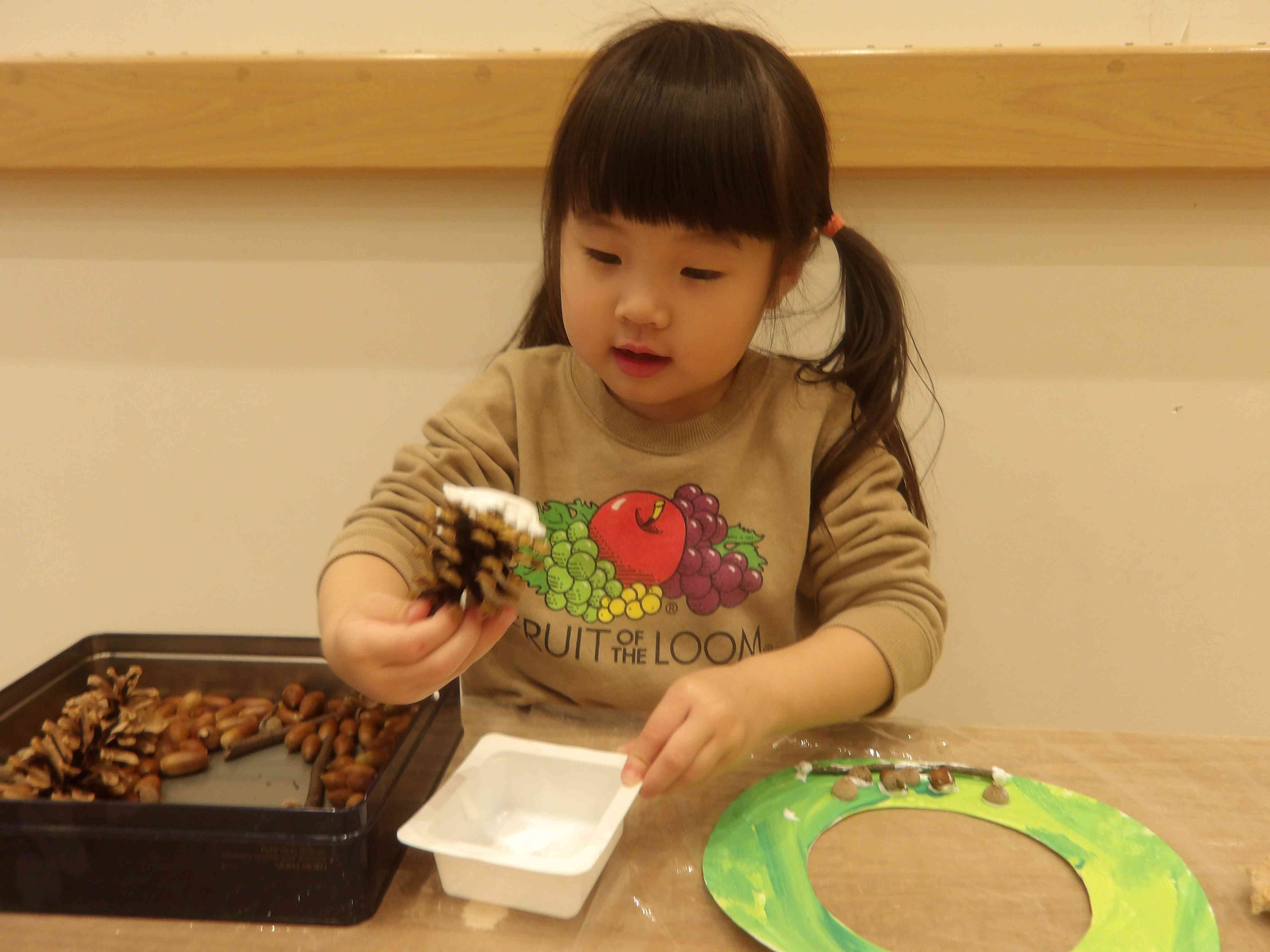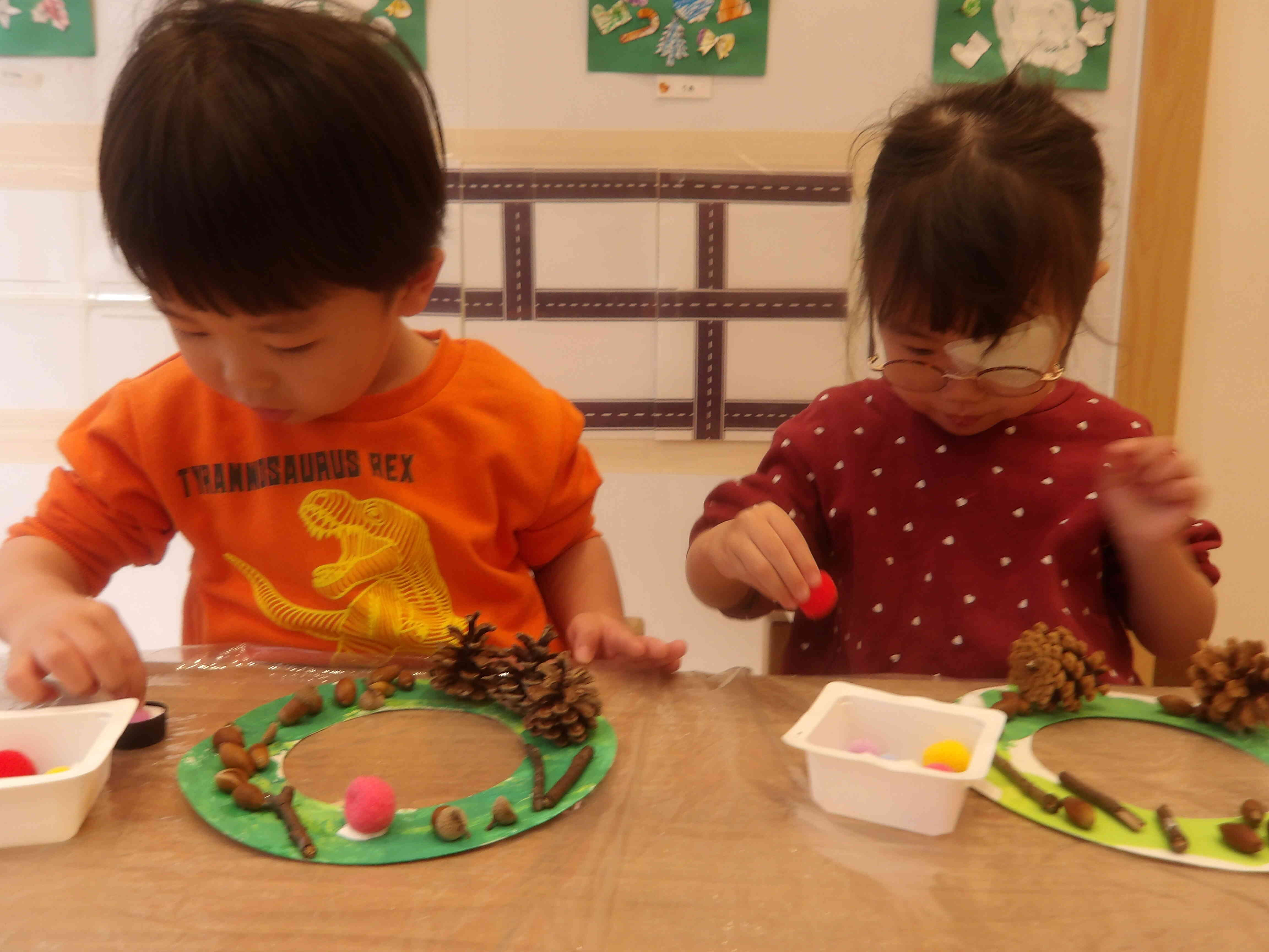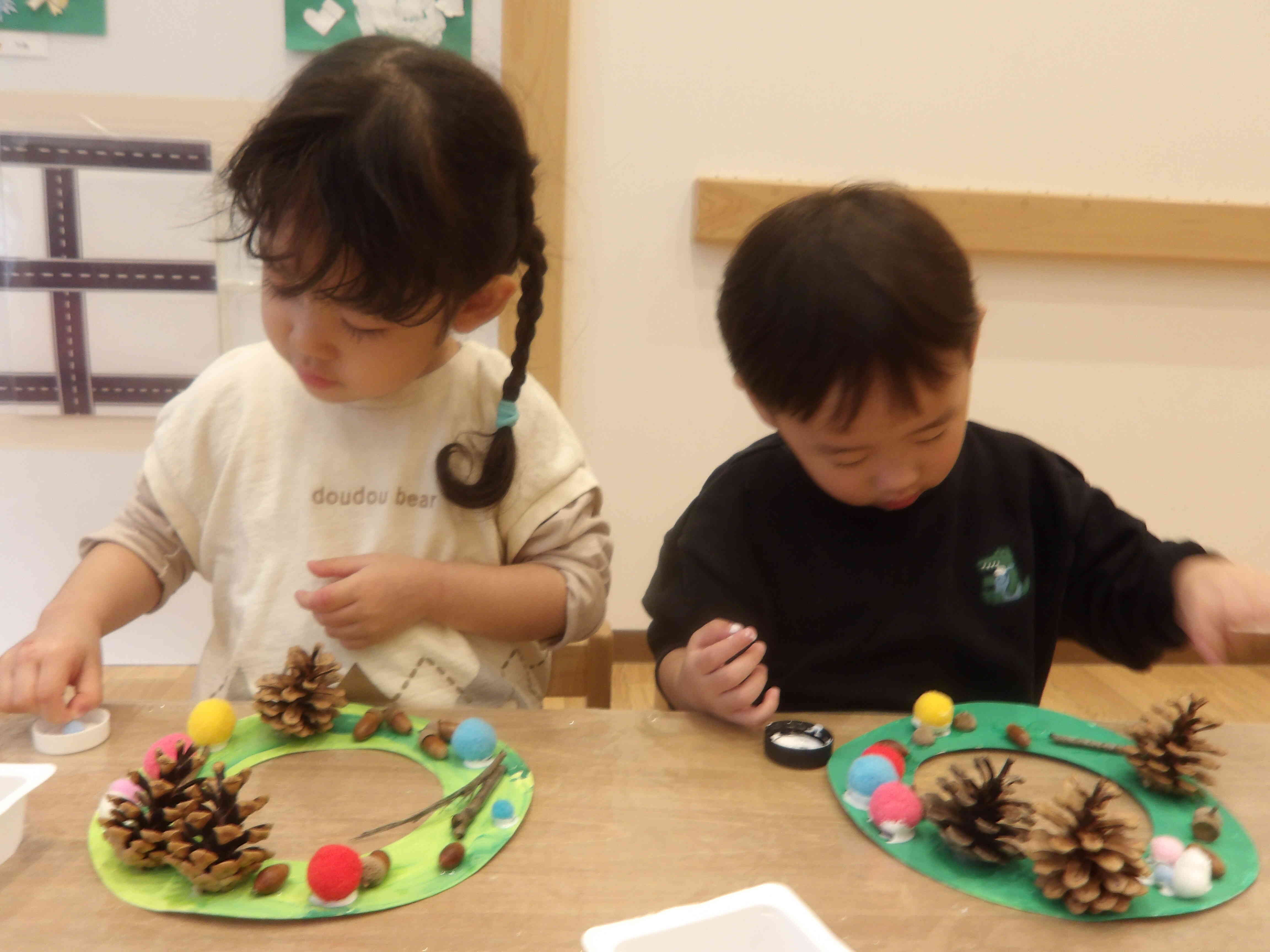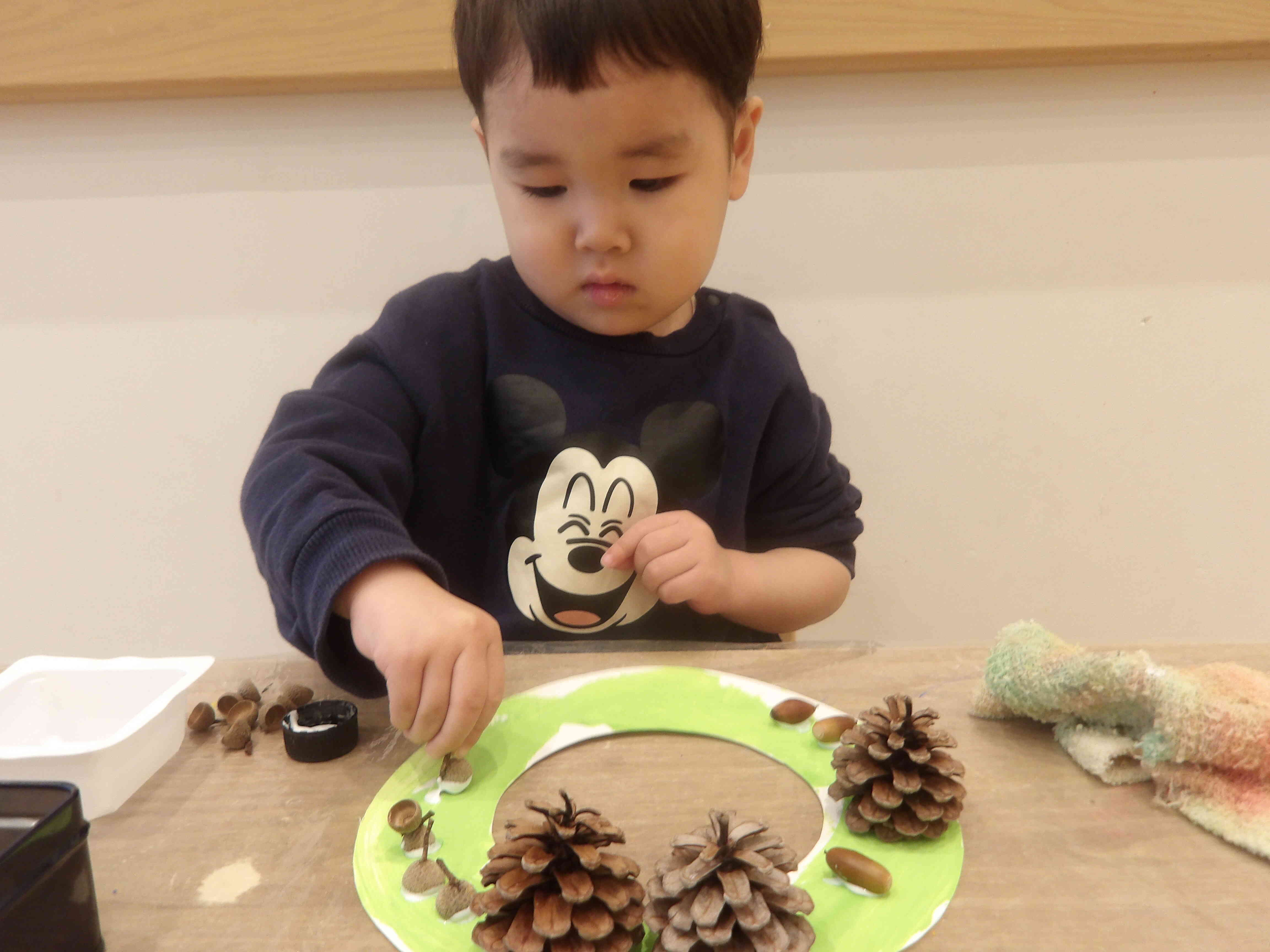 絵具が乾いたら松ぼっくりやどんぐり、小枝、ポンポンなどをボンドを使って付けていきます。