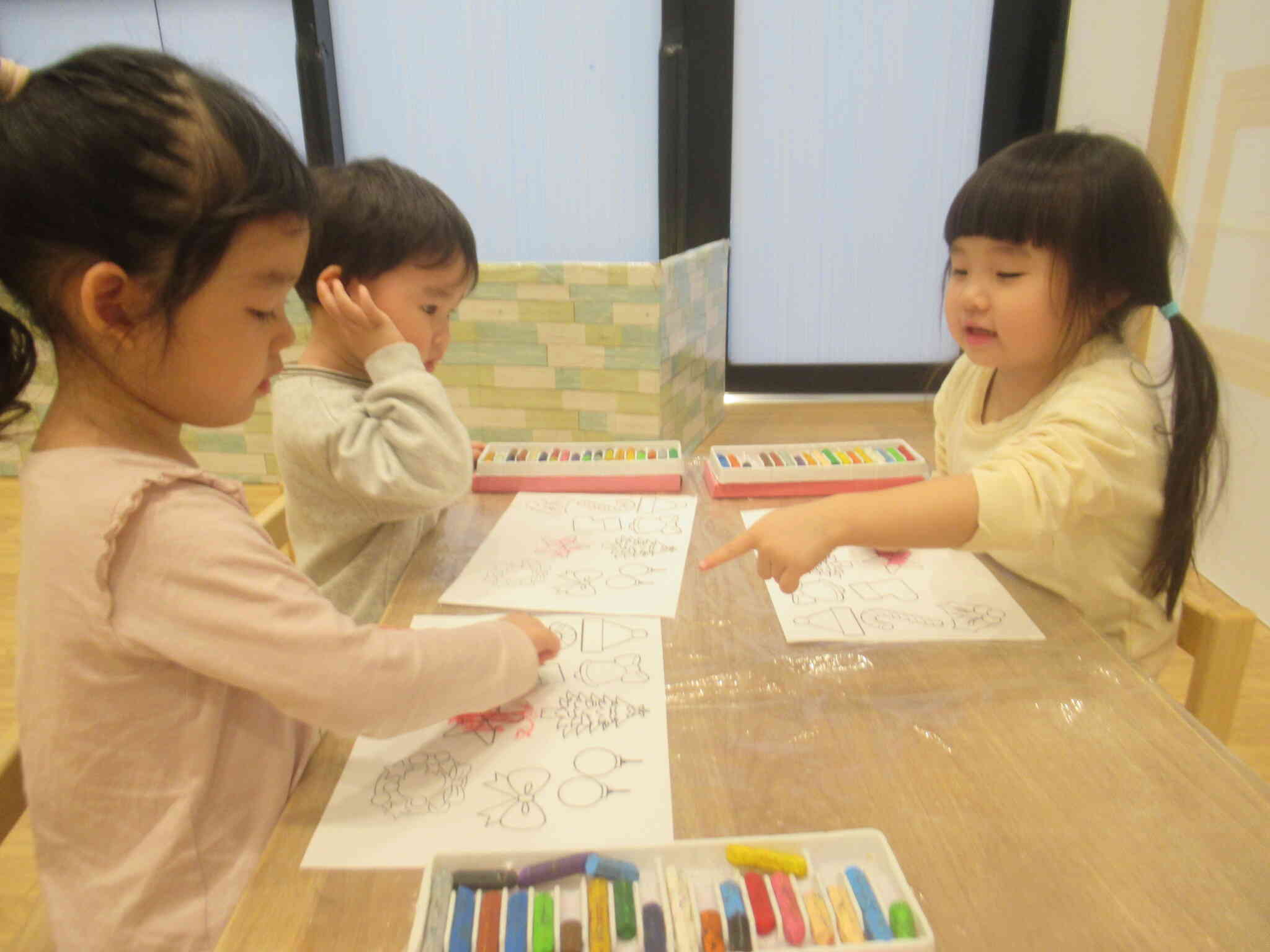 サンタクロースの周りに飾るオーナメントに、クレヨンで色塗りをしました。