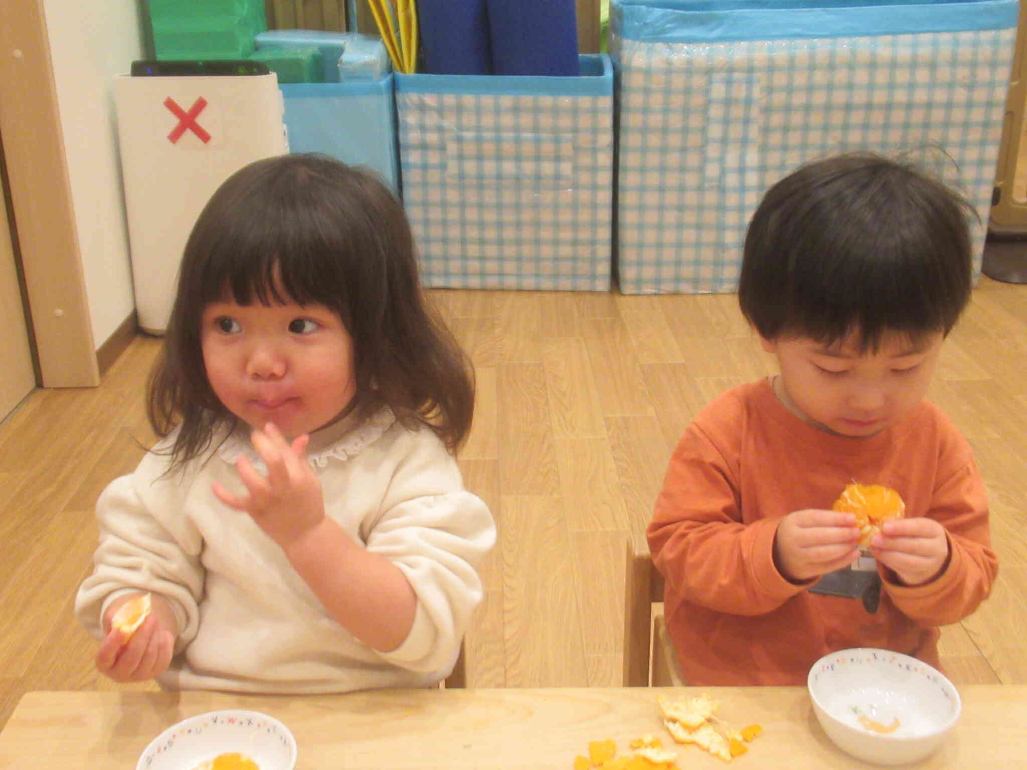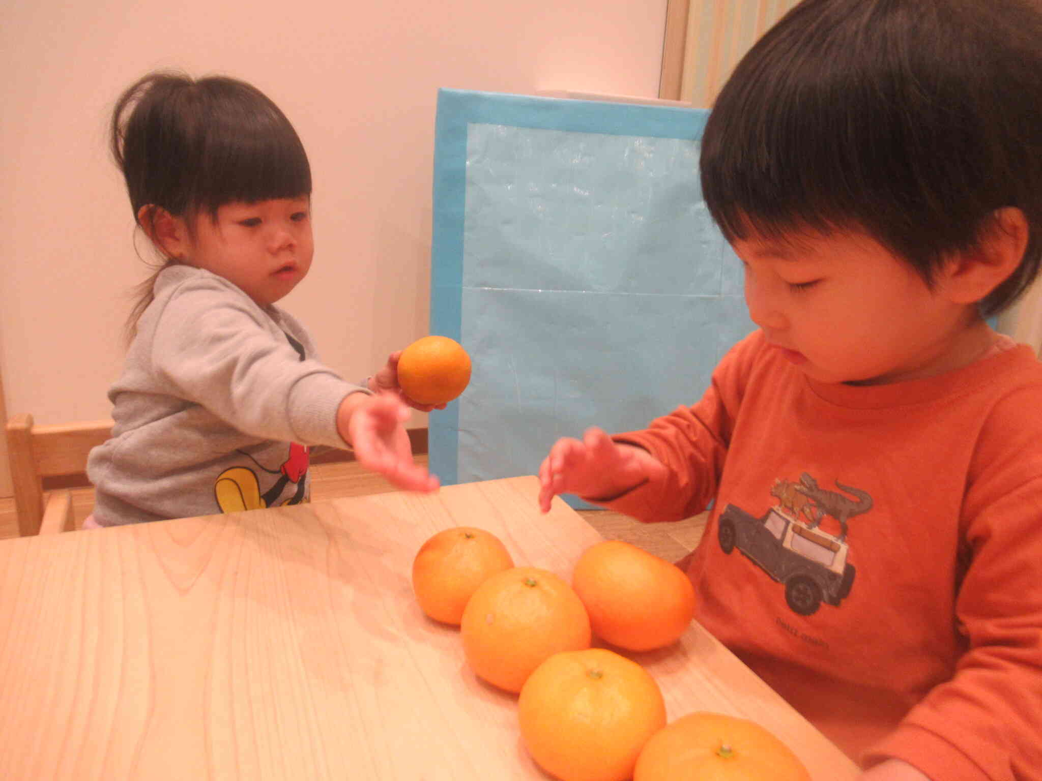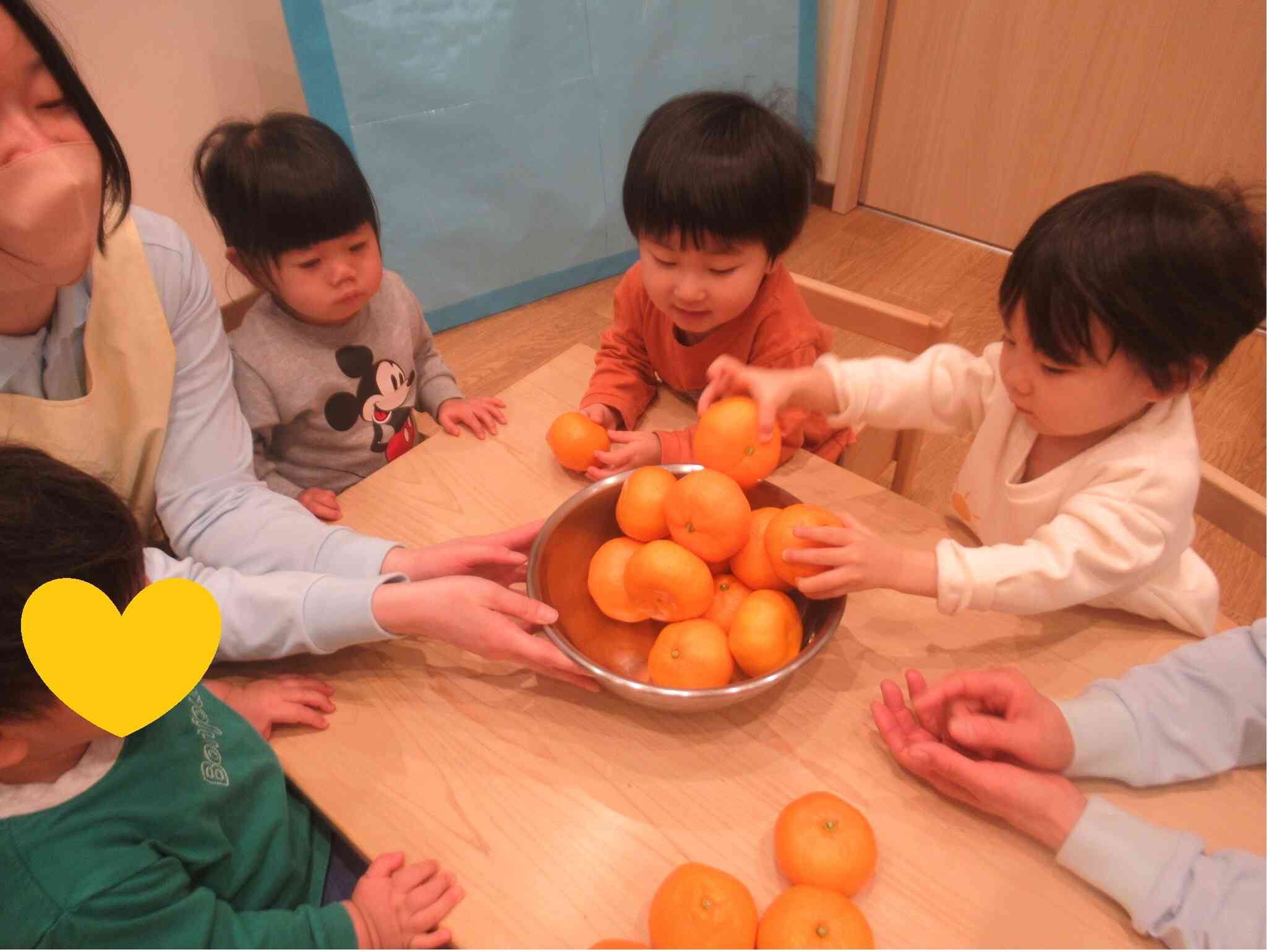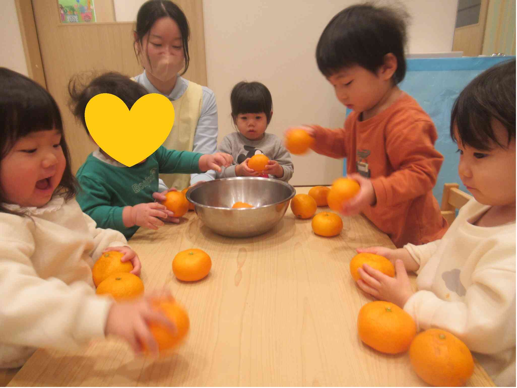 こあら組さんは、机にみかん並べたり、みかんの上にみかんを置いてみようとしてみたりしていました。