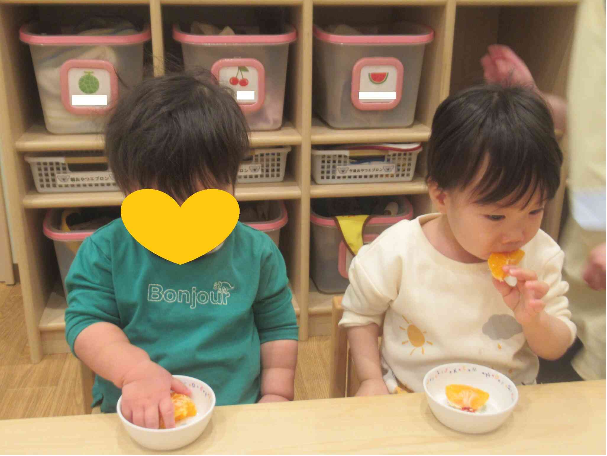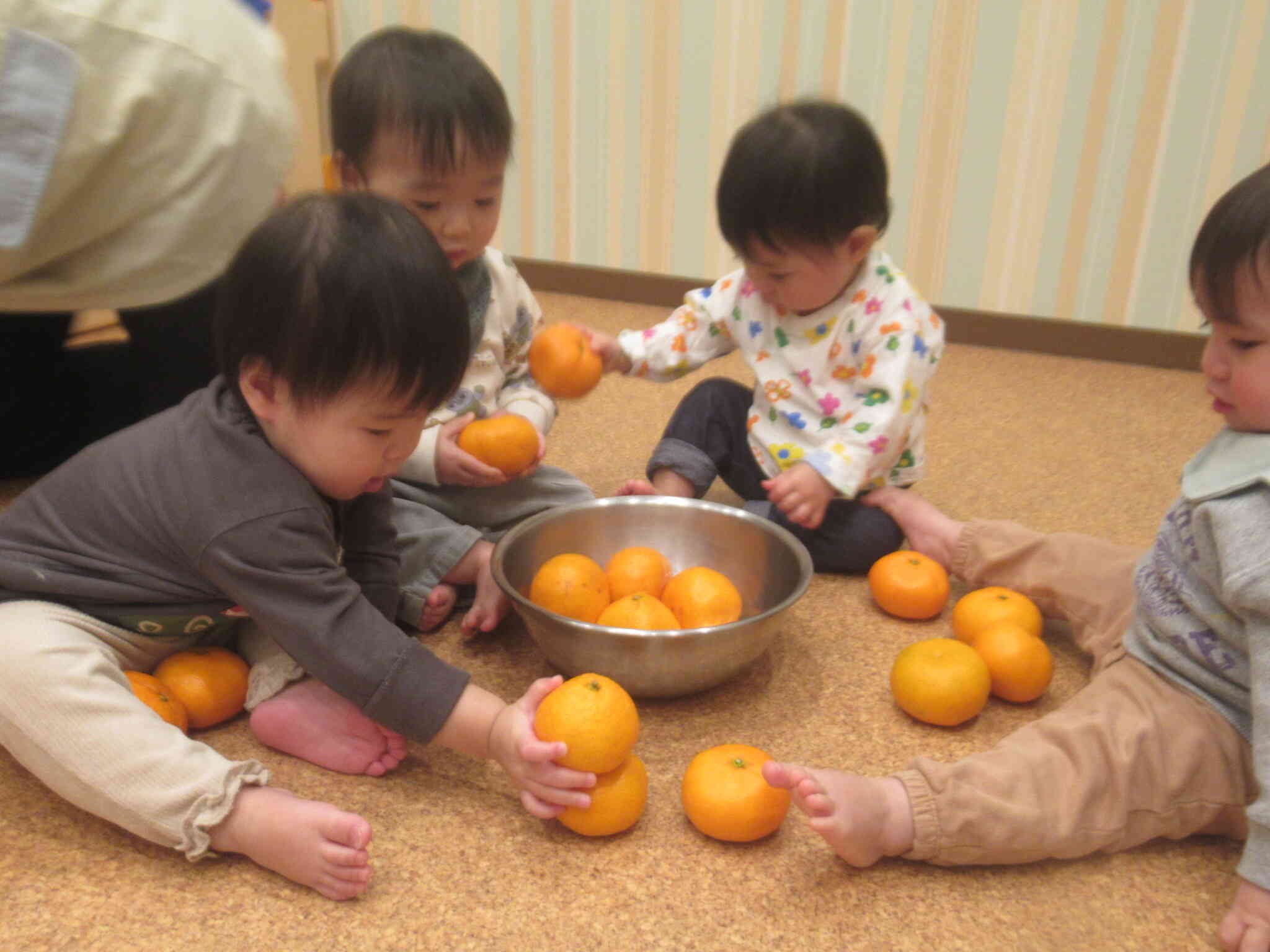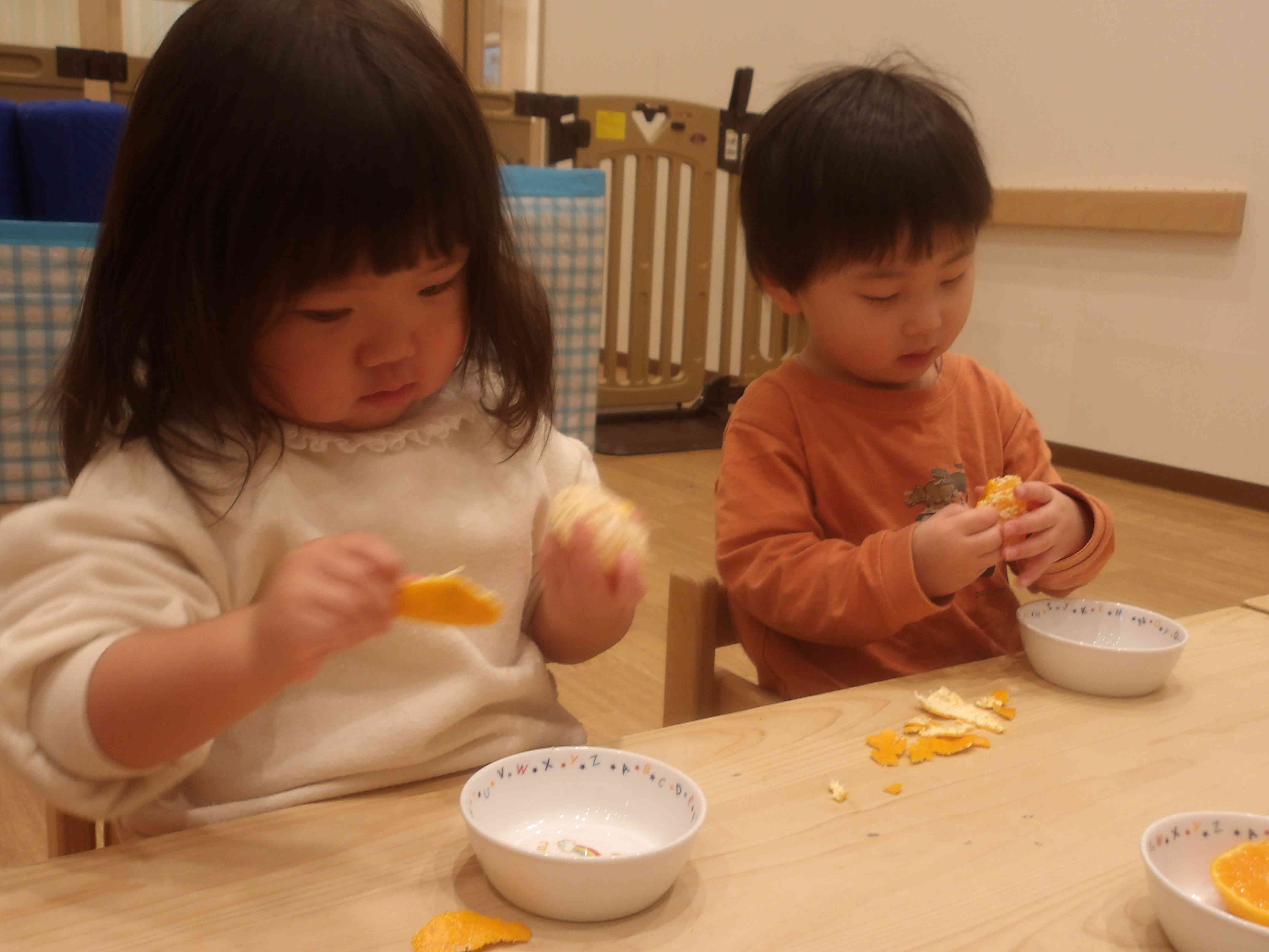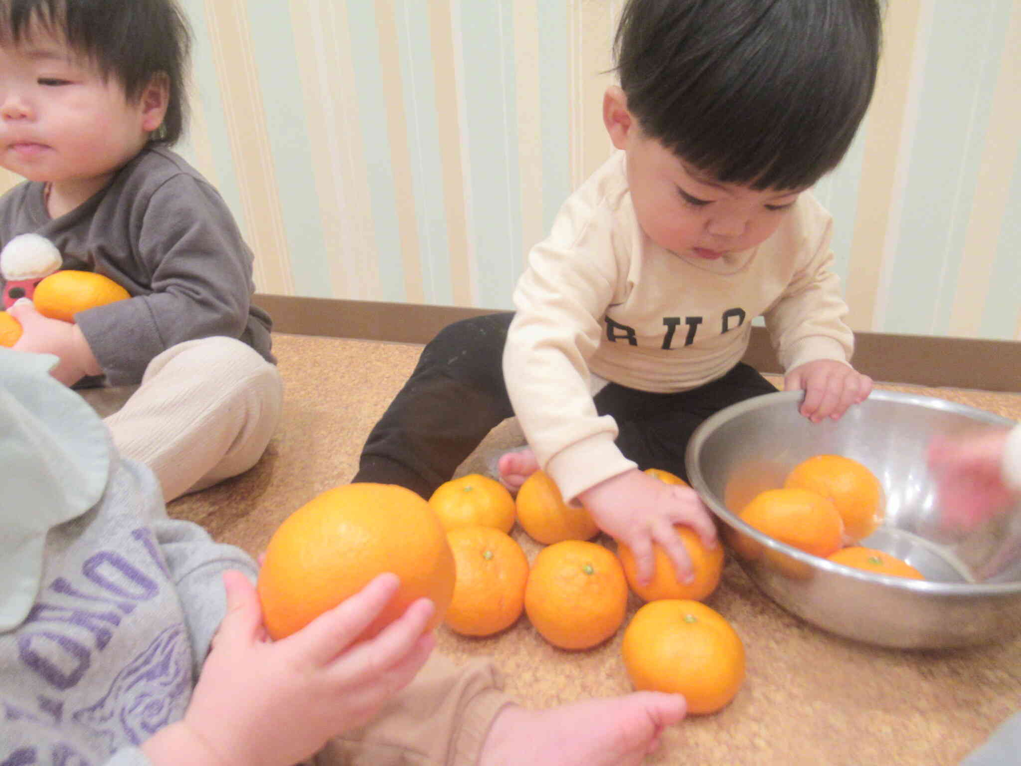 ぱんだ組さんはボウルいっぱいに入っていたみかんを1つずつ出したり戻したりして楽しんでいました