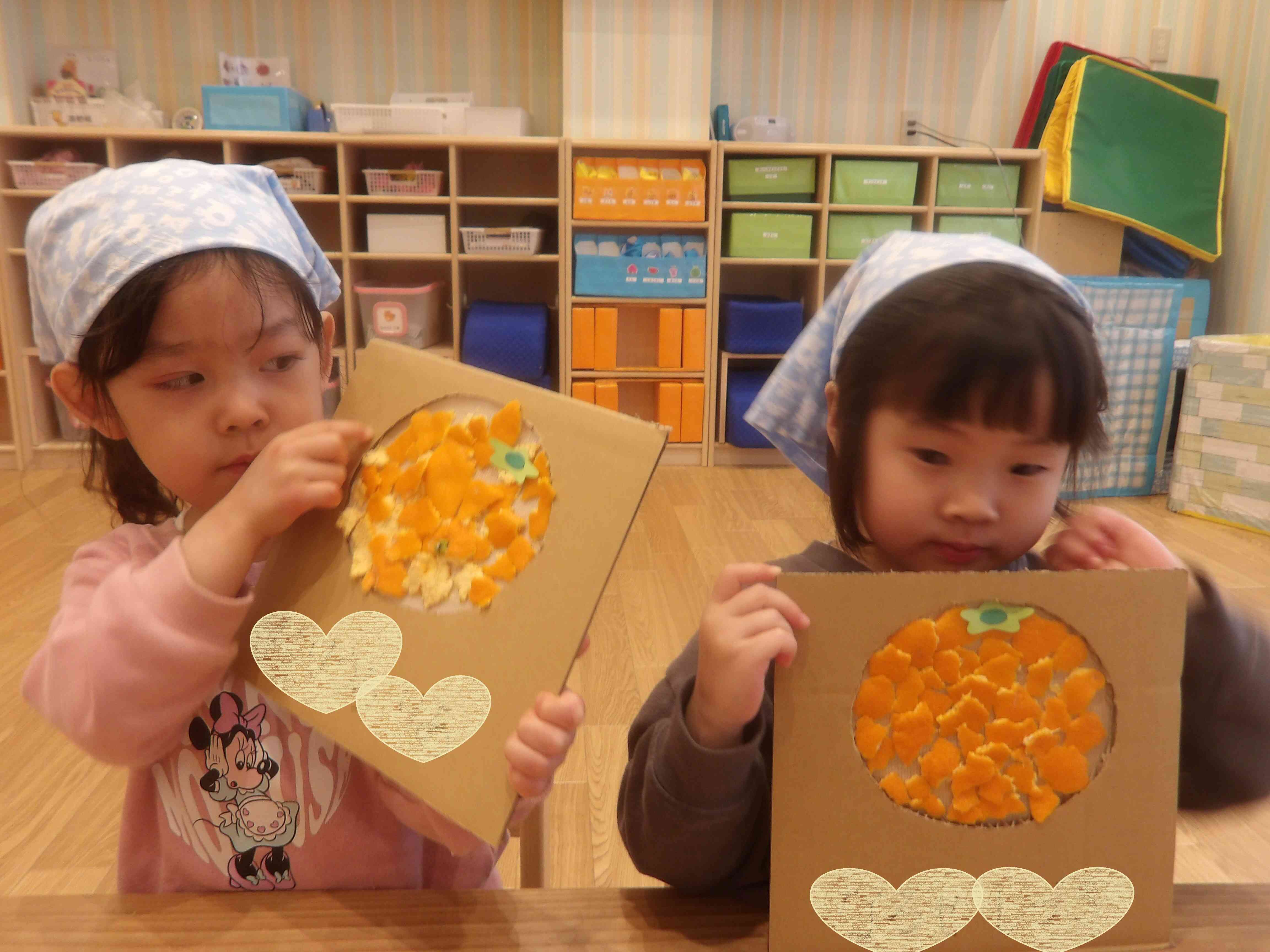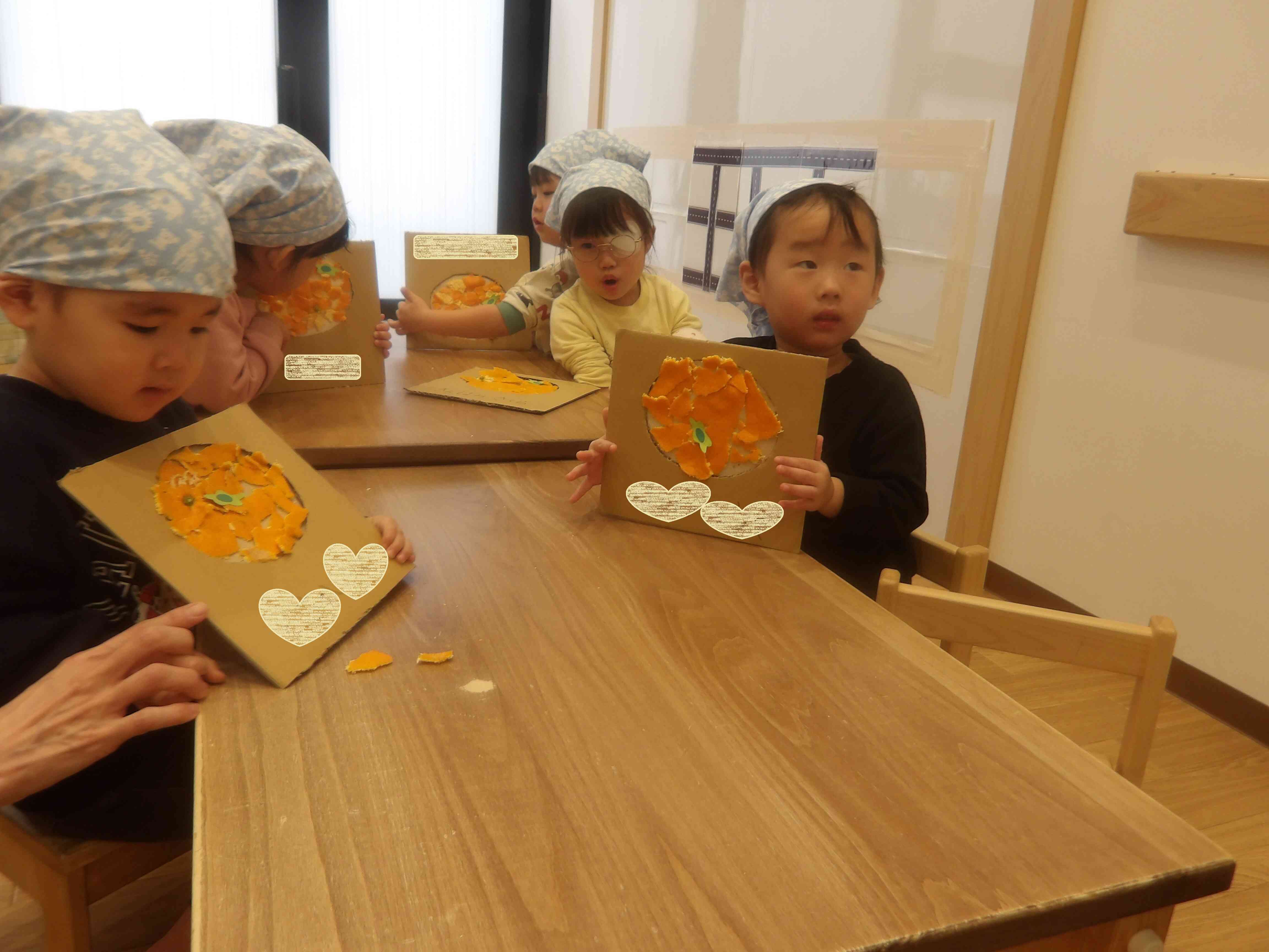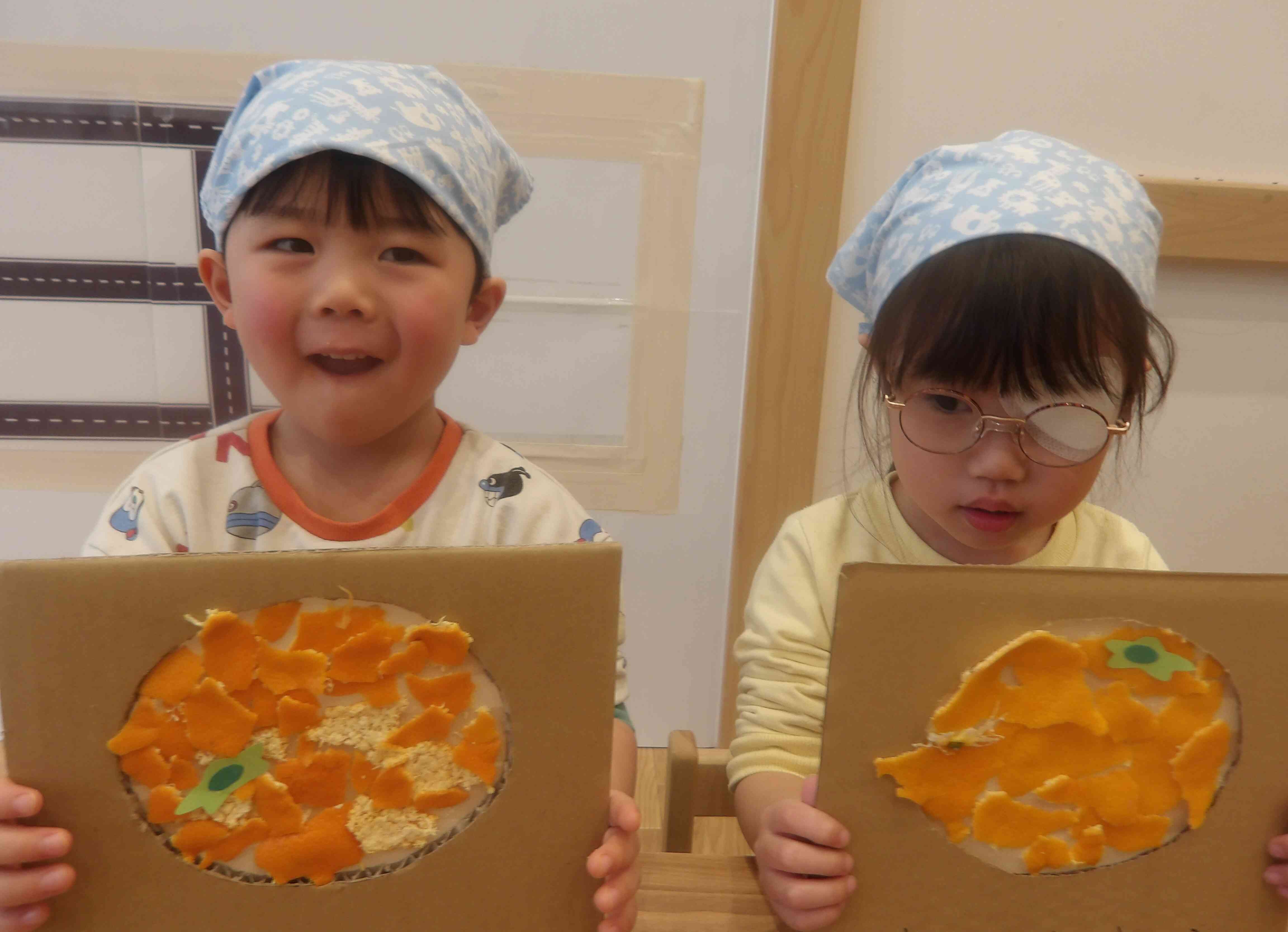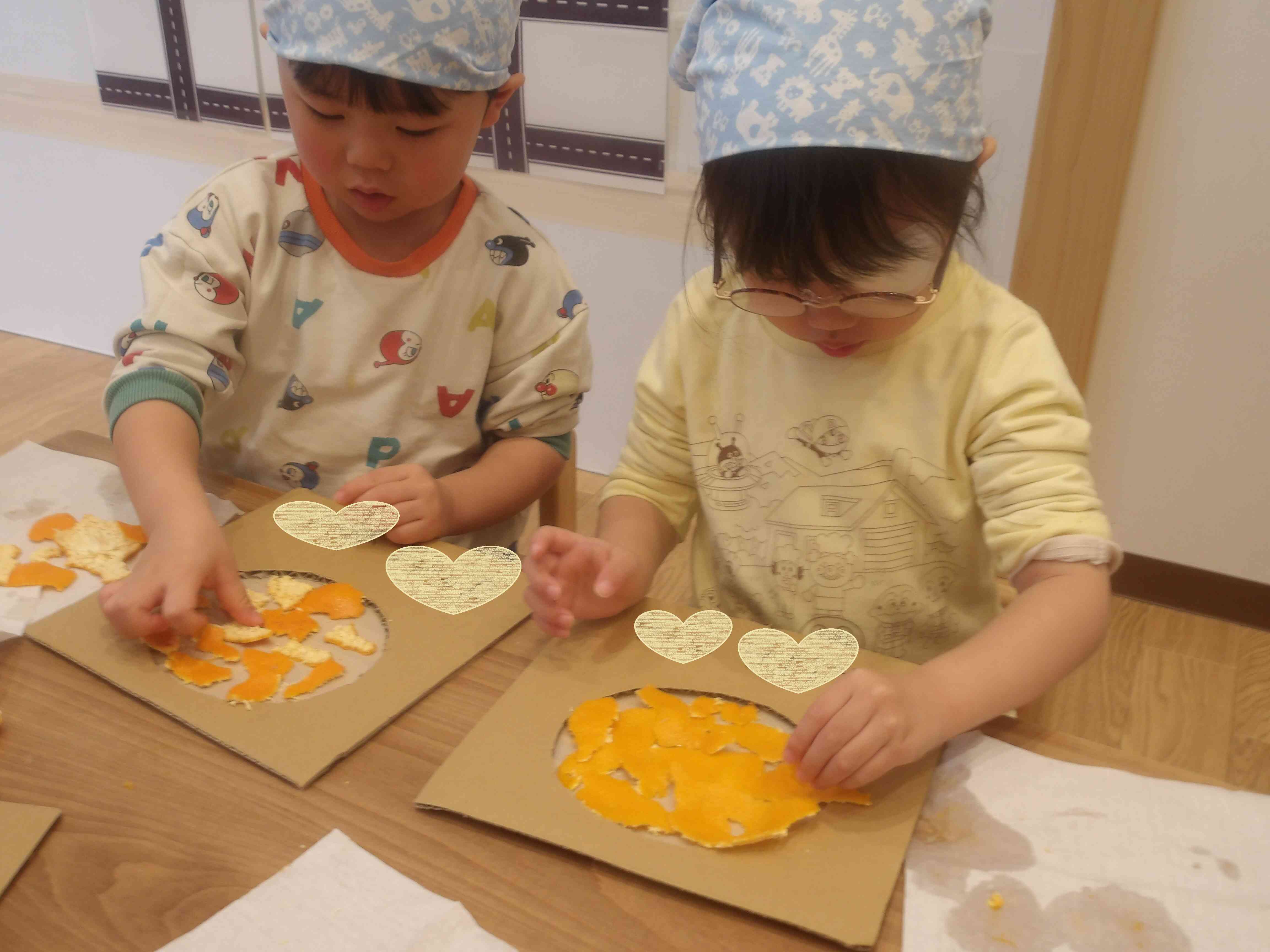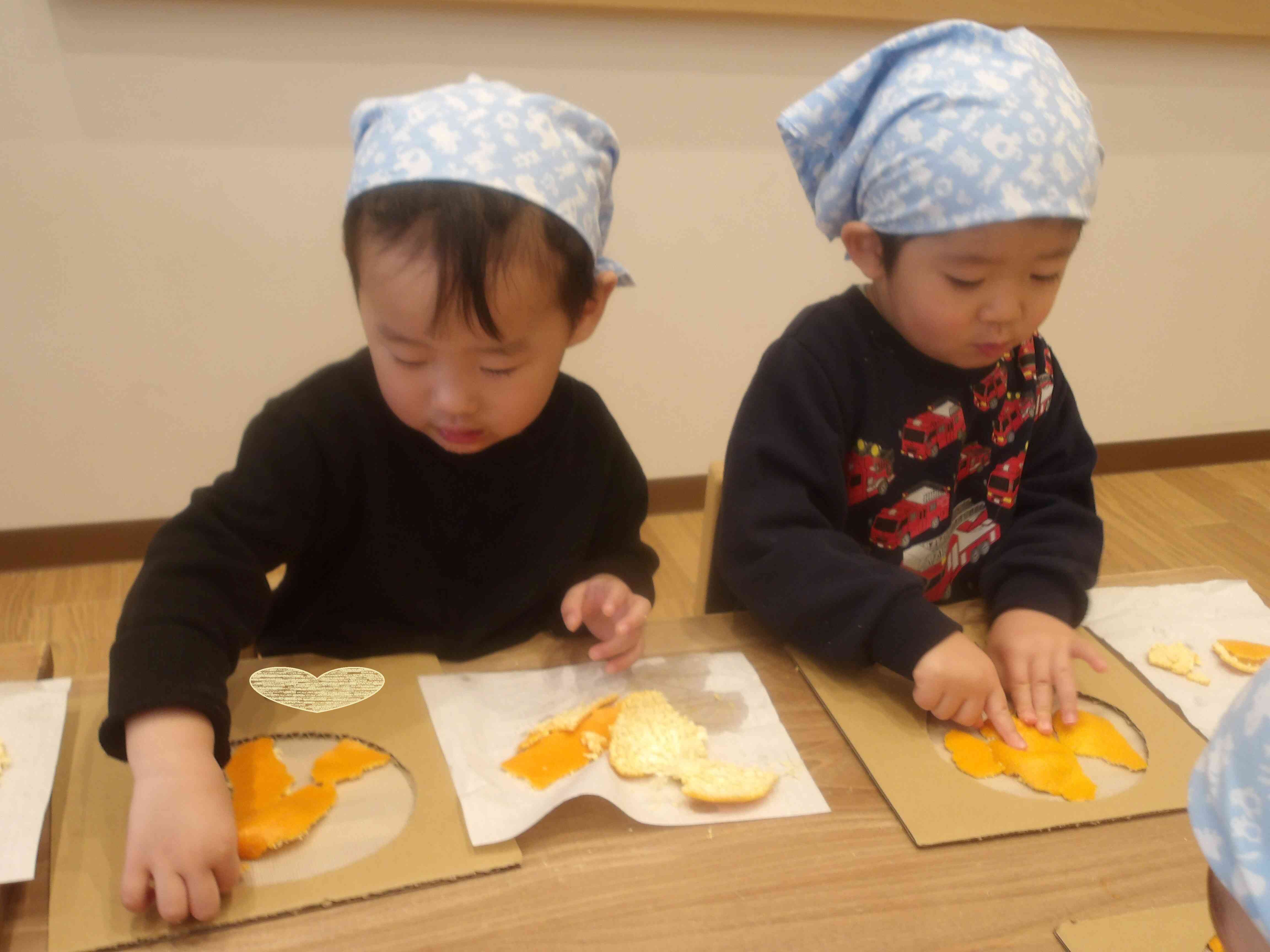 むいた皮を使ってみかんパズルを作ったよ。