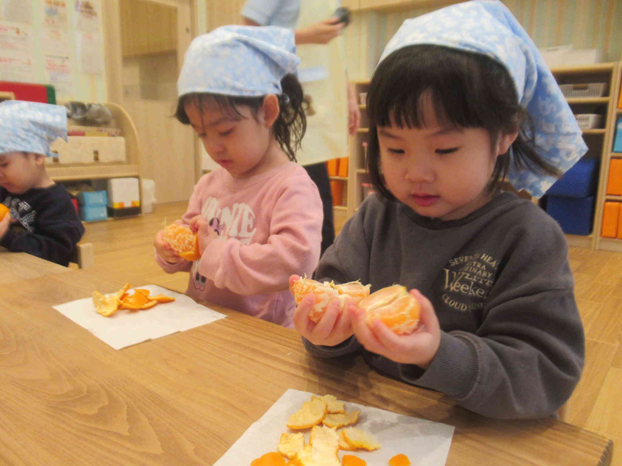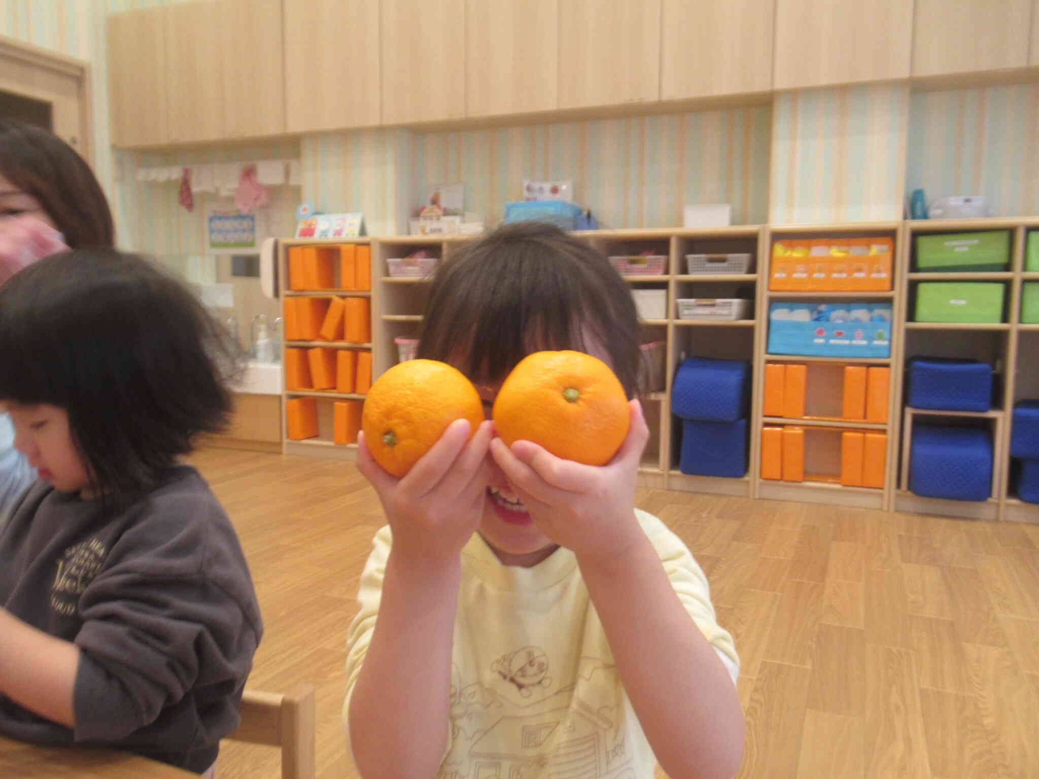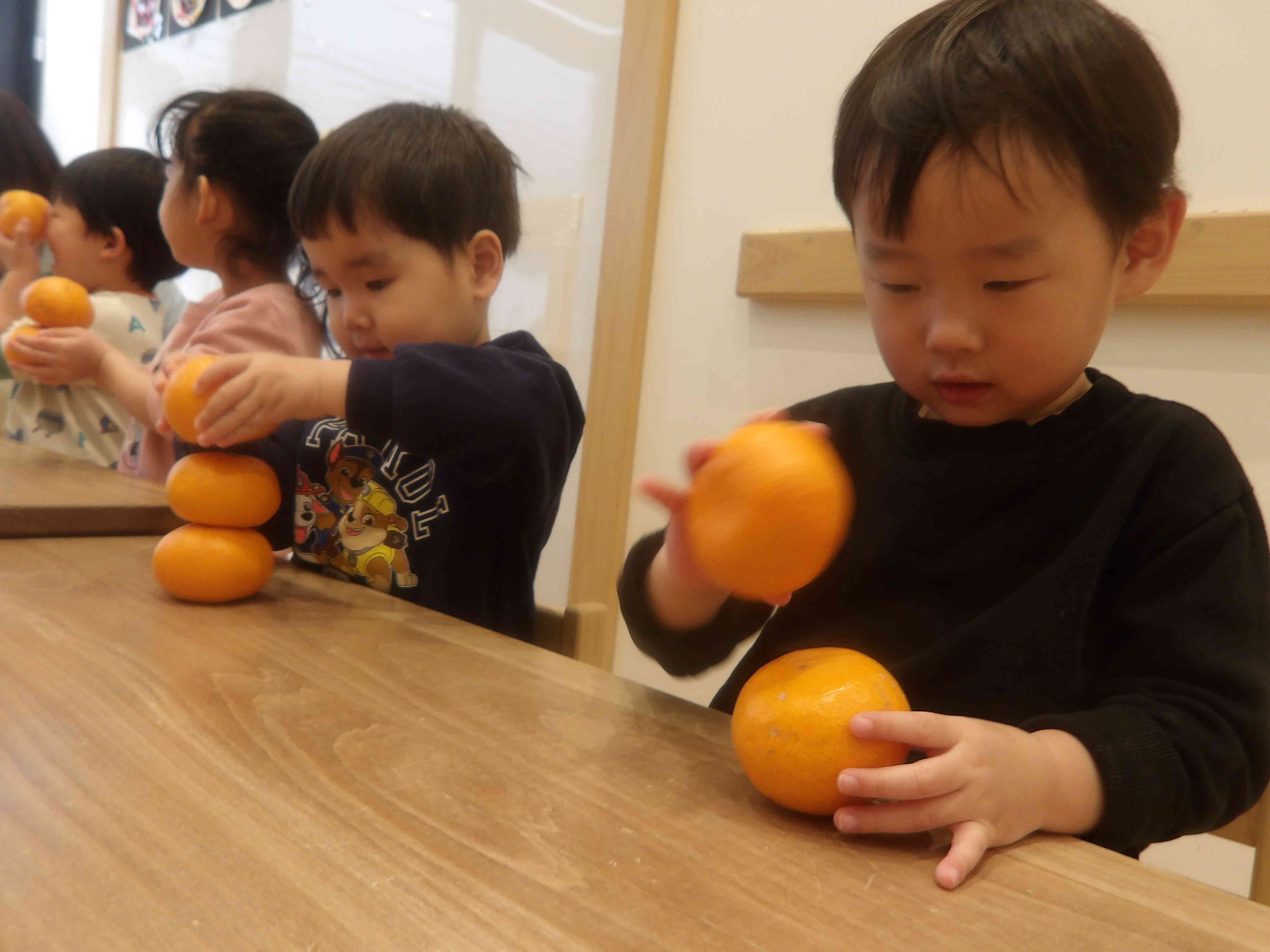 きりん組さんはボウルからみかんを取り出し上に重ねていき「みて、ゆきだるま!!」と見せてくれたり、「見て~!」と両手にみかんを持ちメガネのようにしたりして感触を楽しんでいました。