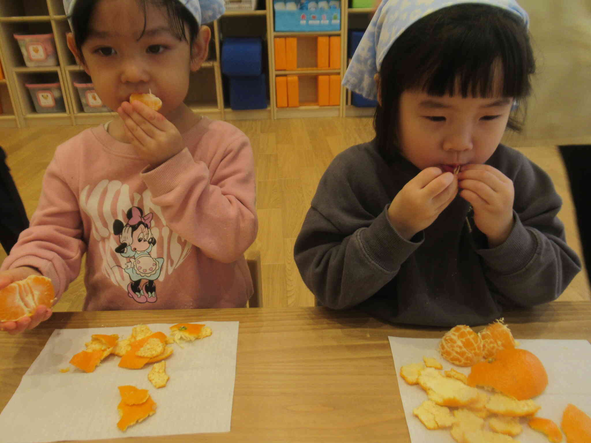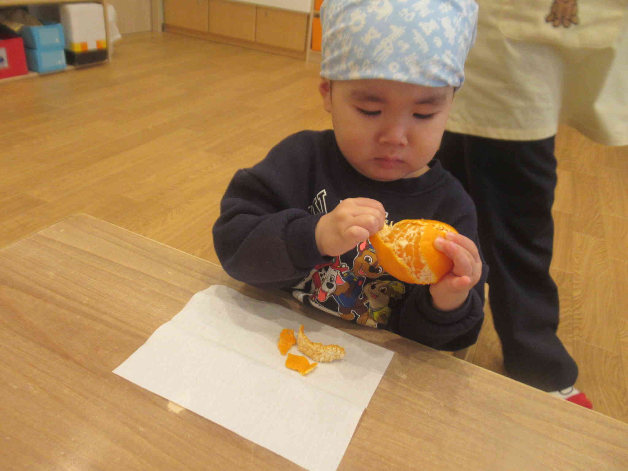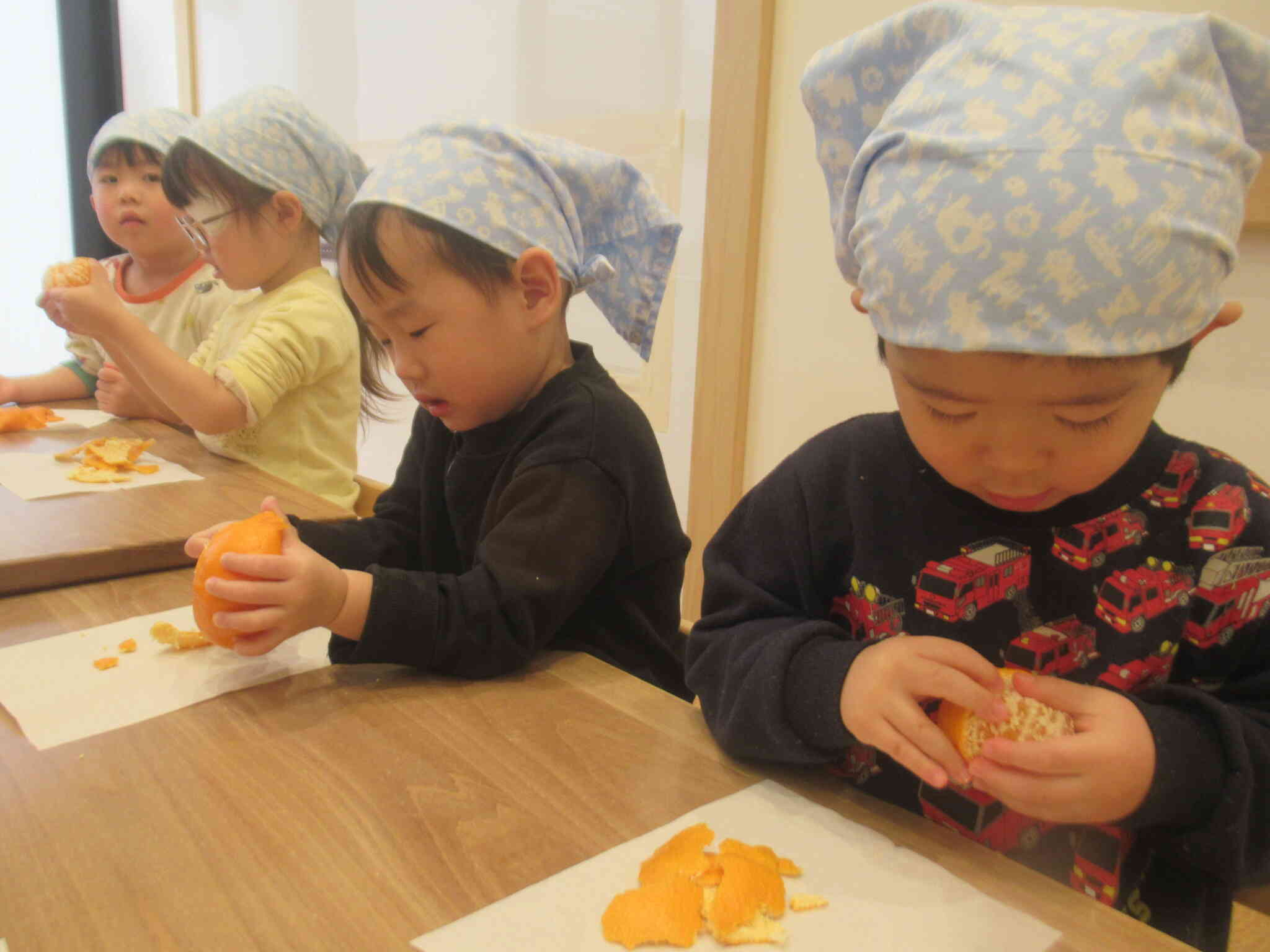きりん組さんはボウルからみかんを取り出し上に重ねていき「みて、ゆきだるま!!」と見せてくれたり、「見て~!」と両手にみかんを持ちメガネのようにしたりして感触を楽しんでいました。