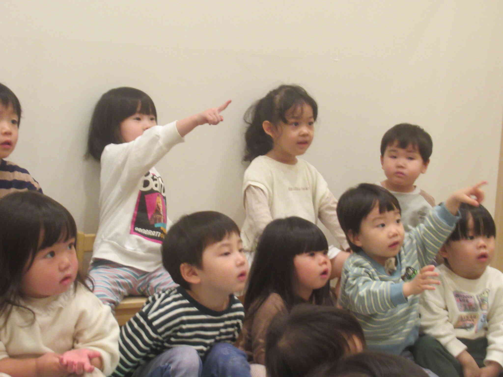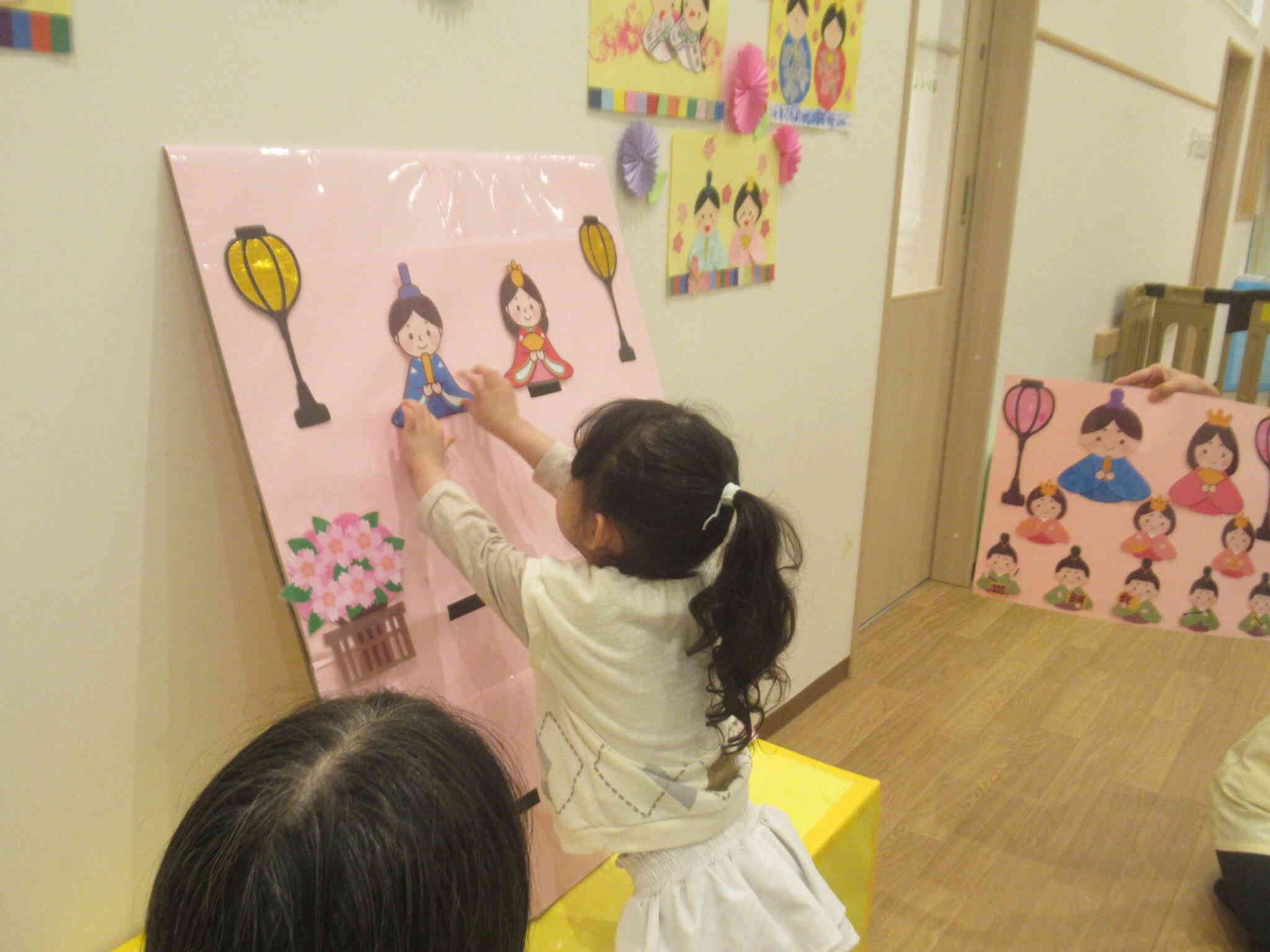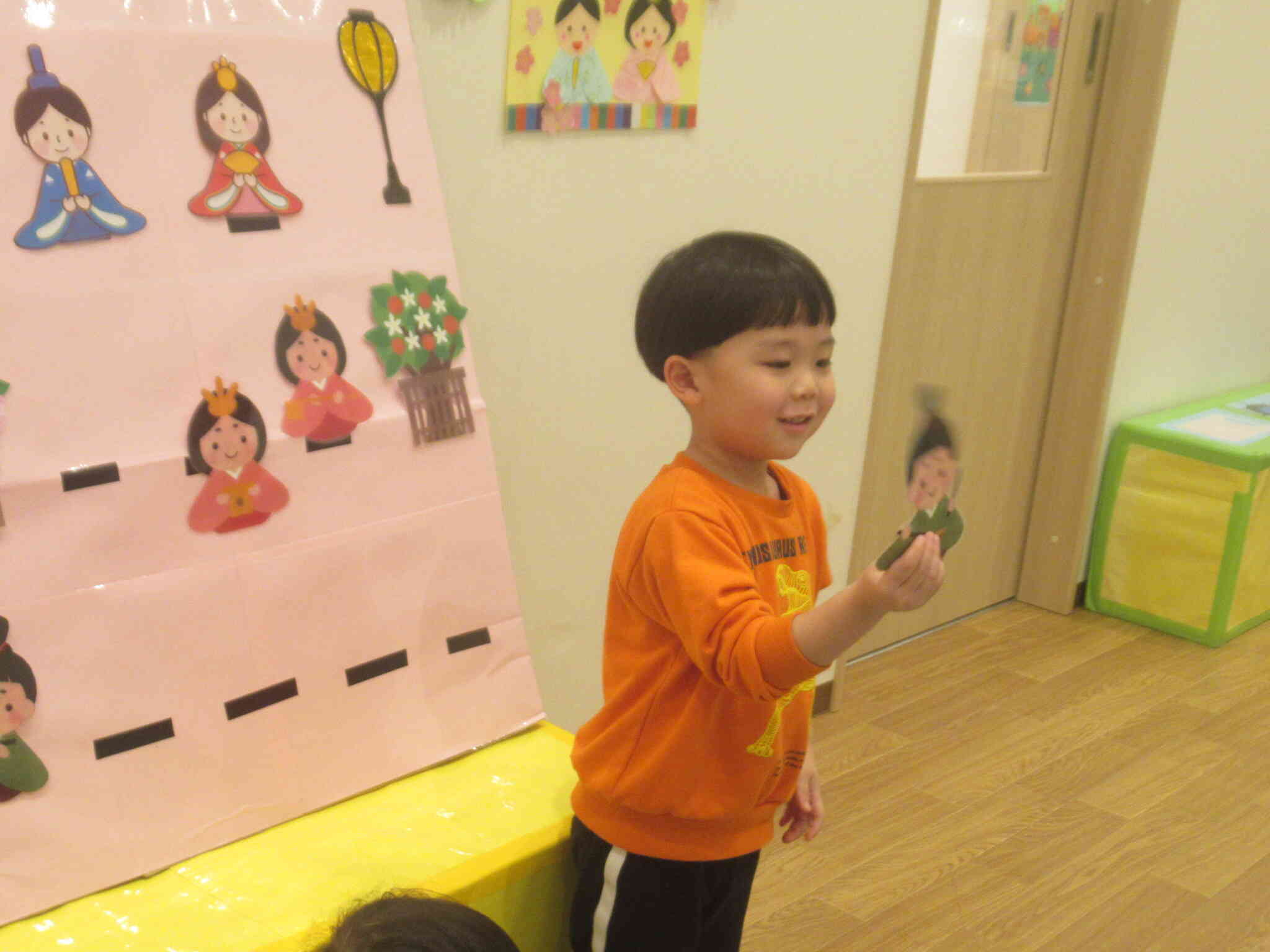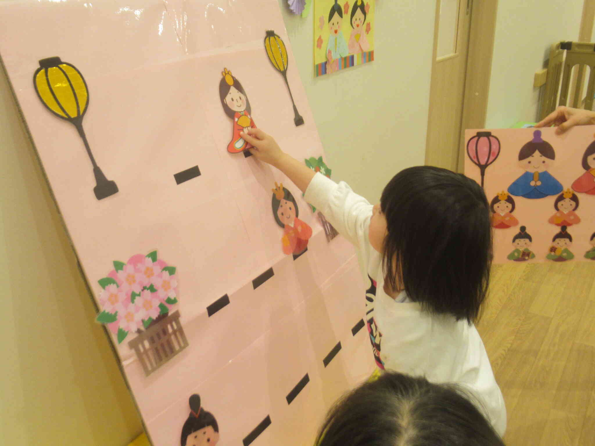 きりん組さんがひな人形のカードを引いてひな壇に飾っていきます。