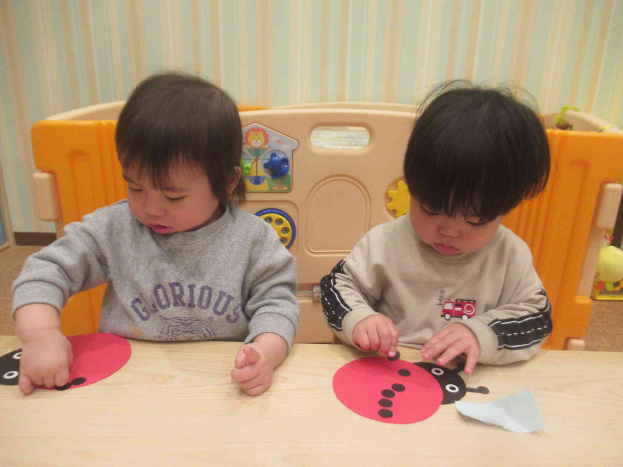 大きなテントウムシに黒シールで模様を付けていきます。