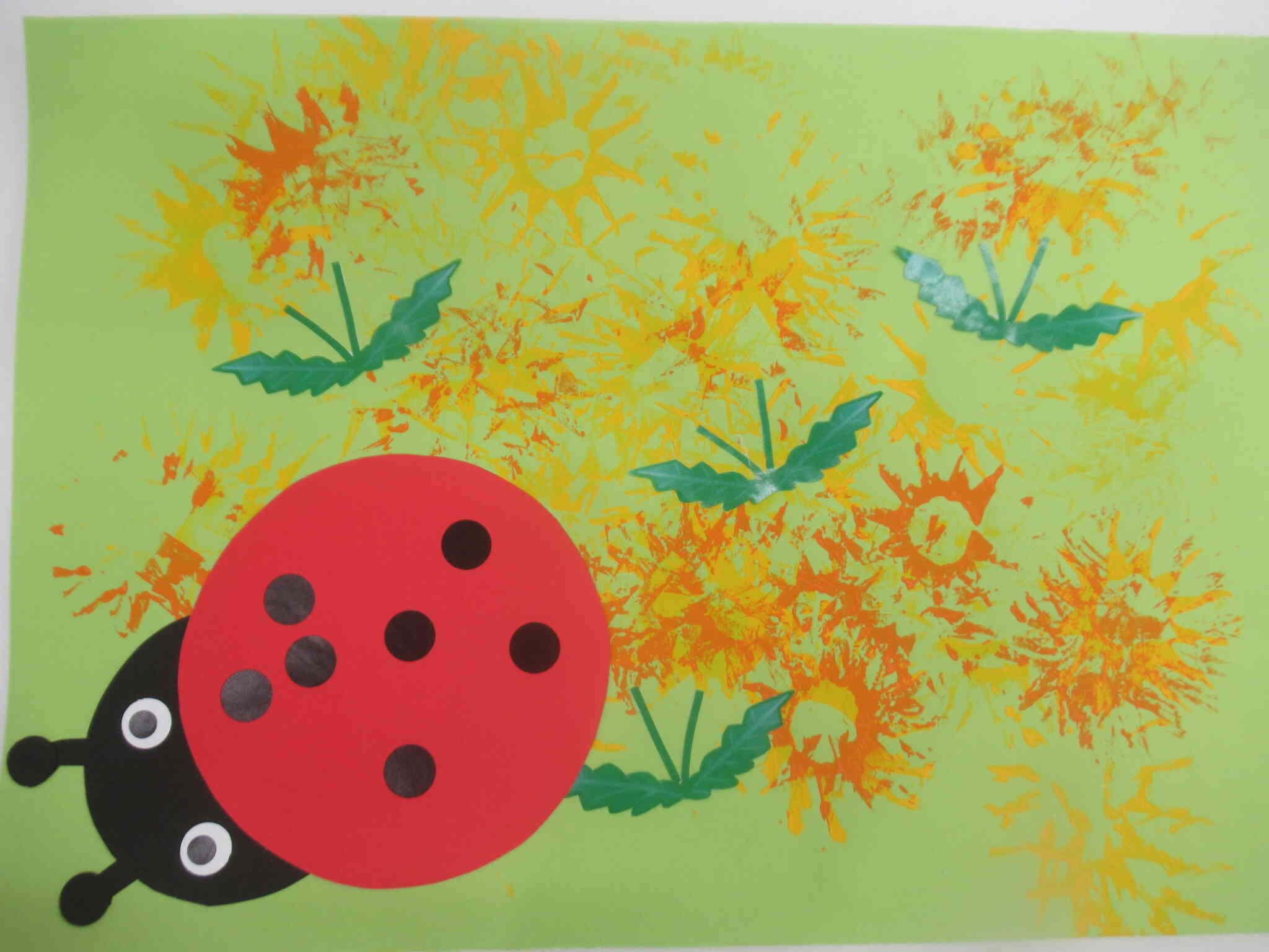 ぱんだ組さんは画用紙に黄色とオレンジの絵の具を使ってタンポポをスタンプしました。