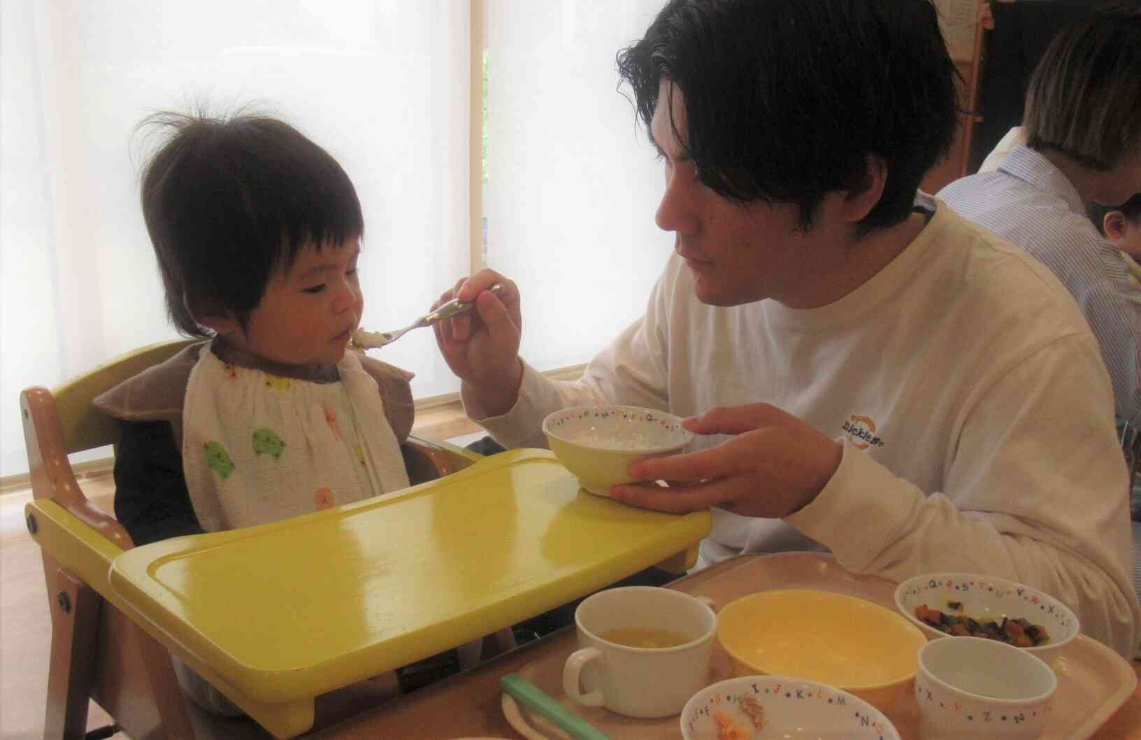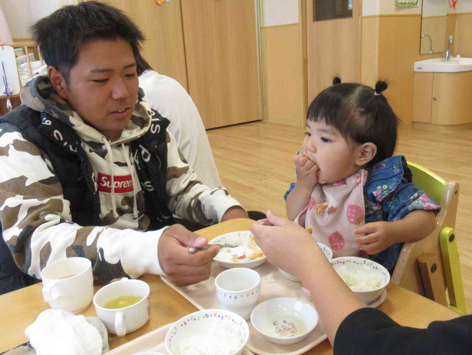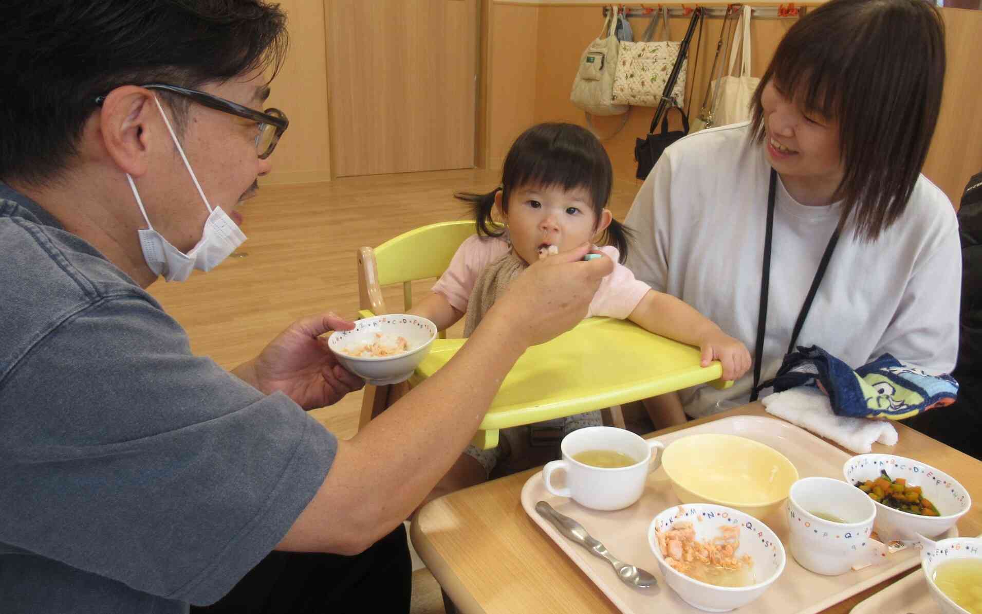 自分でスプーンを持って食べてみようとしたり、お汁椀をしっかりと持って飲んだり、よく噛んで食べられるところをたっぷりと見てもらいました。