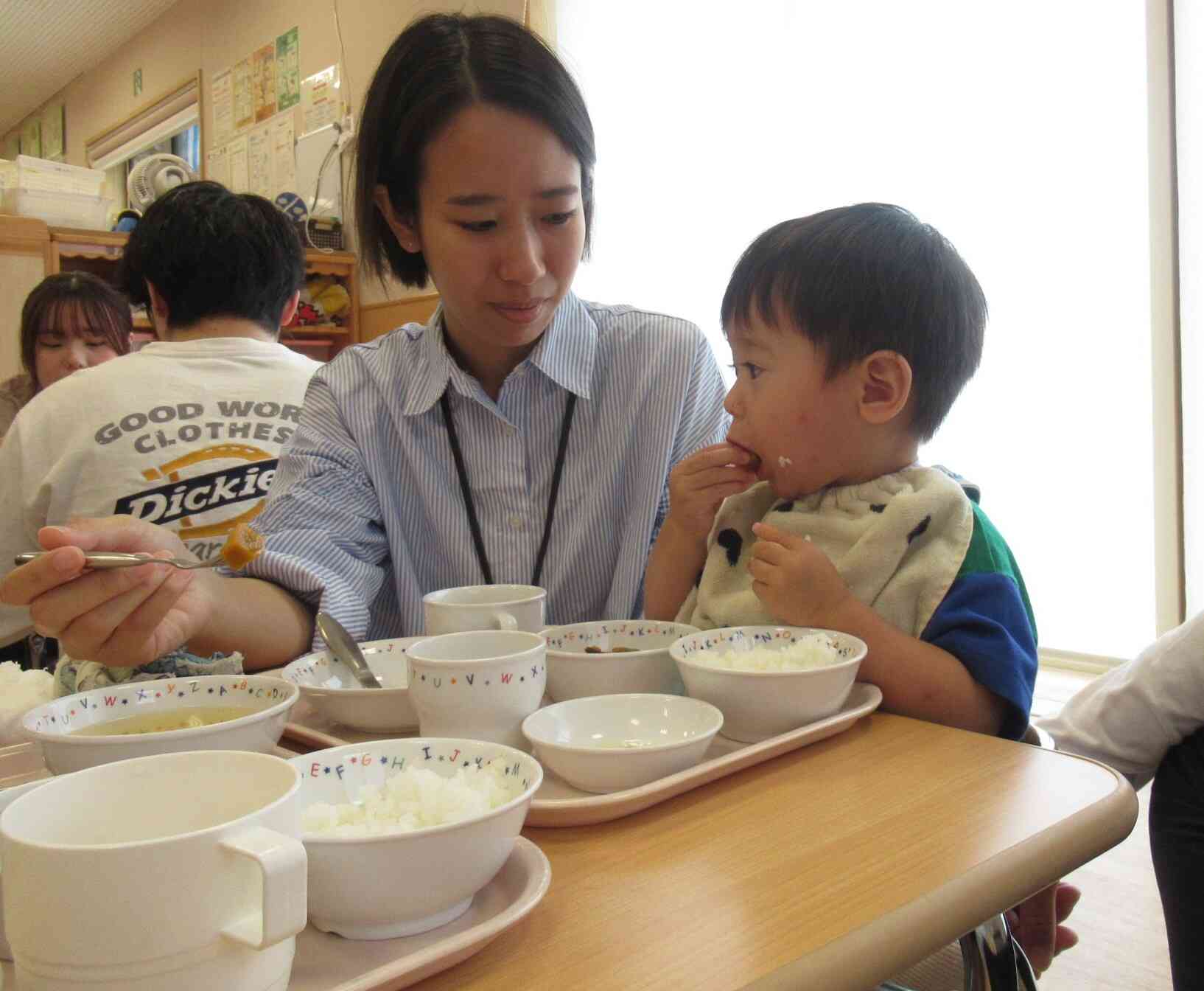 そしてお昼が近づき、オムツを替えてもらってスッキリ!お楽しみの給食を待ちます。