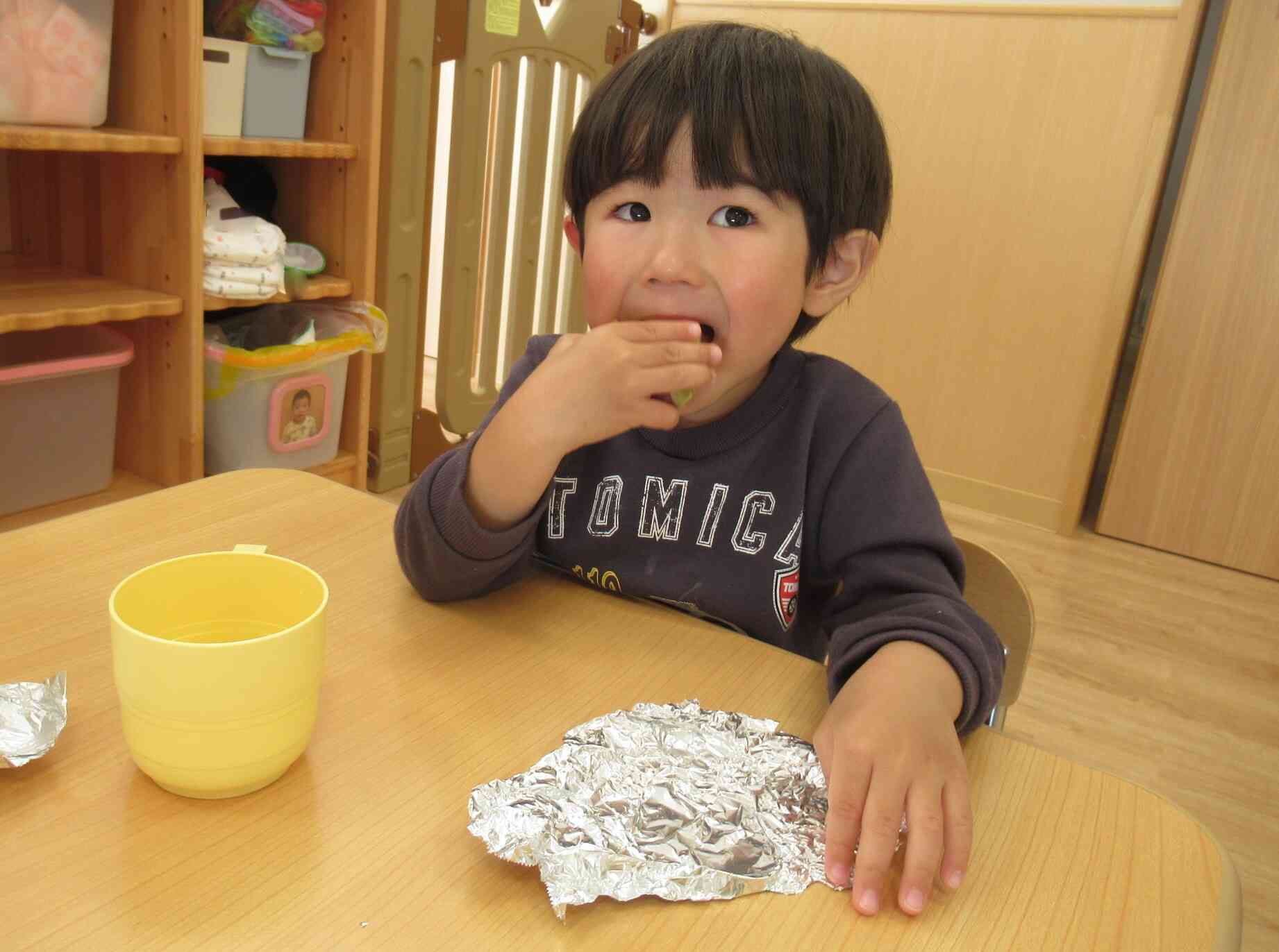さつまいもを焼いている間、「やきいもグーチーパー」の手あそびをしました。みんなで歌って最後は「勝った!」「あいこだった~」とじゃんけんも楽しんでいました。