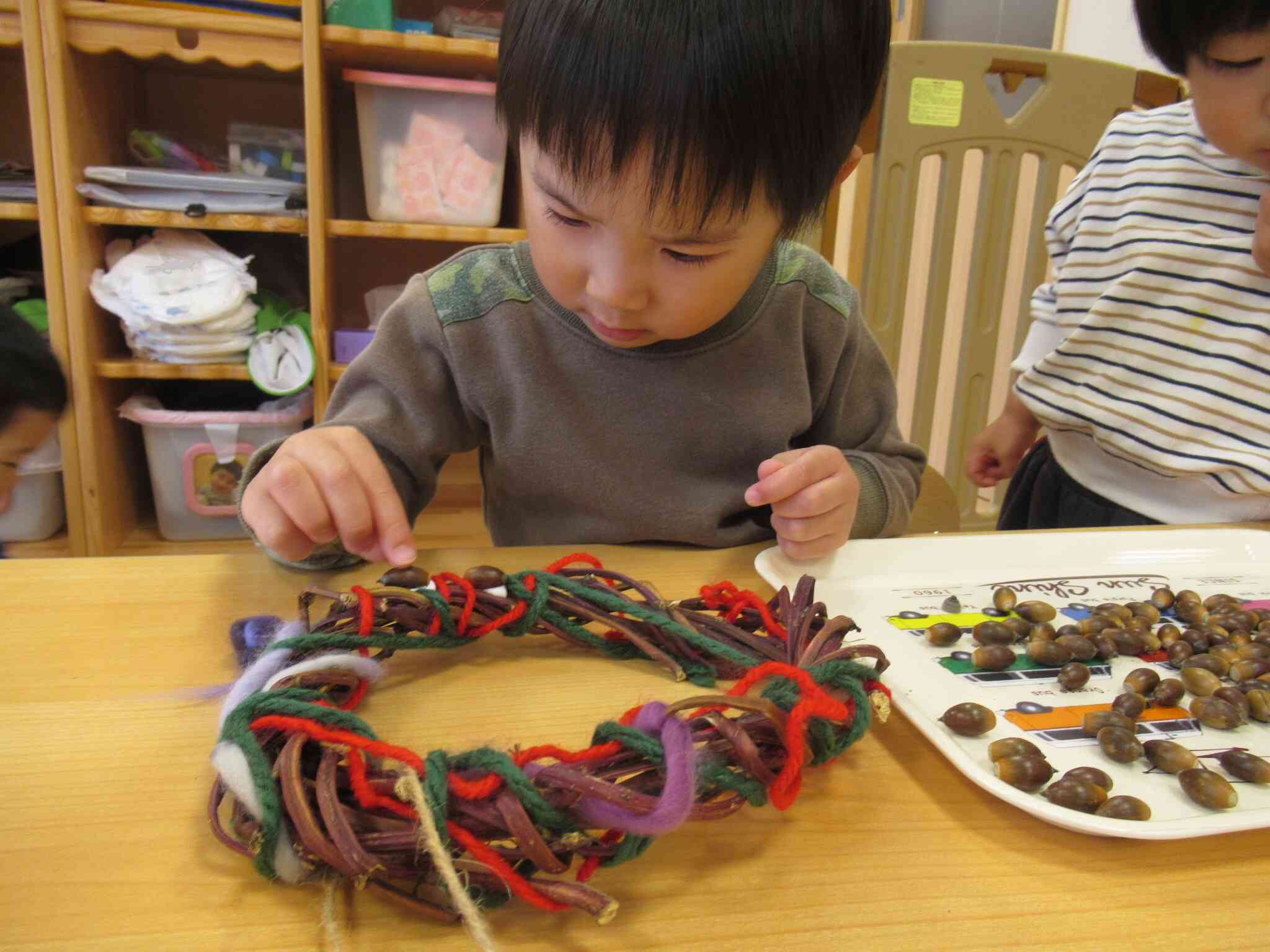 巻きあがったリースに、公園で拾い集めたドングリをボンドでつけました。
